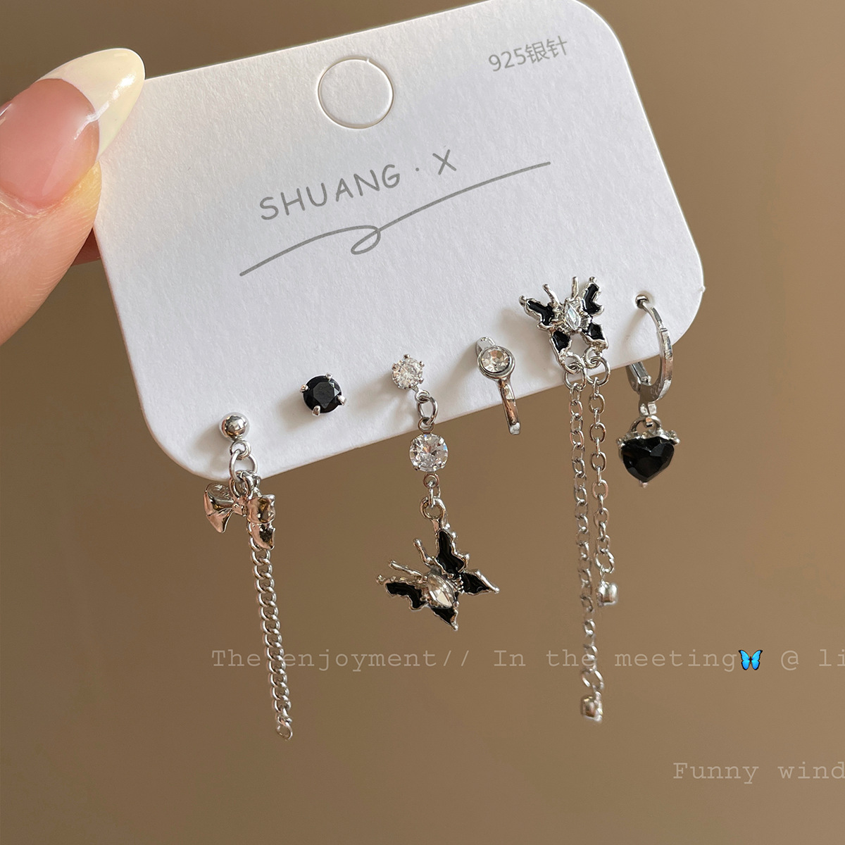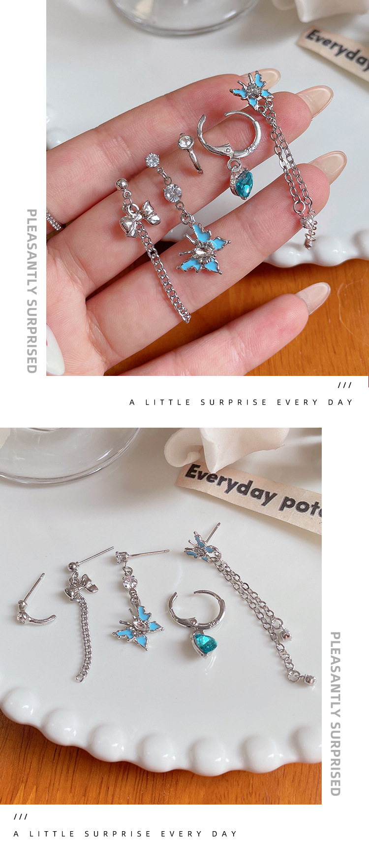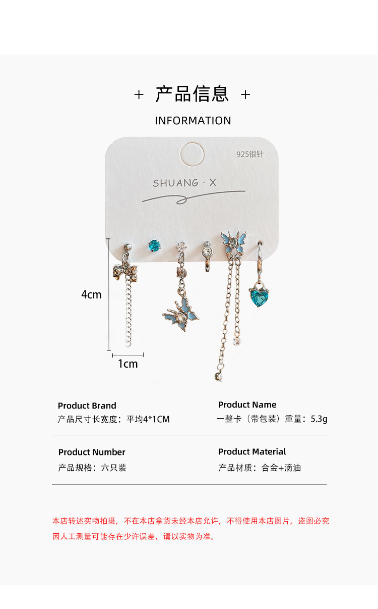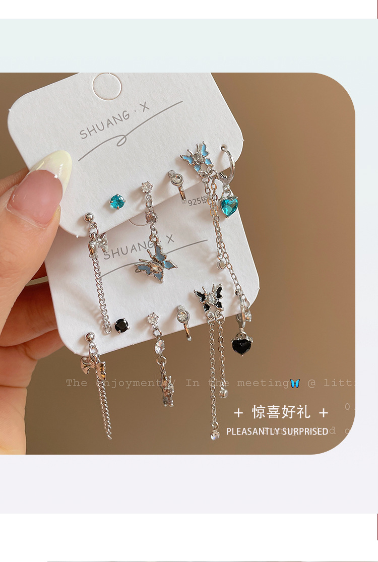 春季蓝蝴蝶少女耳扣套装银针个性小众新款甜酷不对称气质流苏耳环