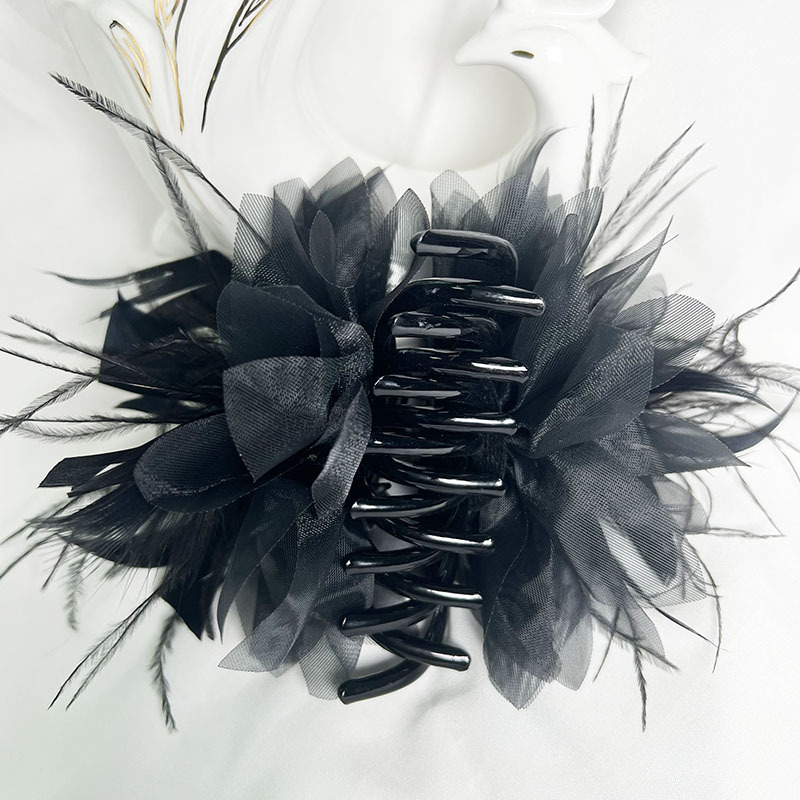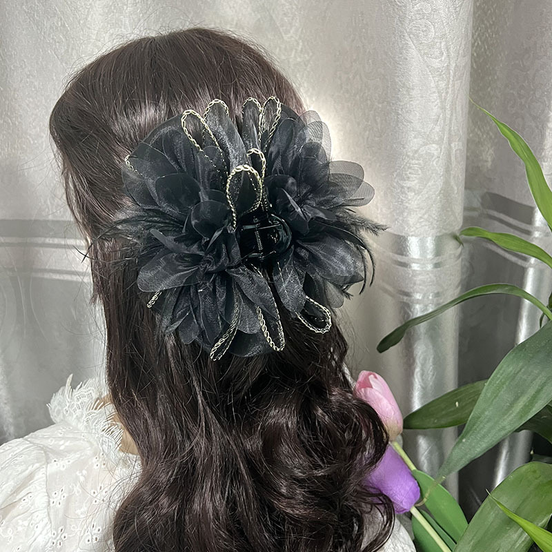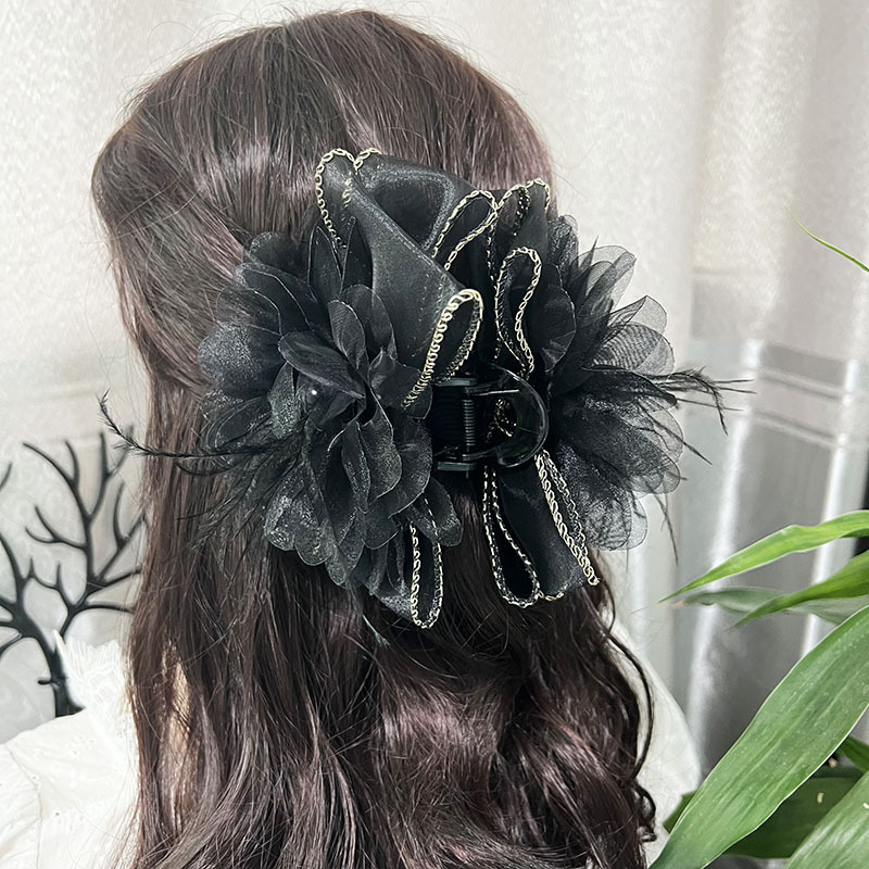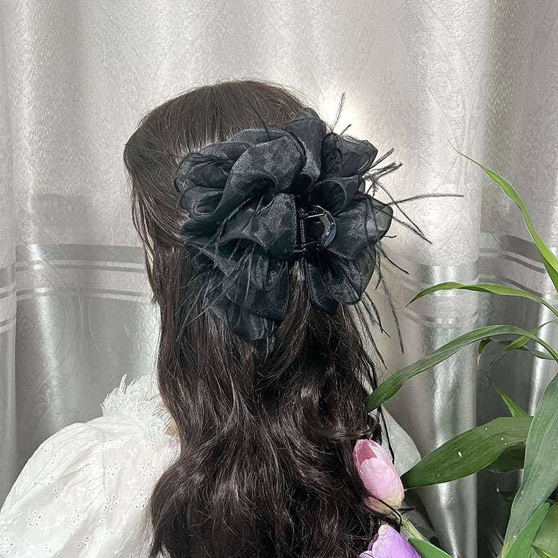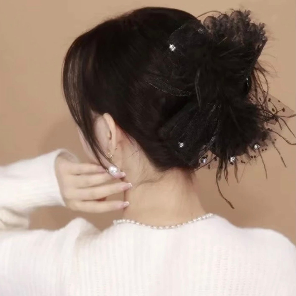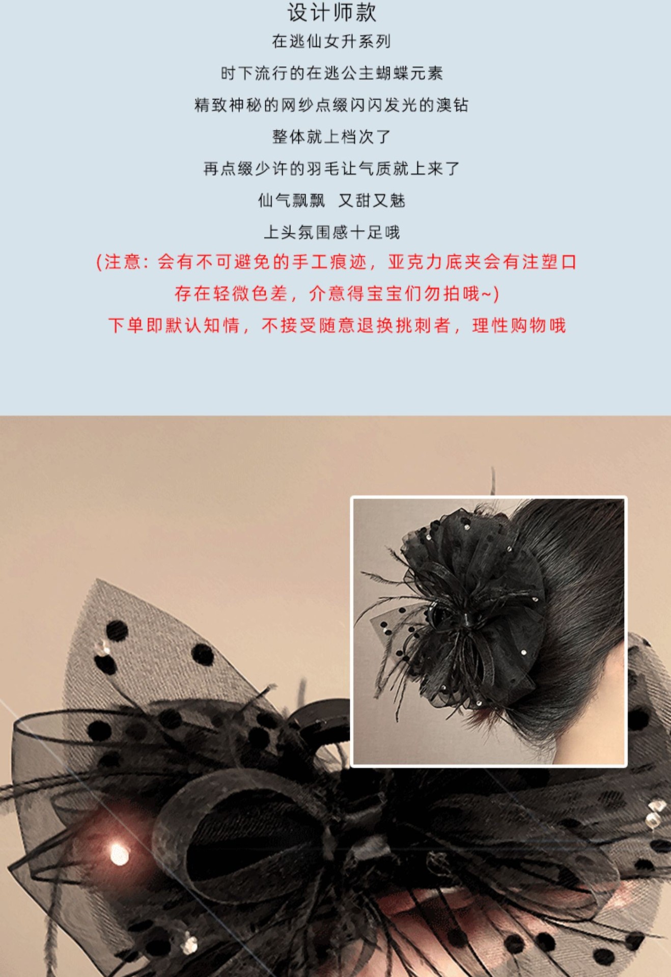 大号13cm双面羽毛发夹蝴蝶结抓夹网纱公主头显发量盘发半扎头饰