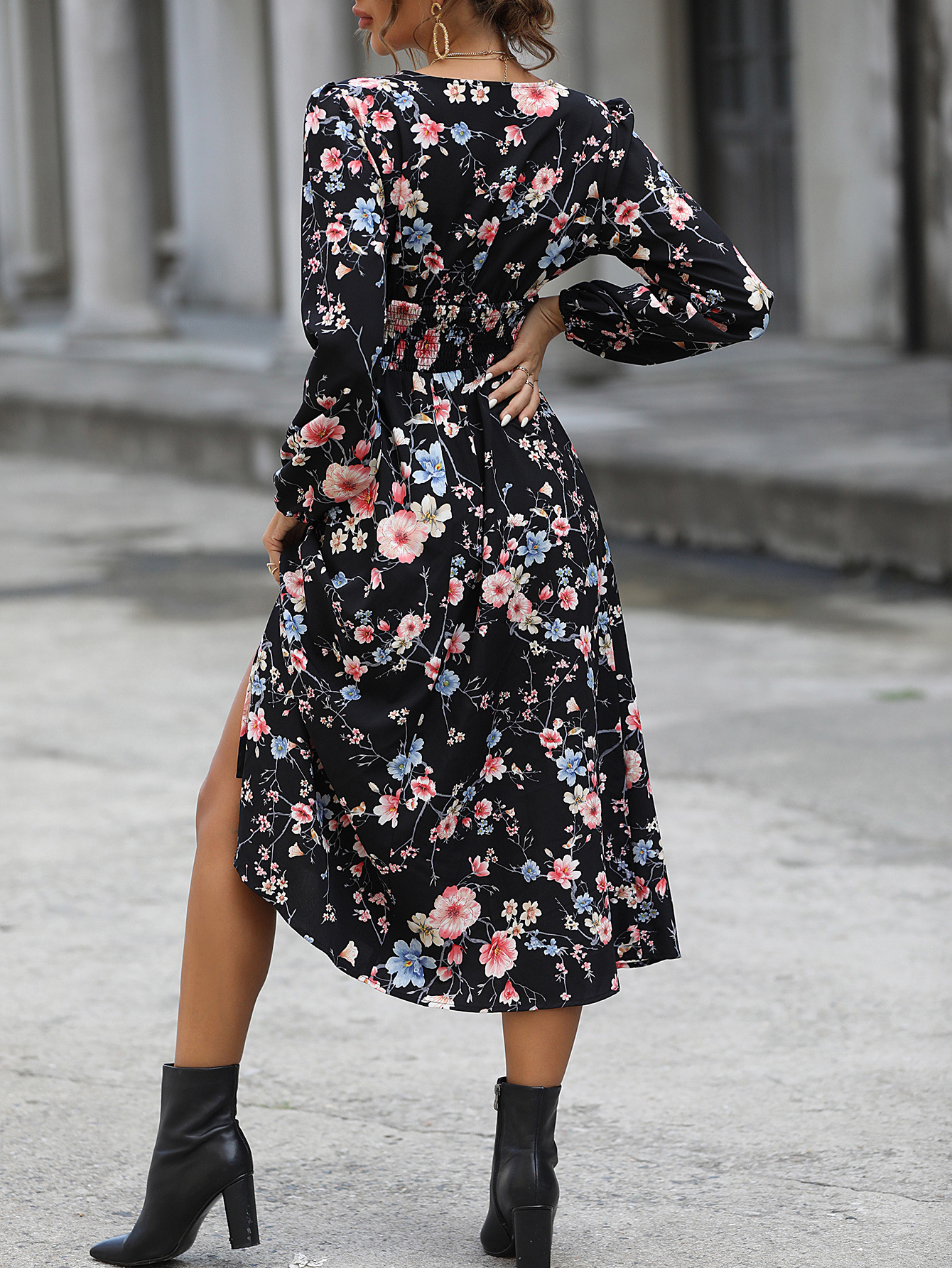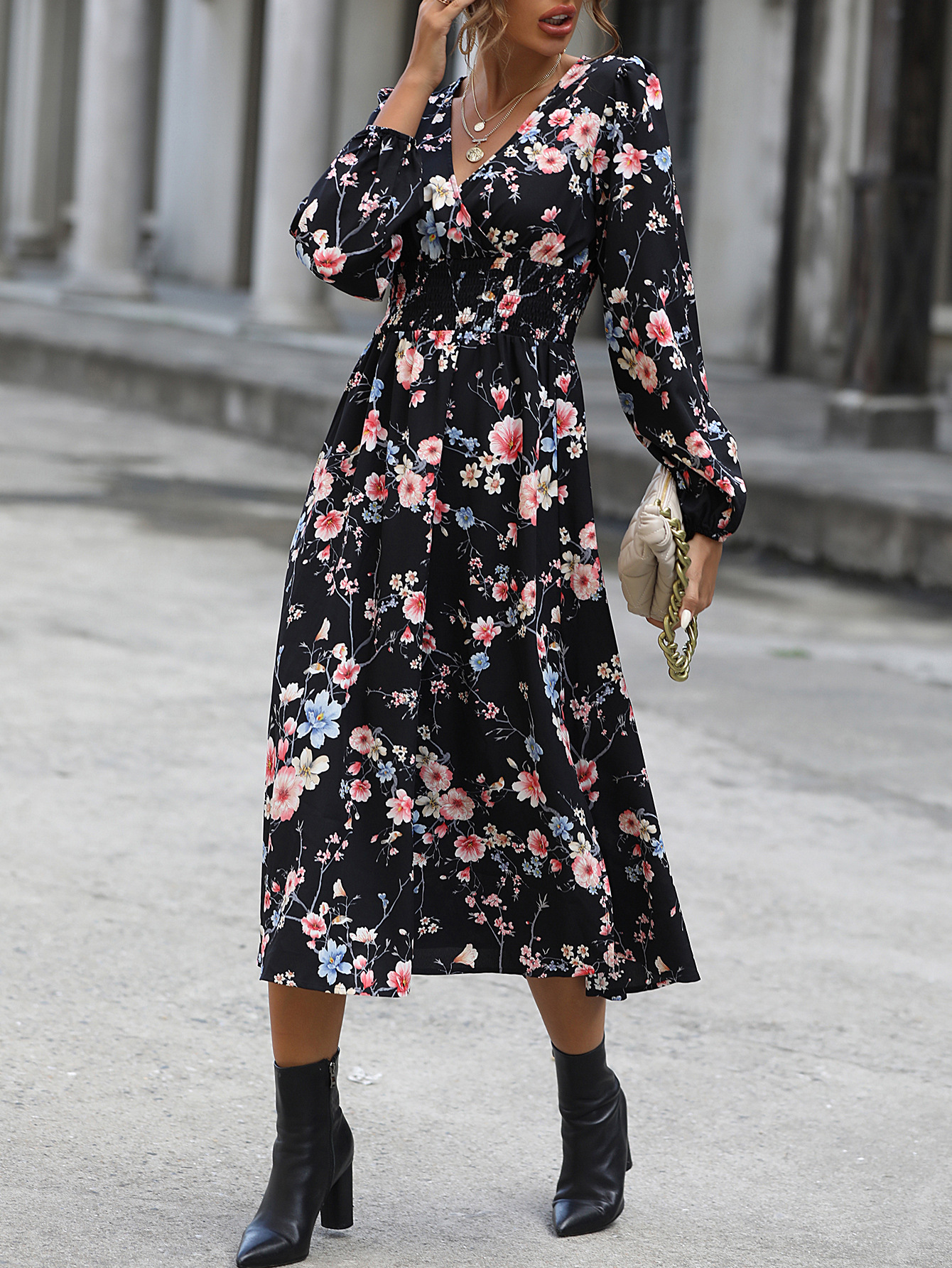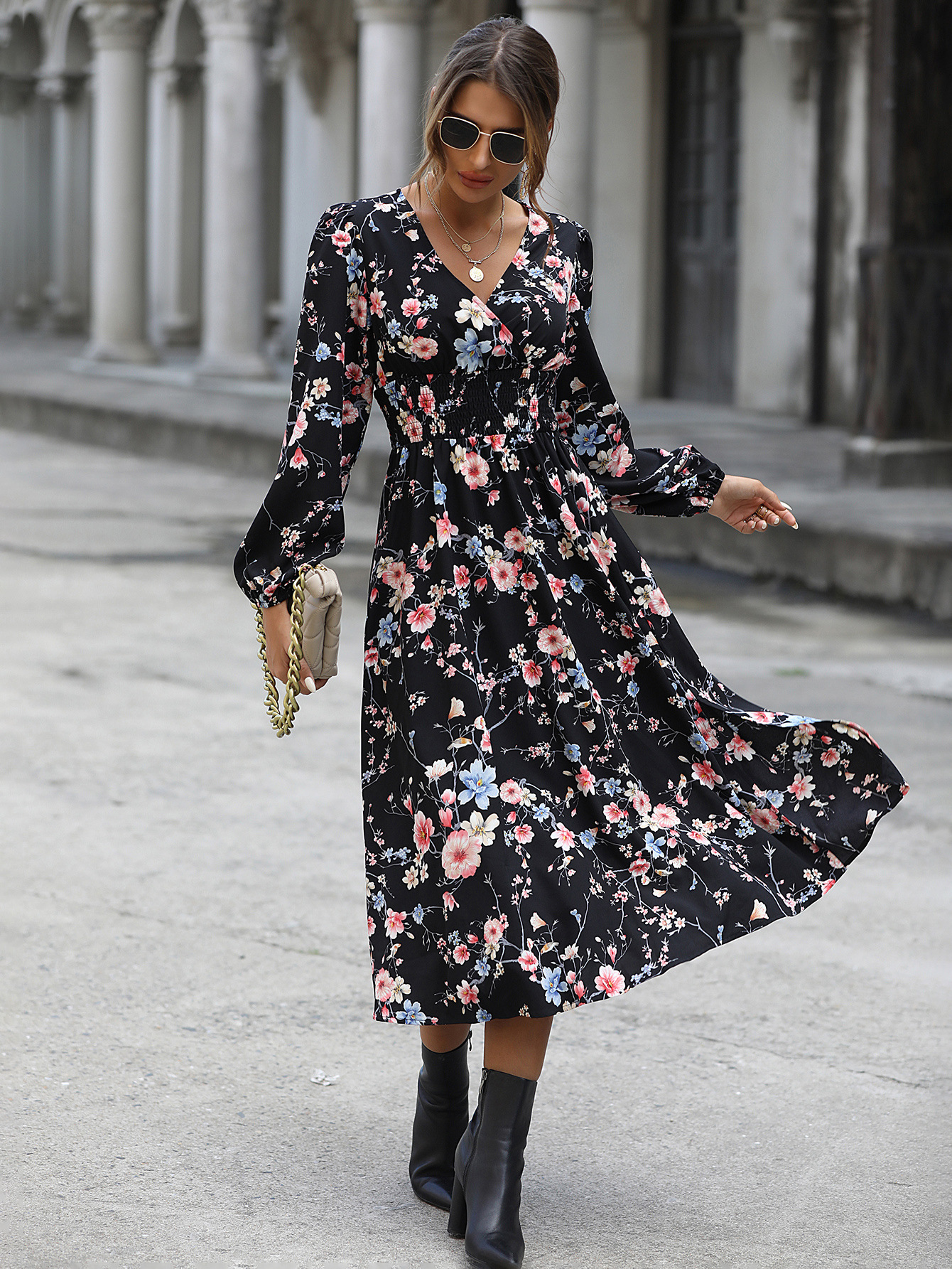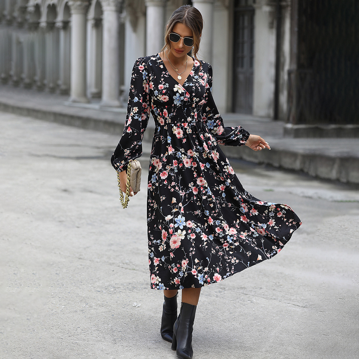 自主研发实拍 速卖通亚马逊热卖2023年春秋女士长款碎花v领连衣裙