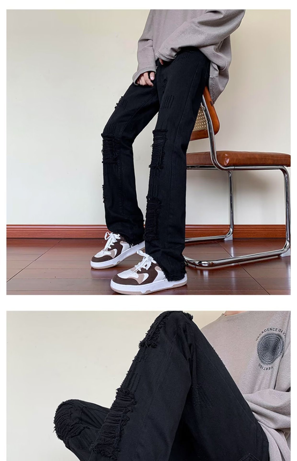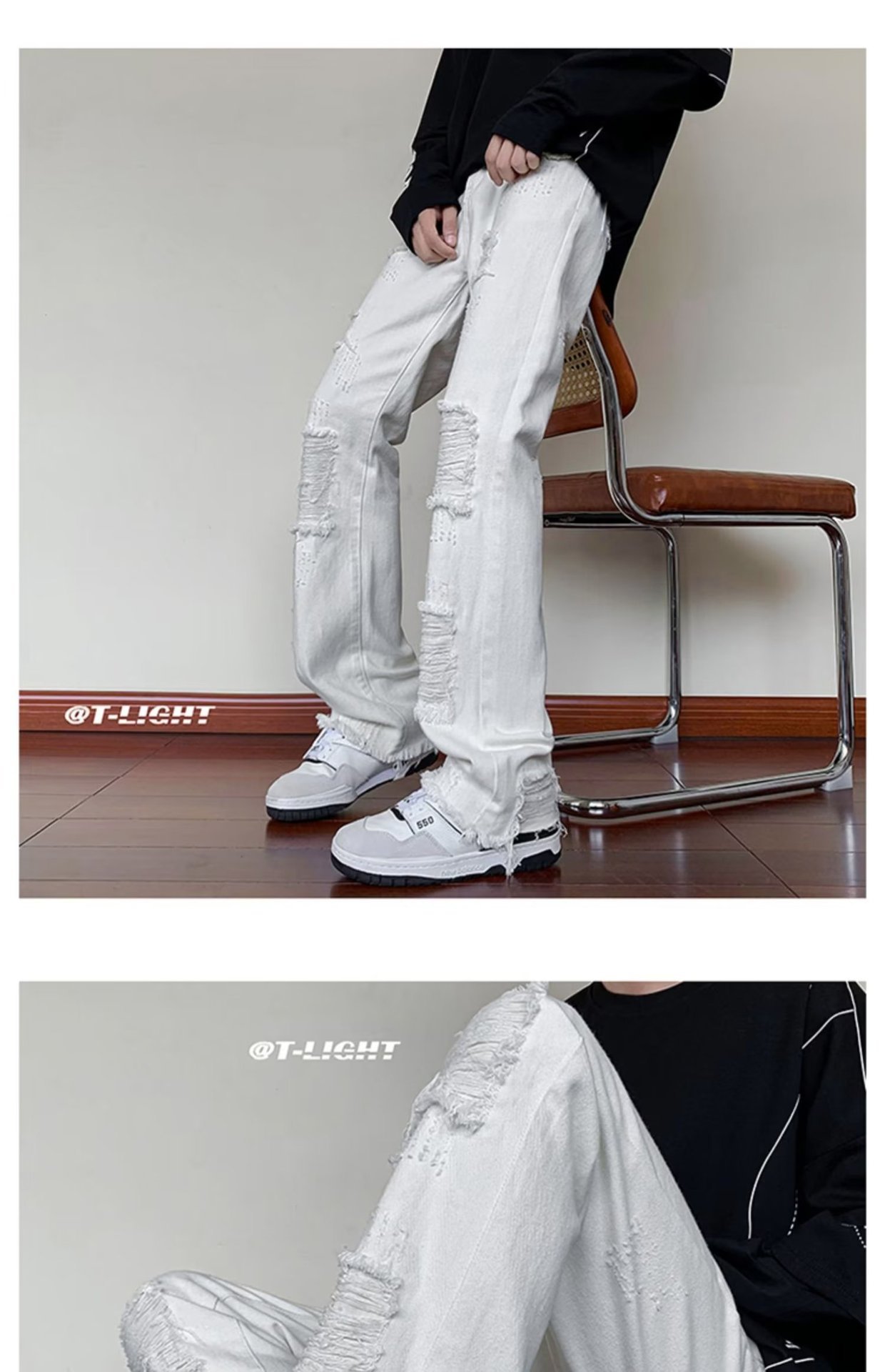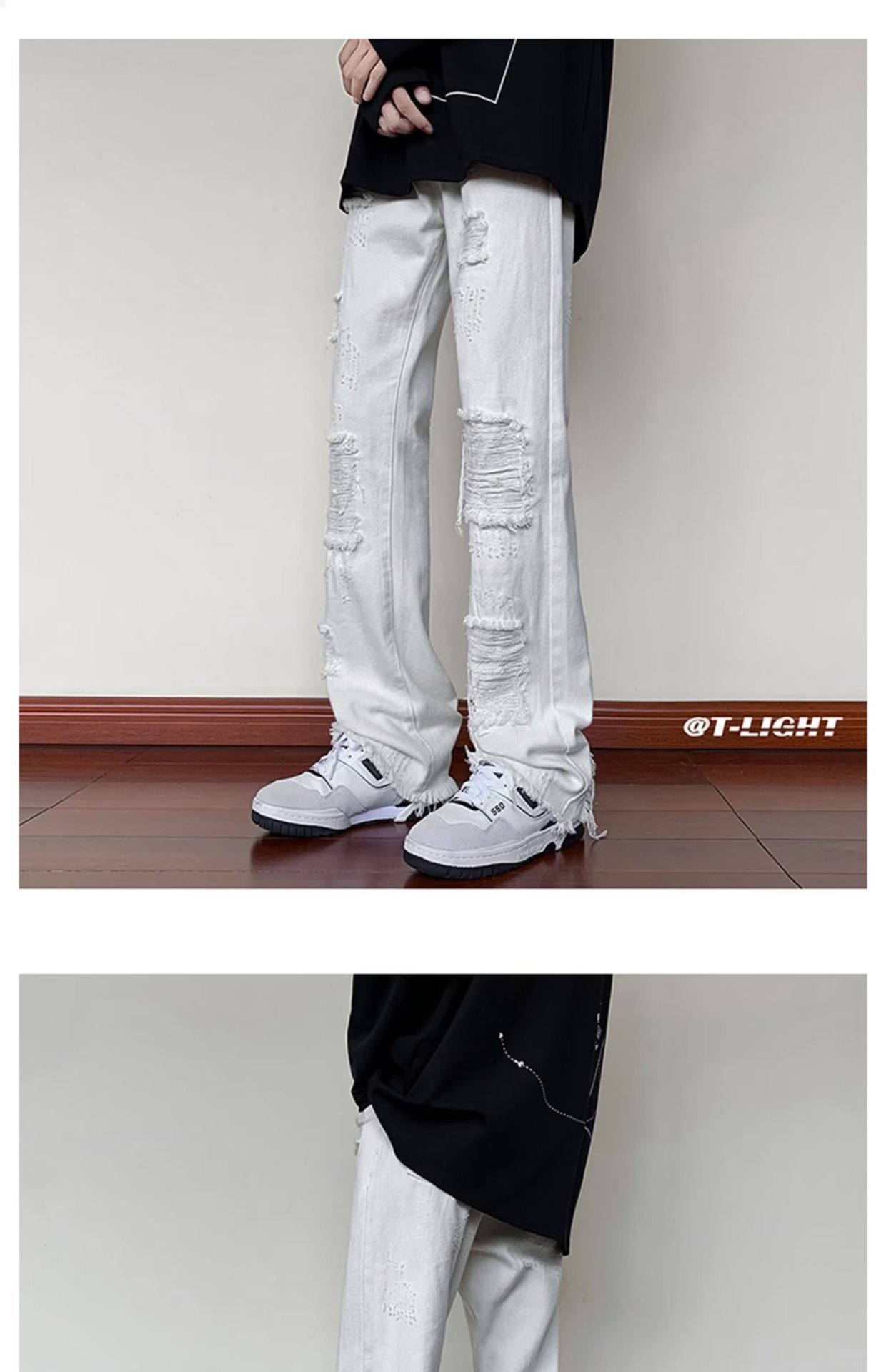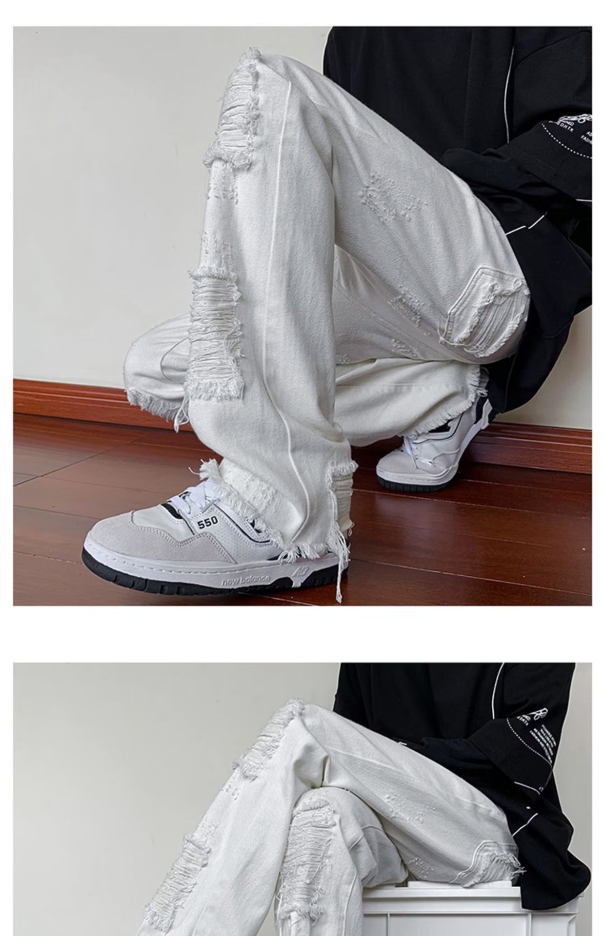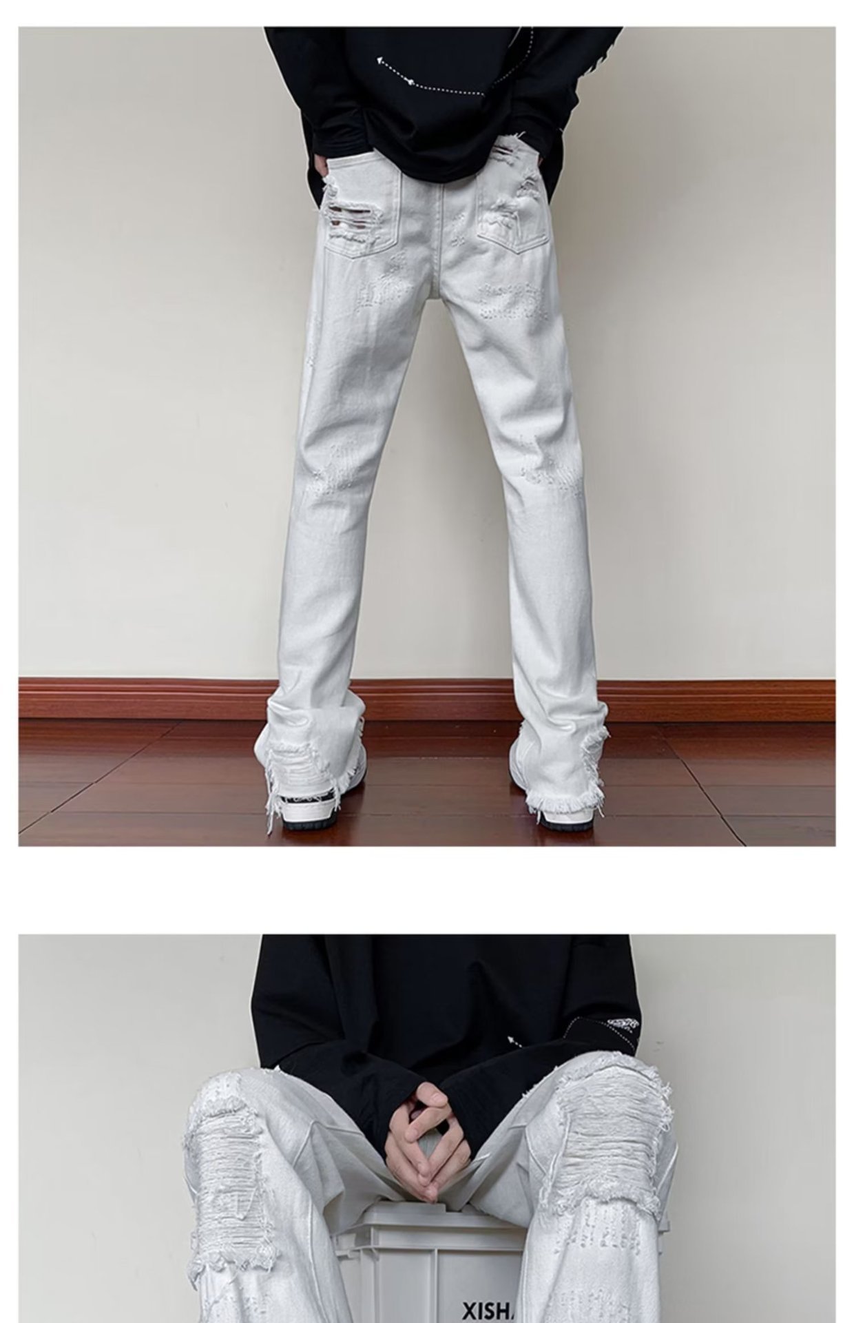 2023破洞毛边微喇牛仔裤男夏季美式潮牌vibe风裤子高级感修身显瘦