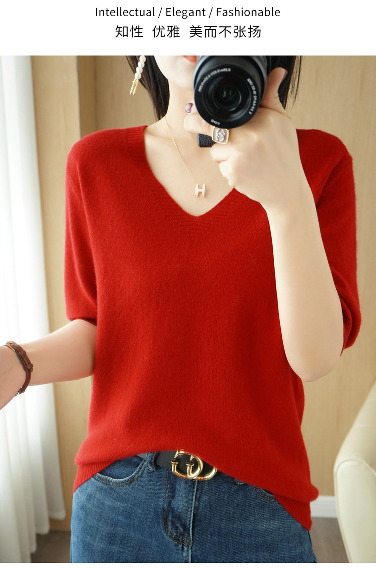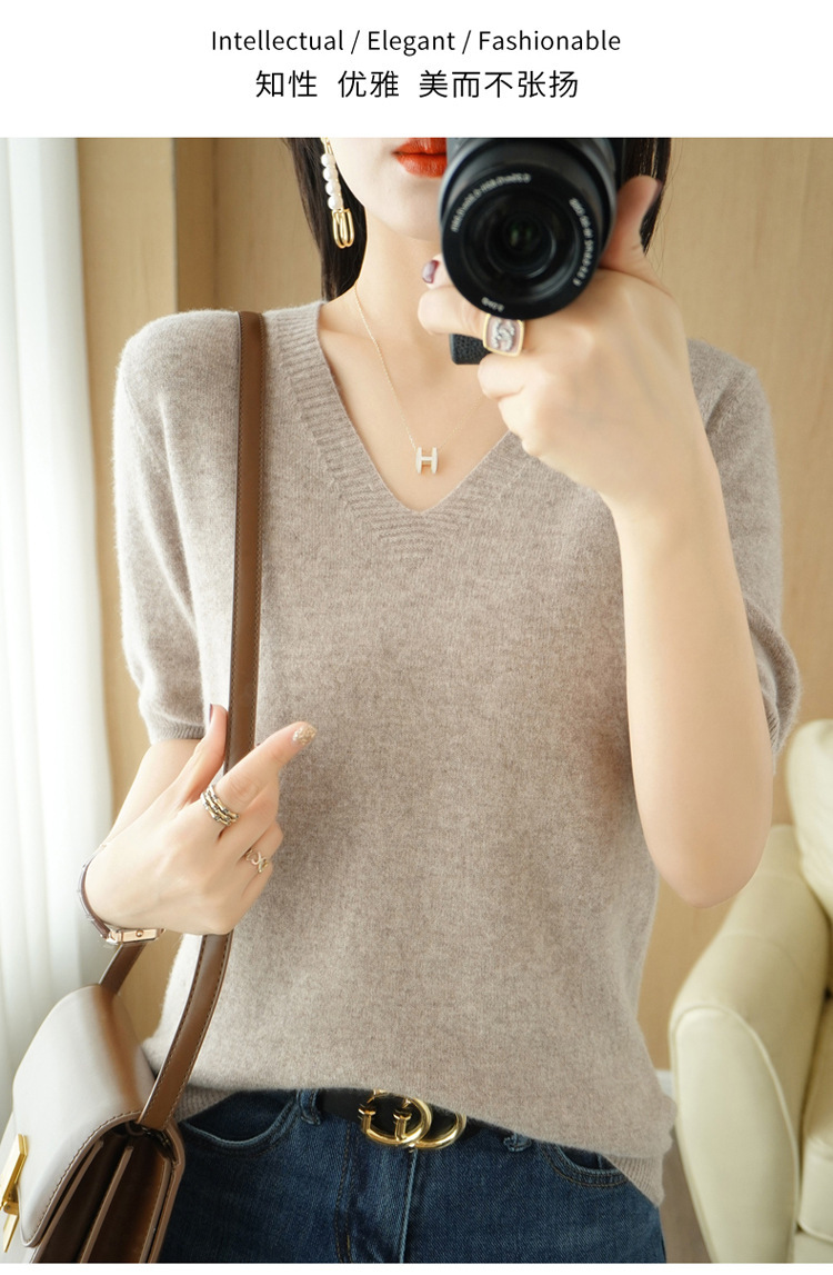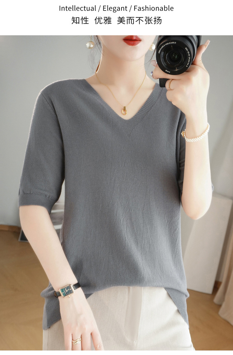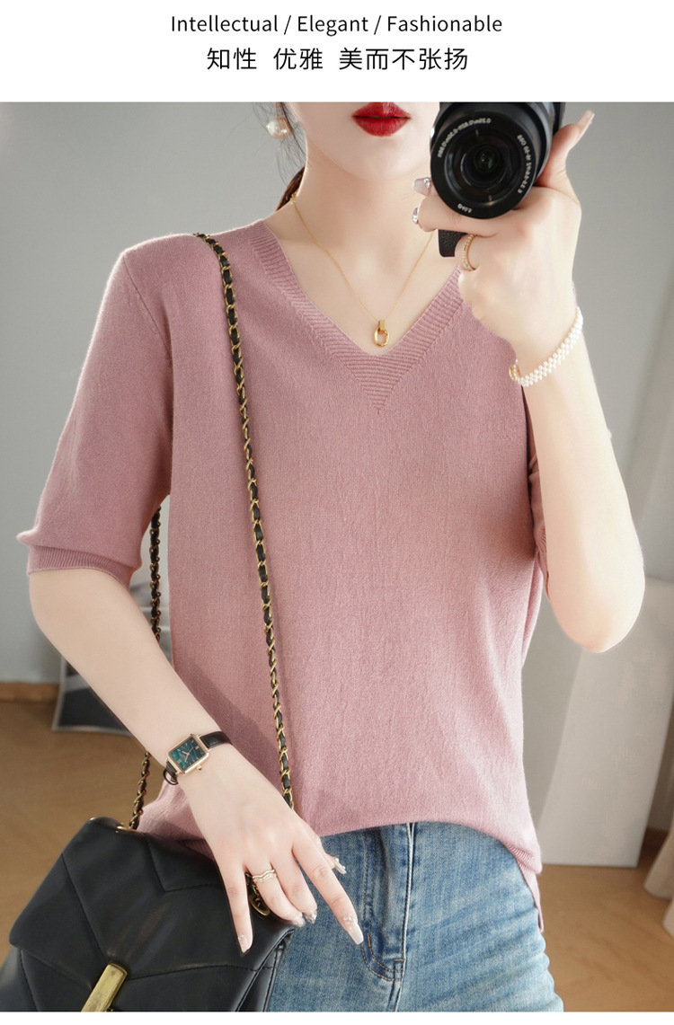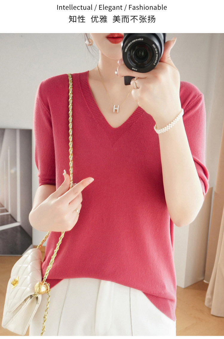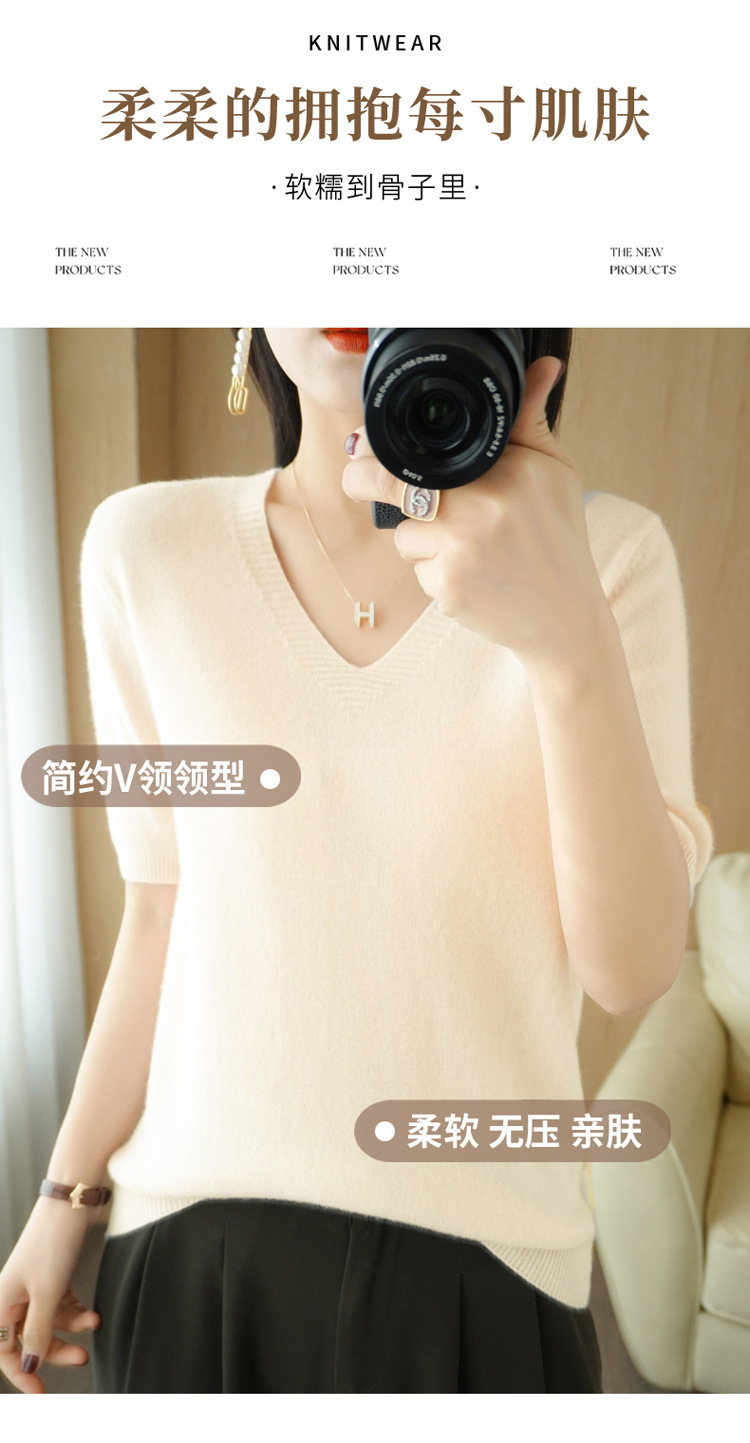 2023年春秋新款针织短袖女V领打底针织套头半袖毛衣宽松打底毛衫
