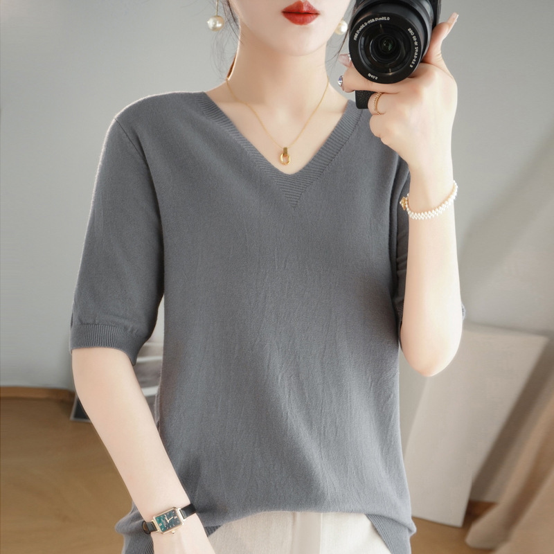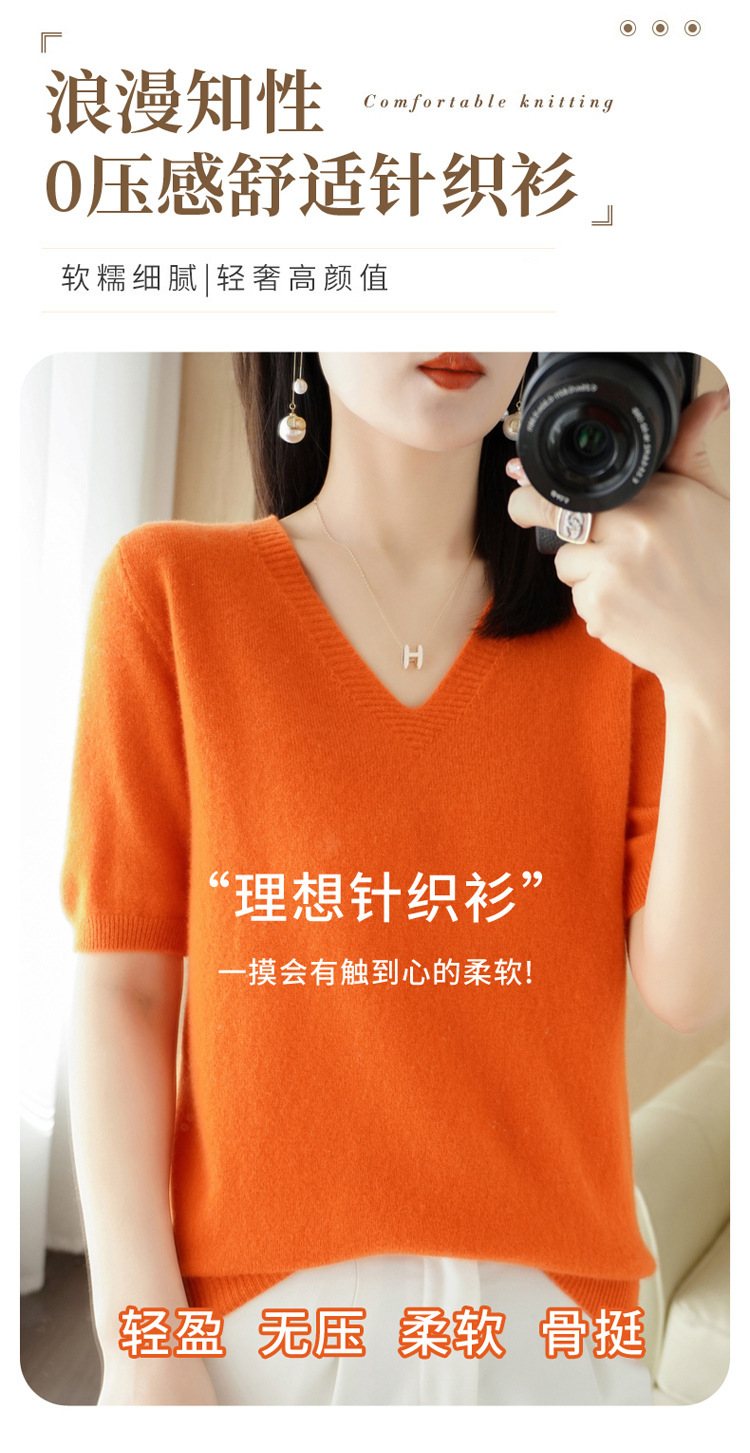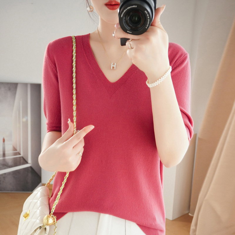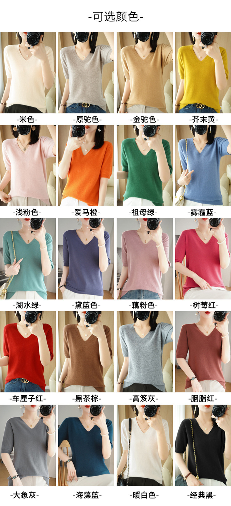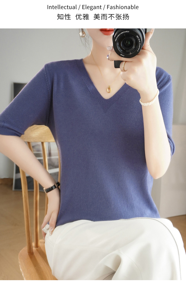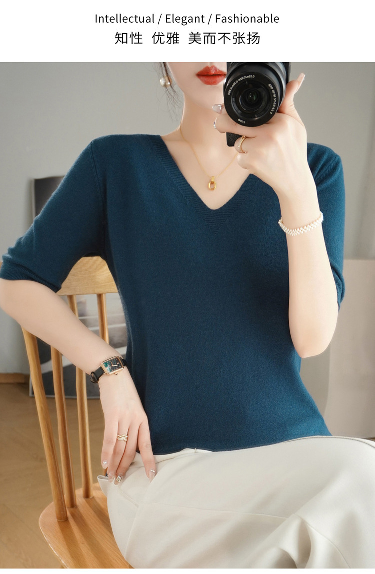 2023年春秋新款针织短袖女V领打底针织套头半袖毛衣宽松打底毛衫