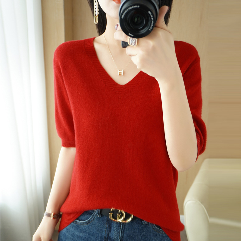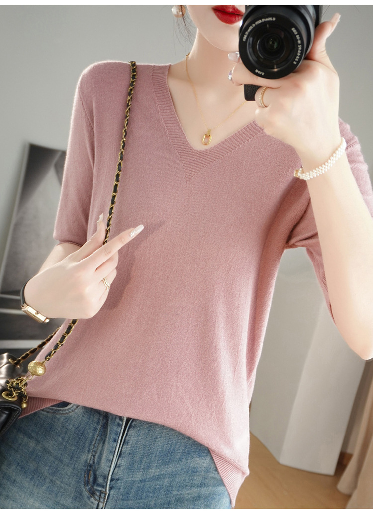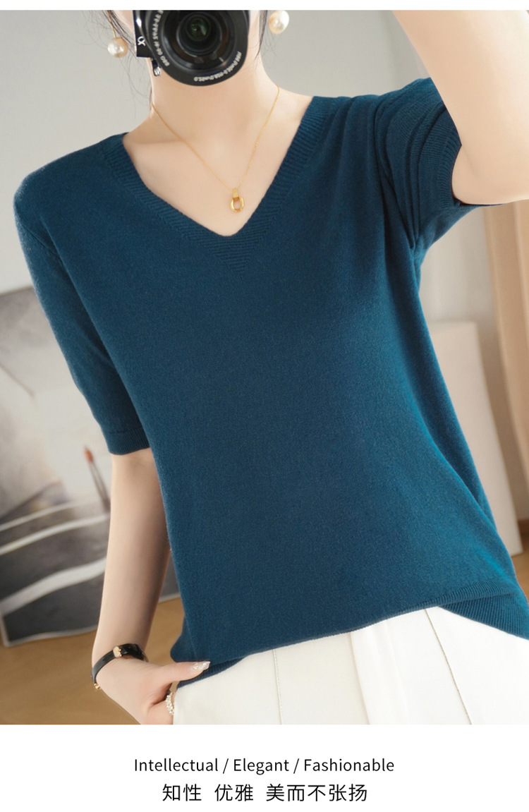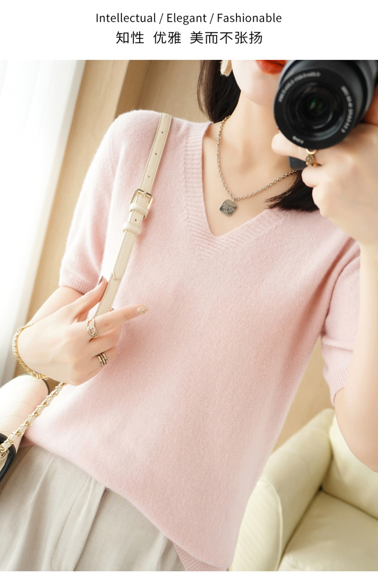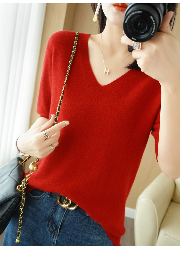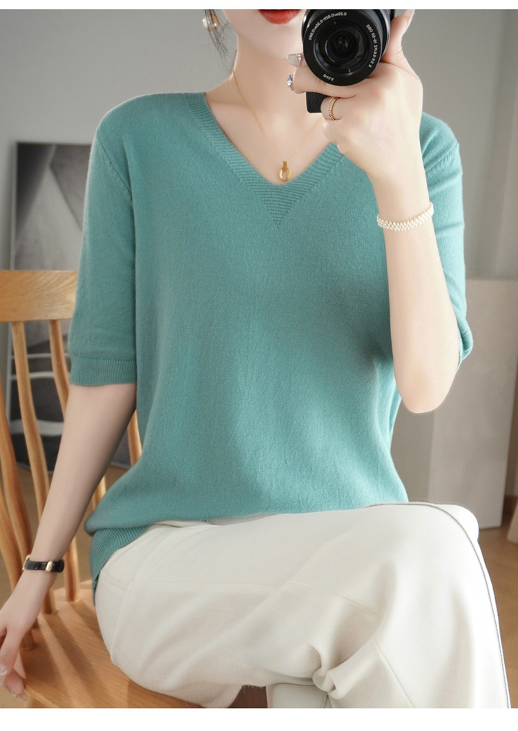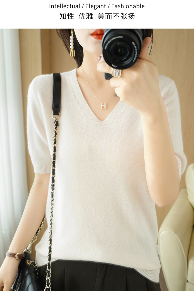 2023年春秋新款针织短袖女V领打底针织套头半袖毛衣宽松打底毛衫