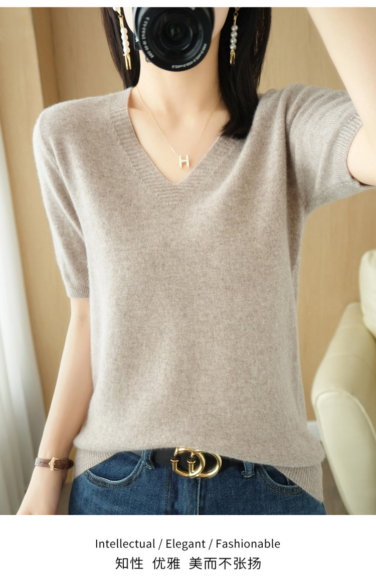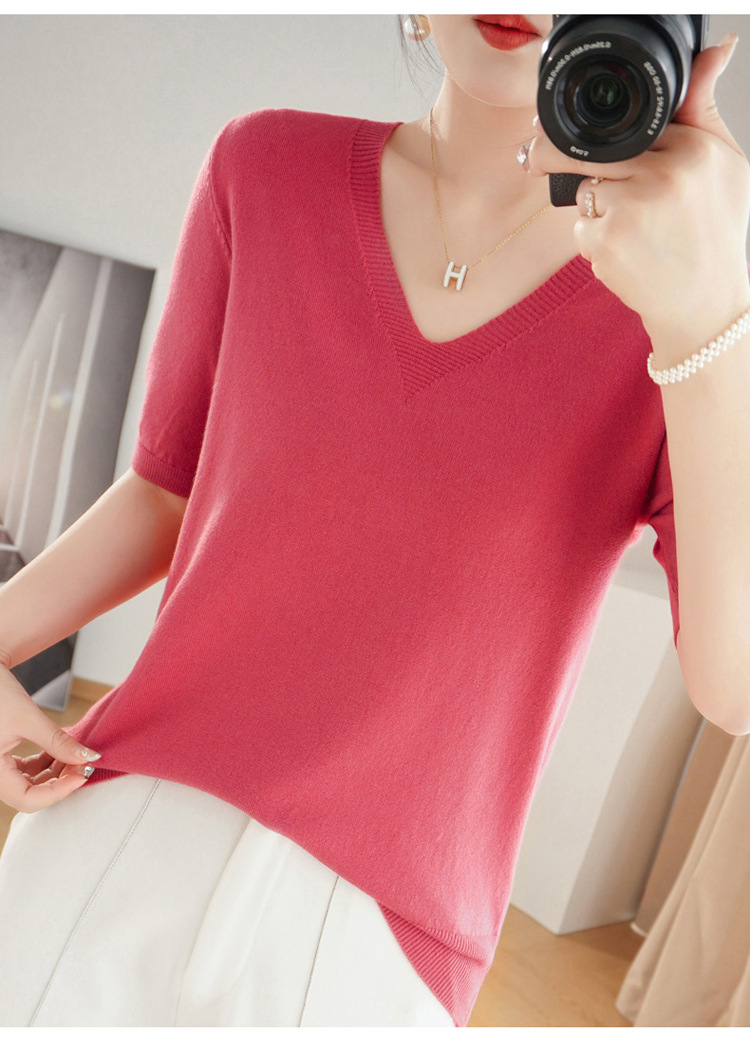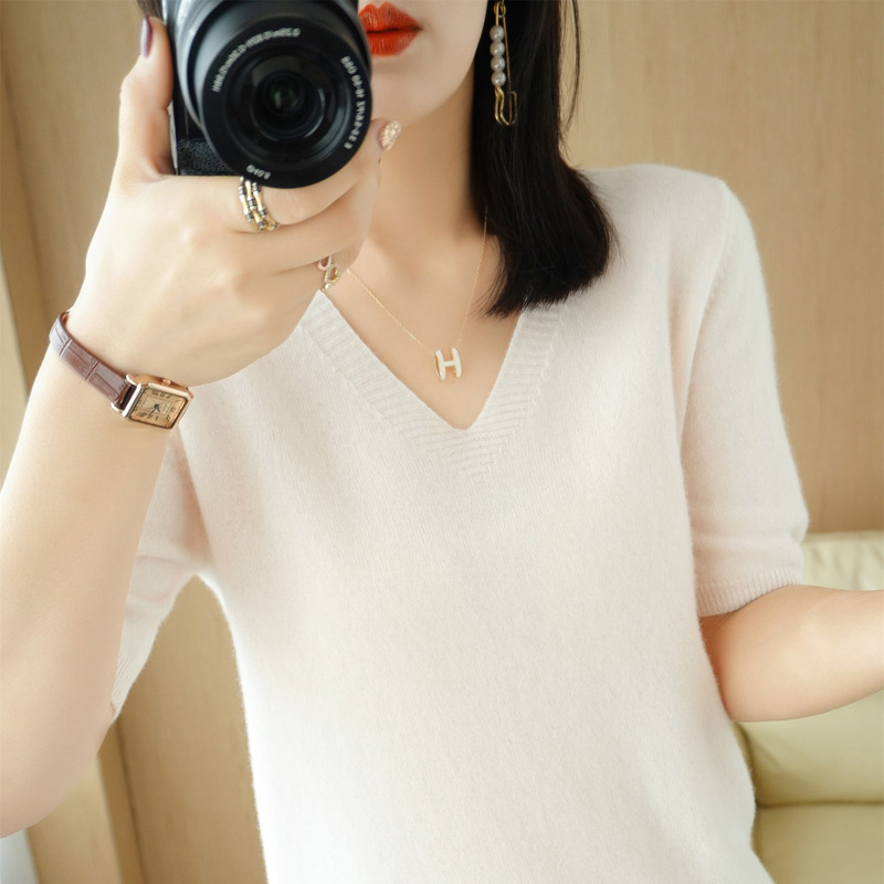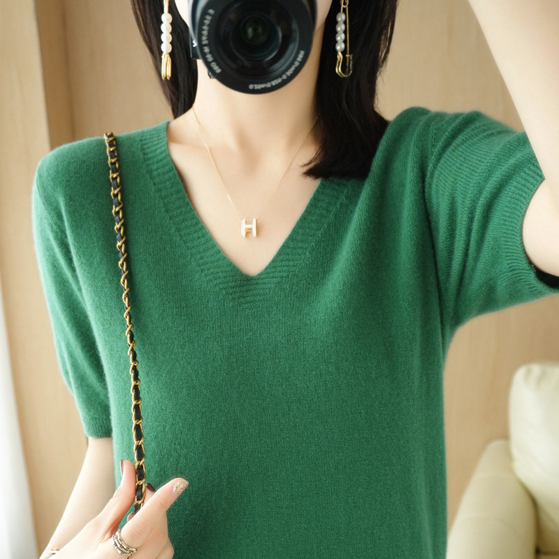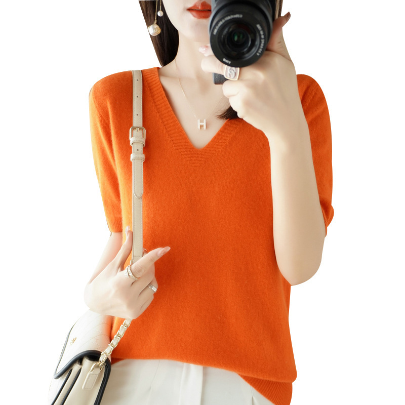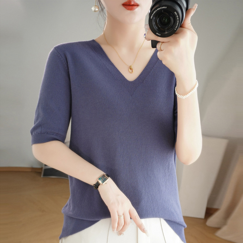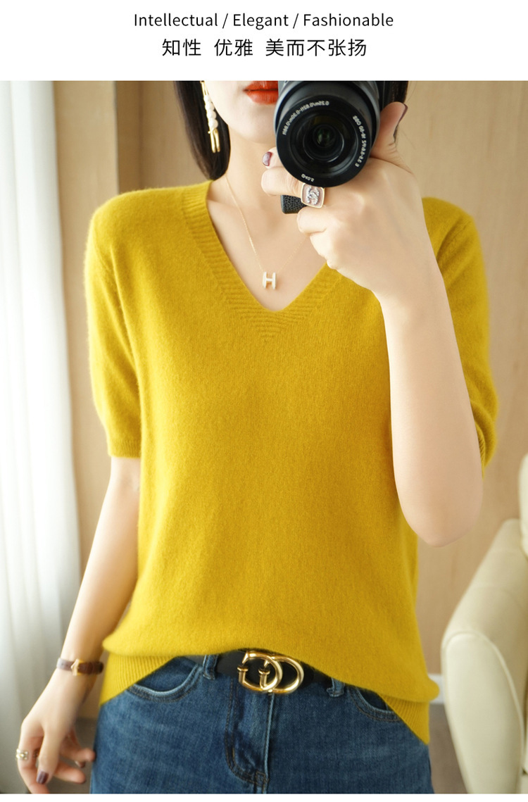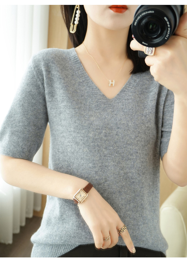 2023年春秋新款针织短袖女V领打底针织套头半袖毛衣宽松打底毛衫