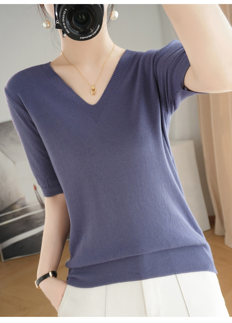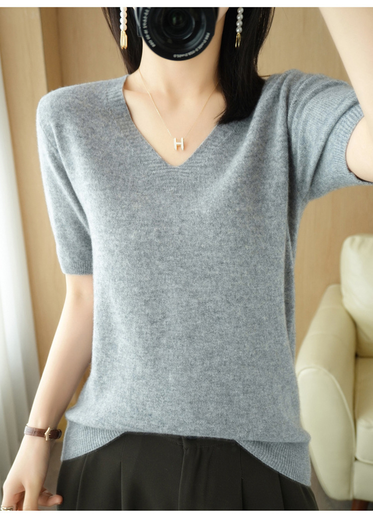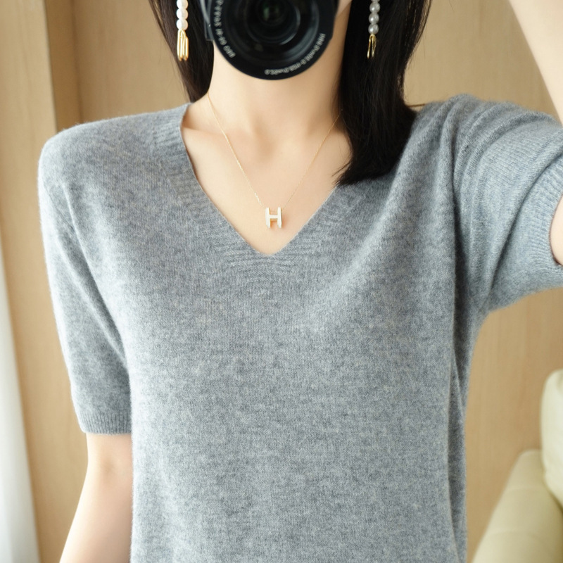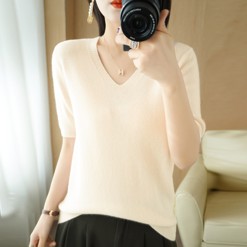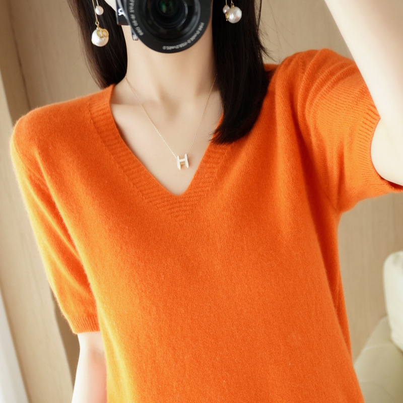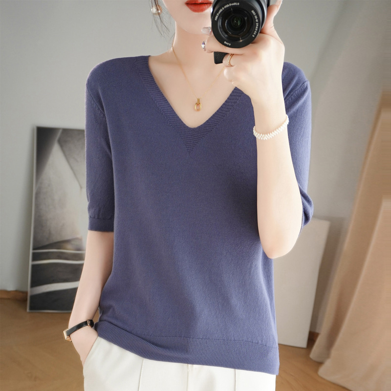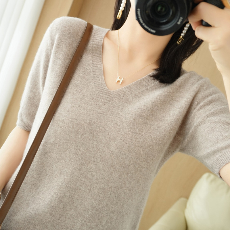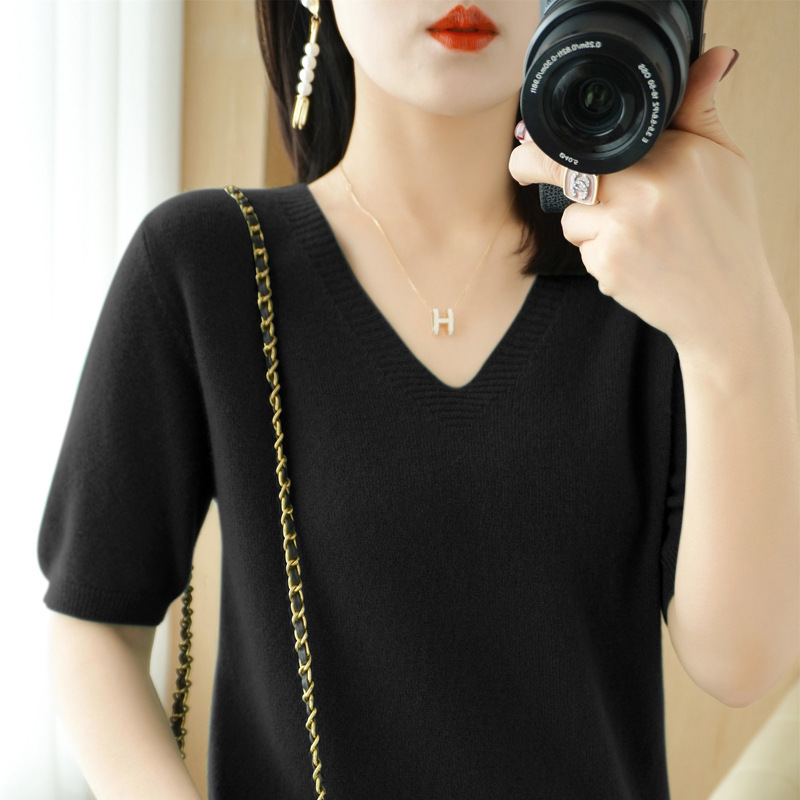 2023年春秋新款针织短袖女V领打底针织套头半袖毛衣宽松打底毛衫