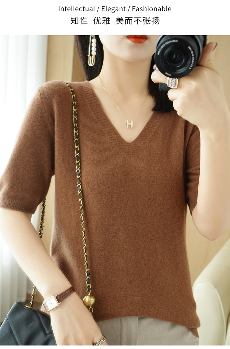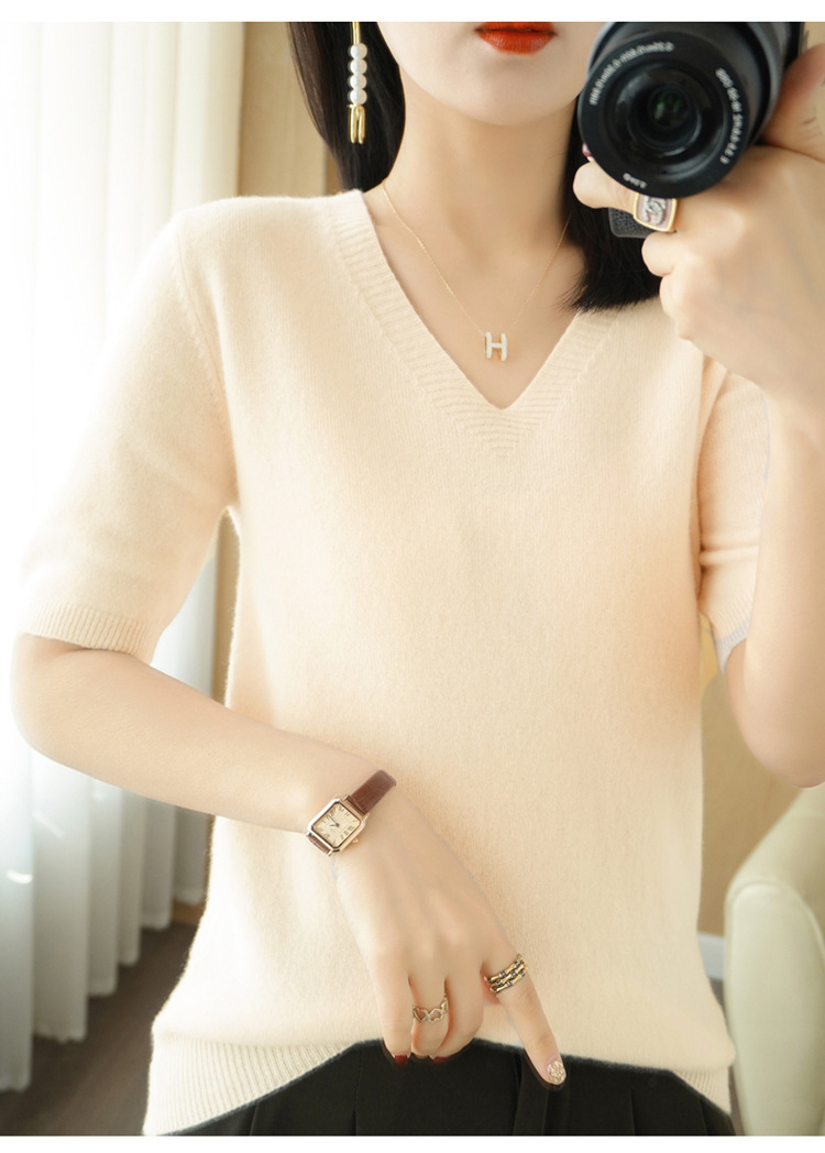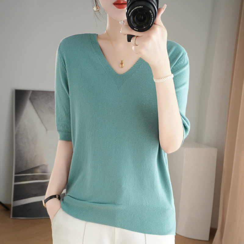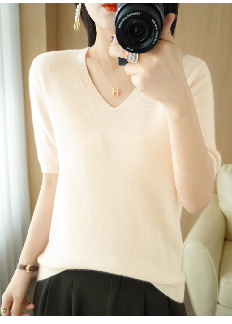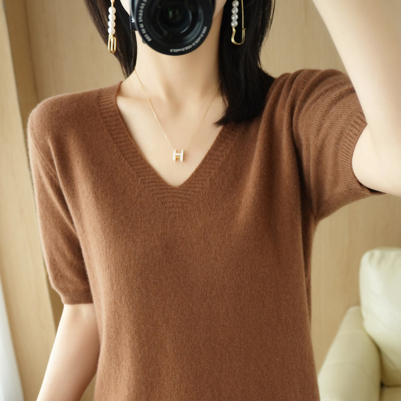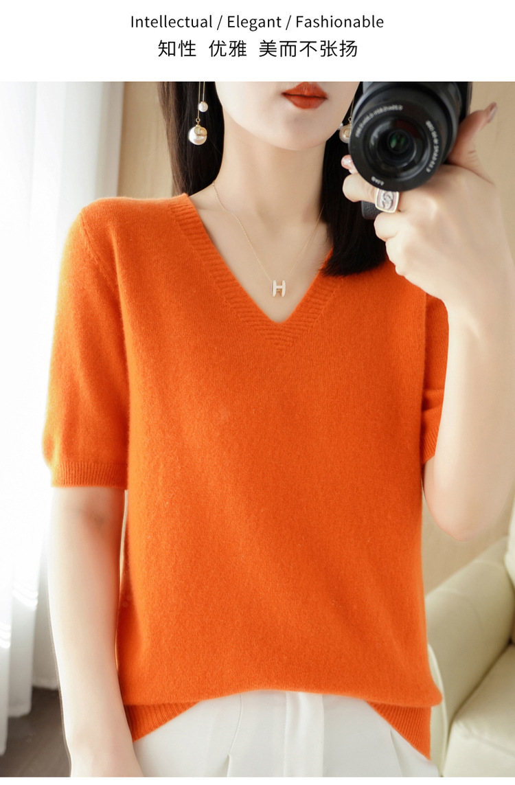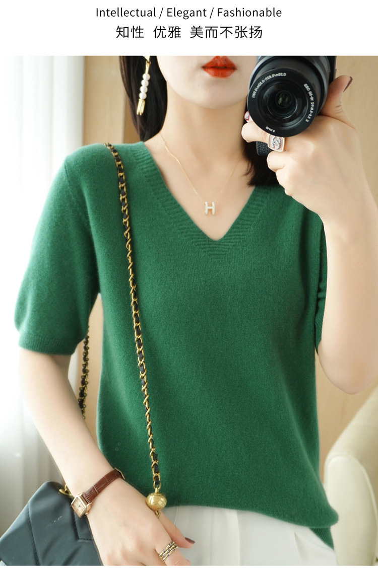 2023年春秋新款针织短袖女V领打底针织套头半袖毛衣宽松打底毛衫