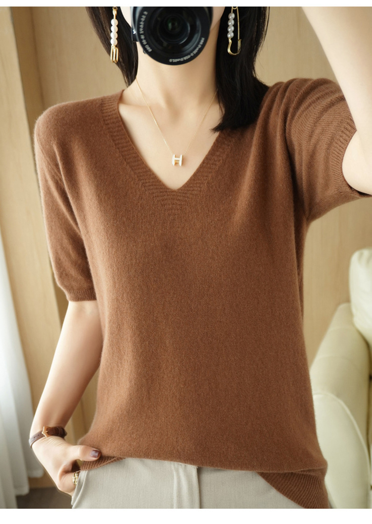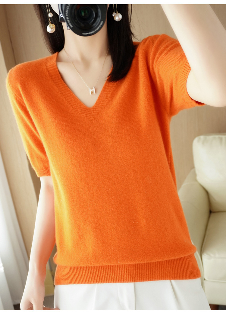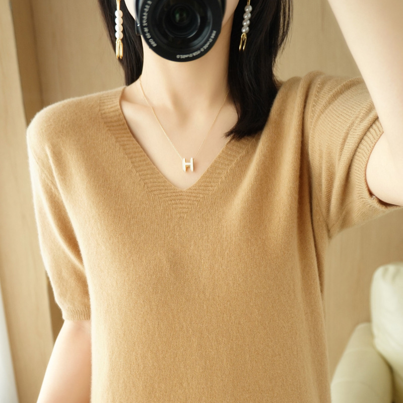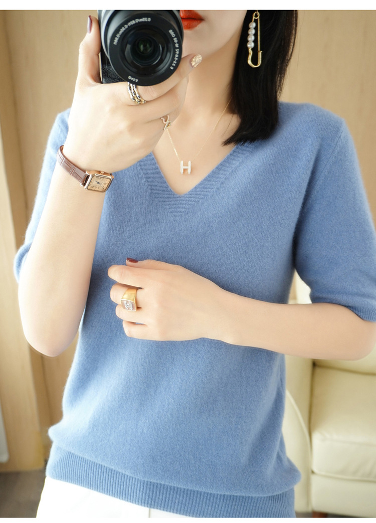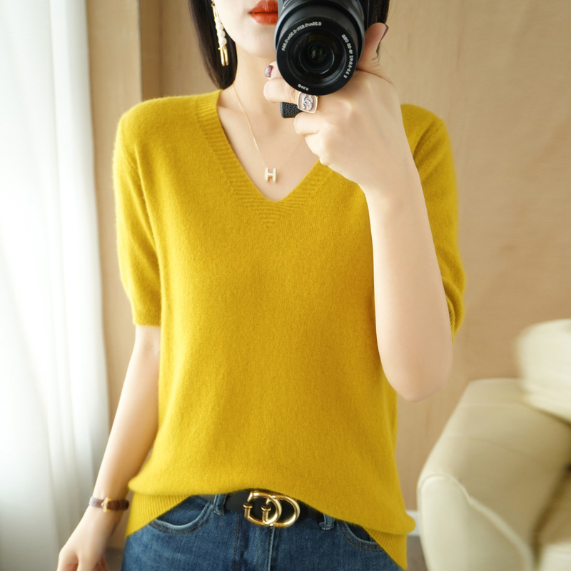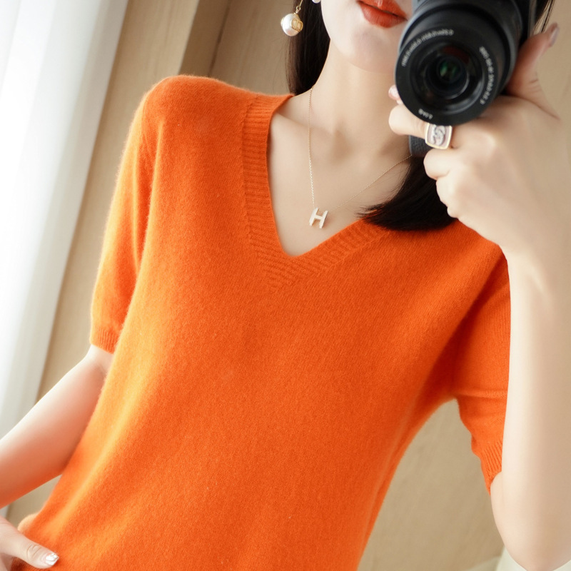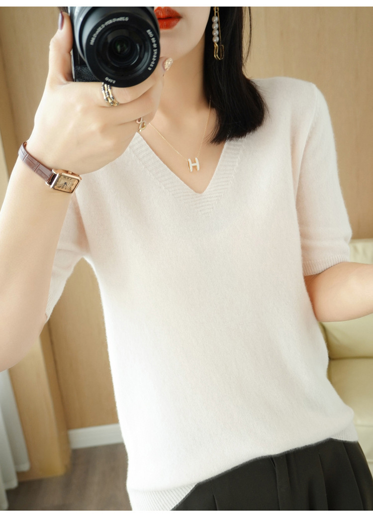 2023年春秋新款针织短袖女V领打底针织套头半袖毛衣宽松打底毛衫