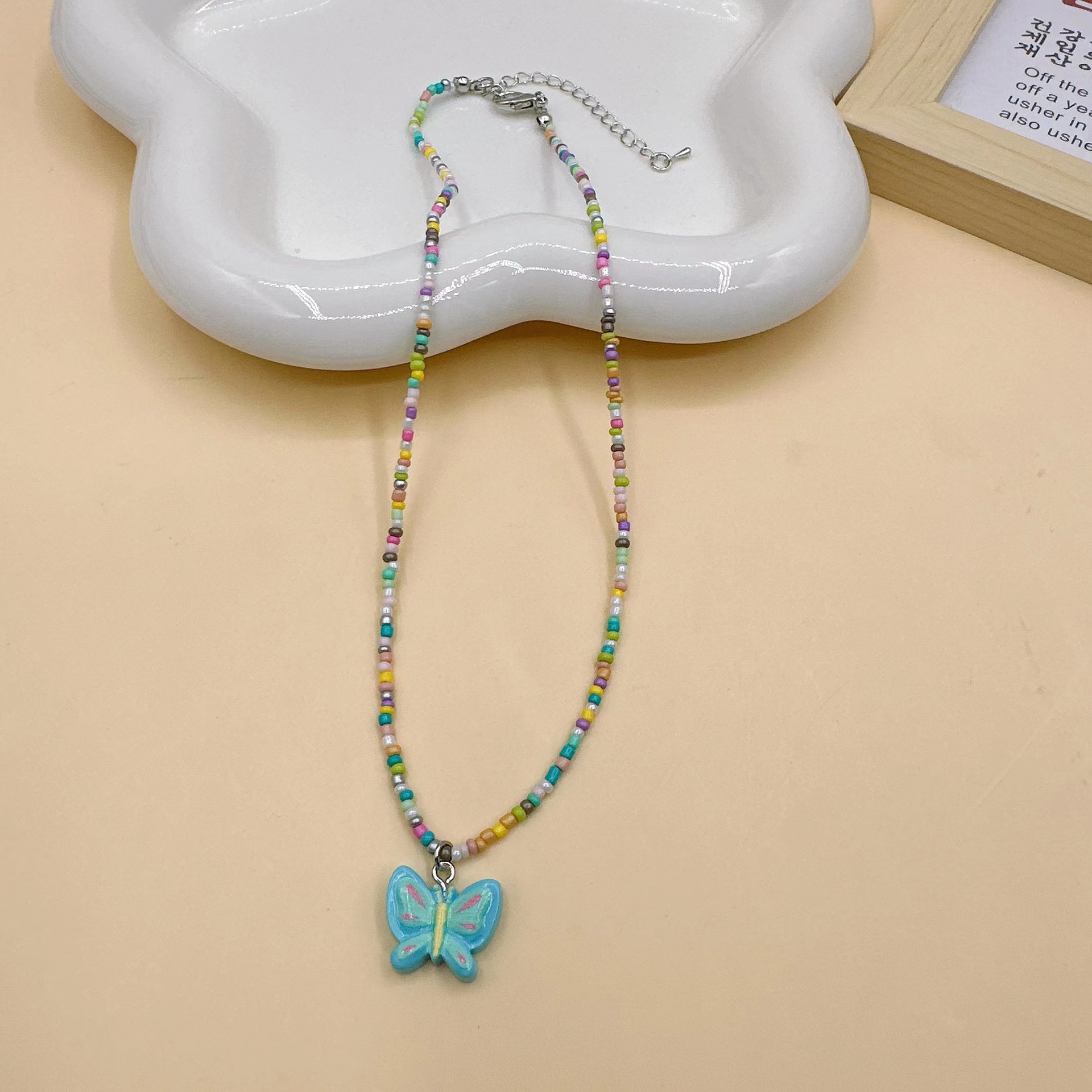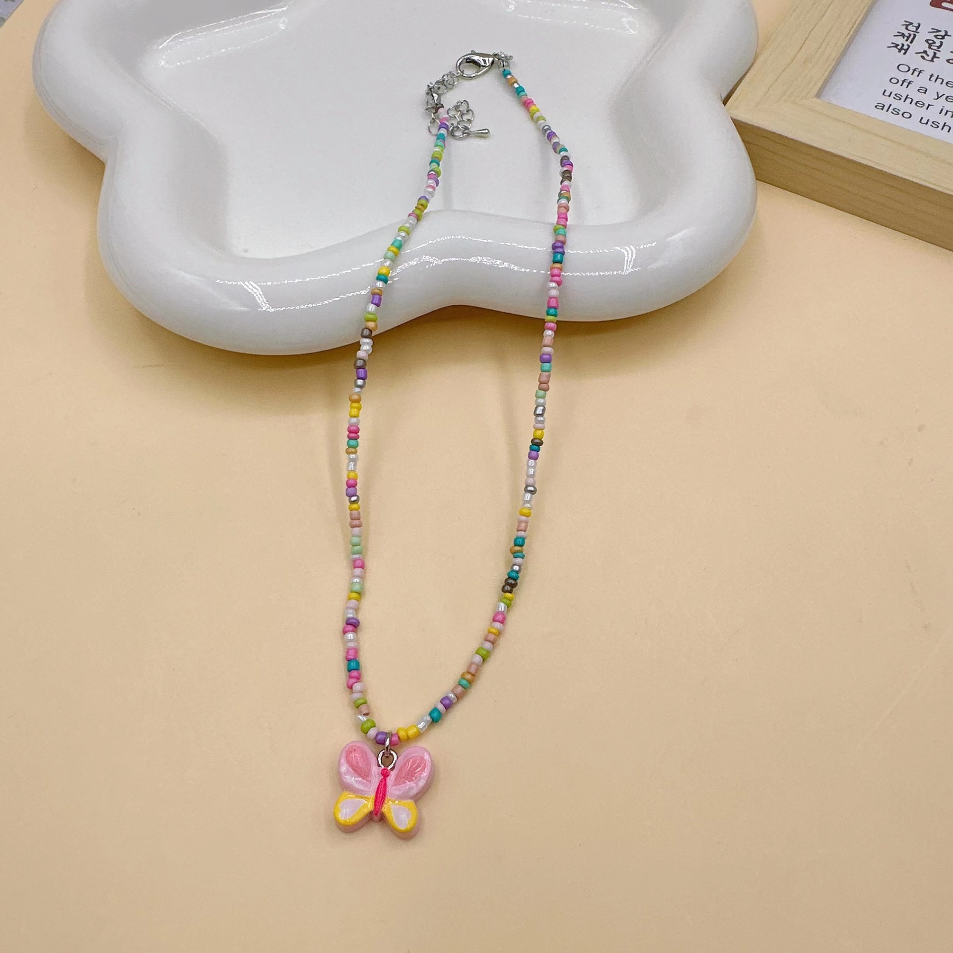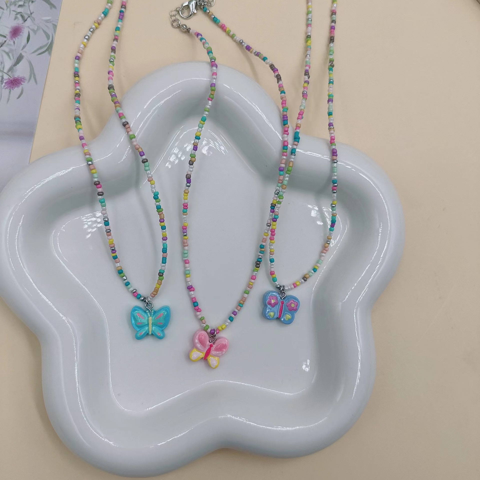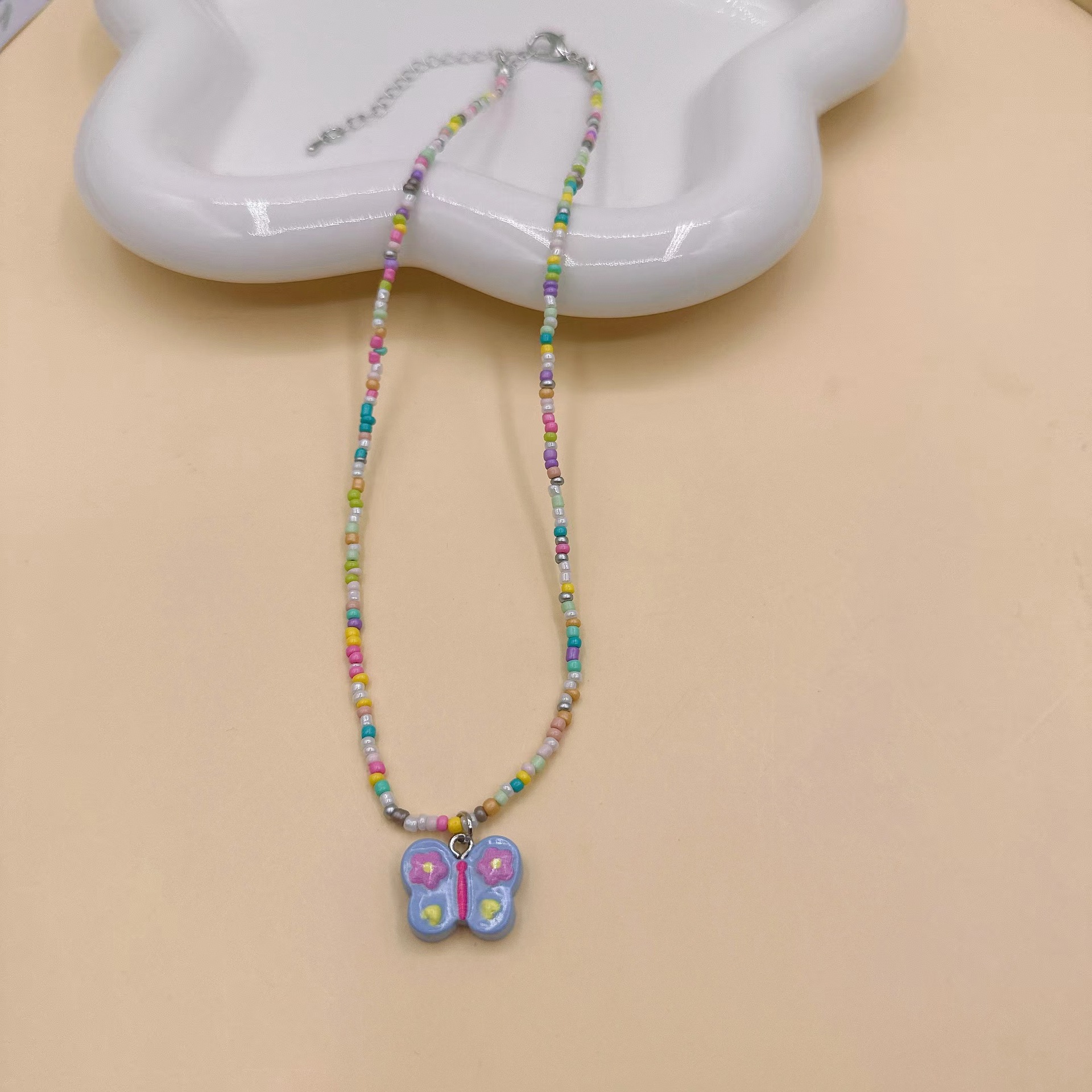 韩国彩色蝴蝶花朵项链颈链 ins风串珠米珠项链少女风昭和风项饰