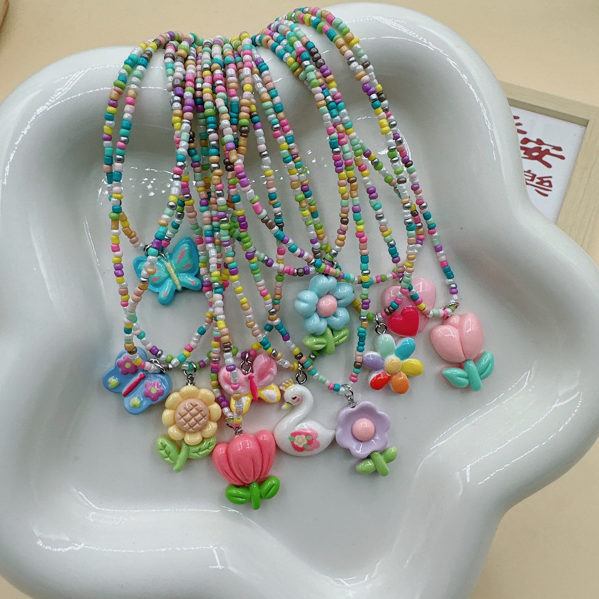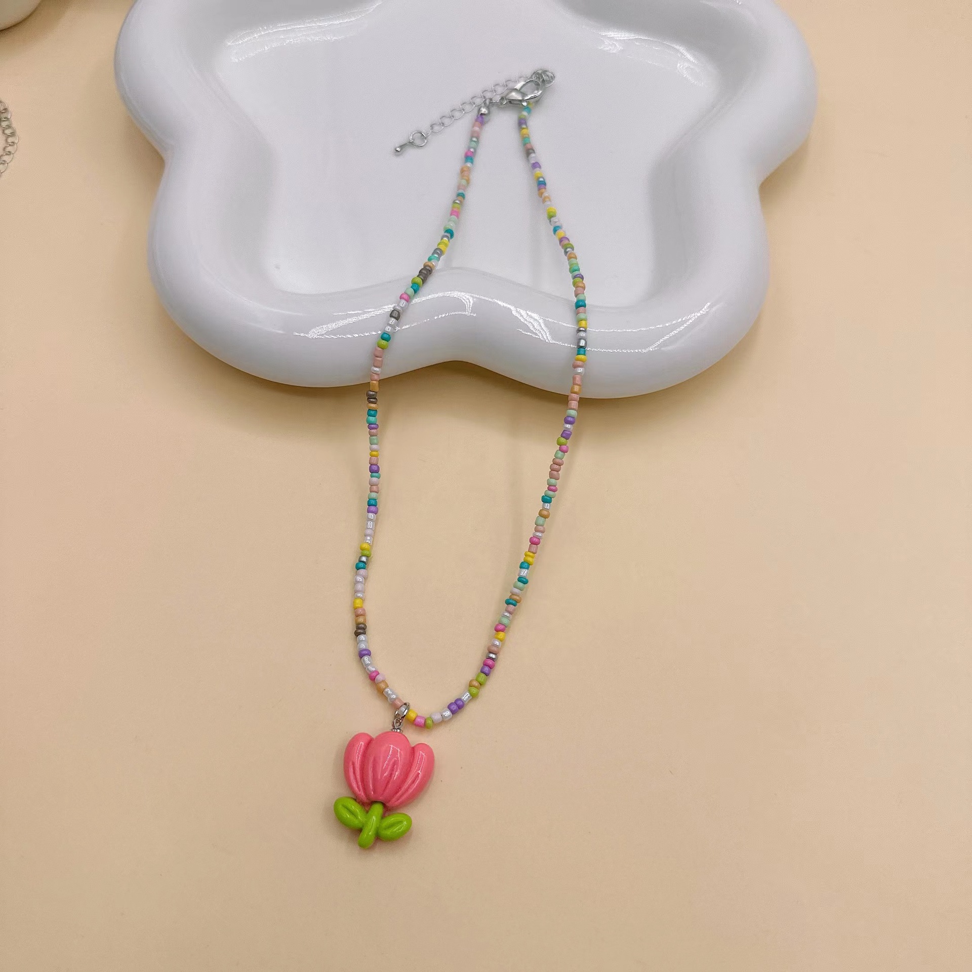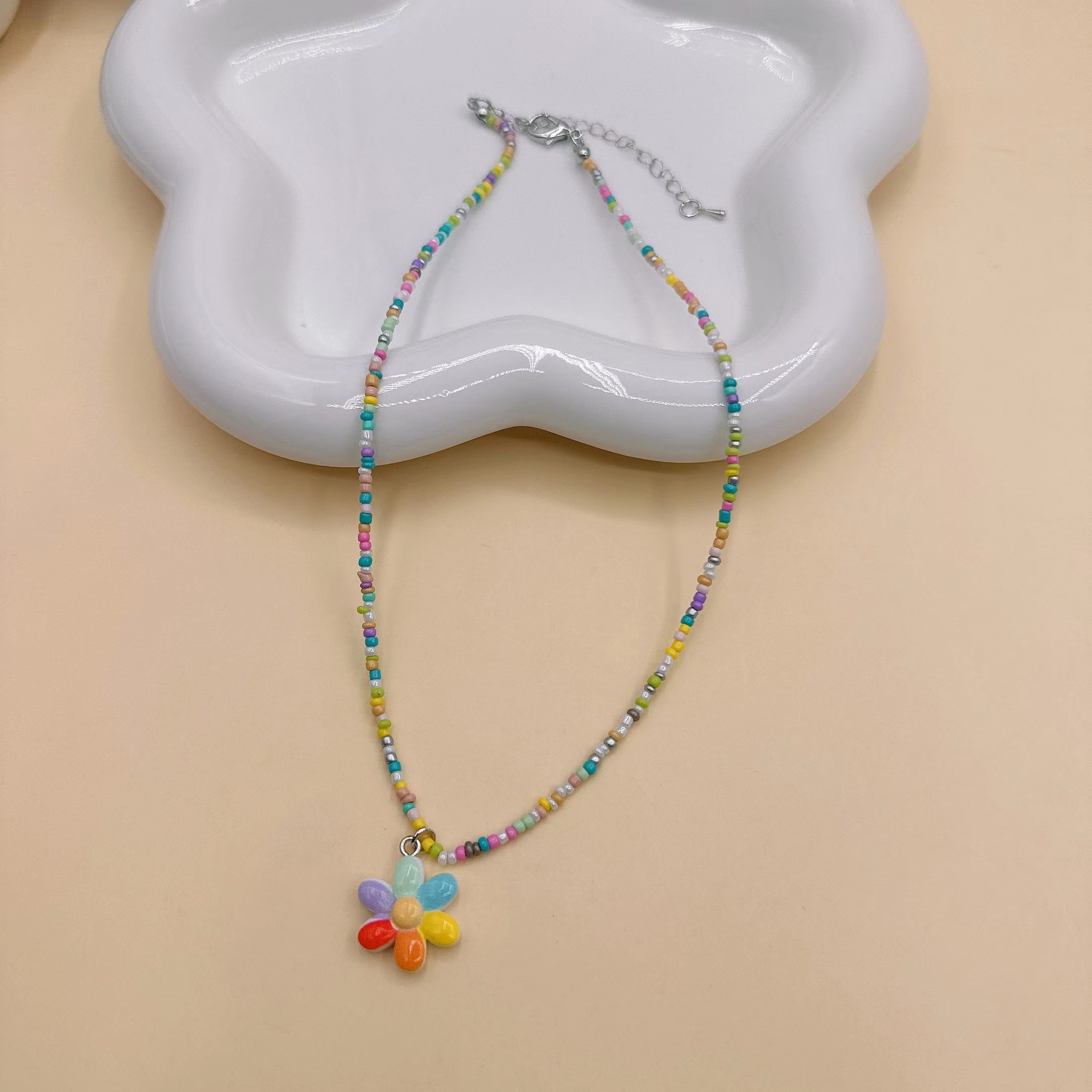 韩国彩色蝴蝶花朵项链颈链 ins风串珠米珠项链少女风昭和风项饰
