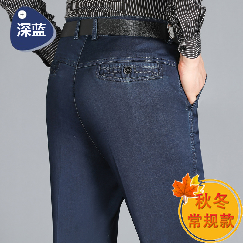 秋冬厚款男士牛仔裤弹力高腰直筒宽松中年休闲长裤中老年爸爸男裤