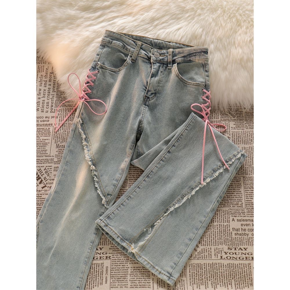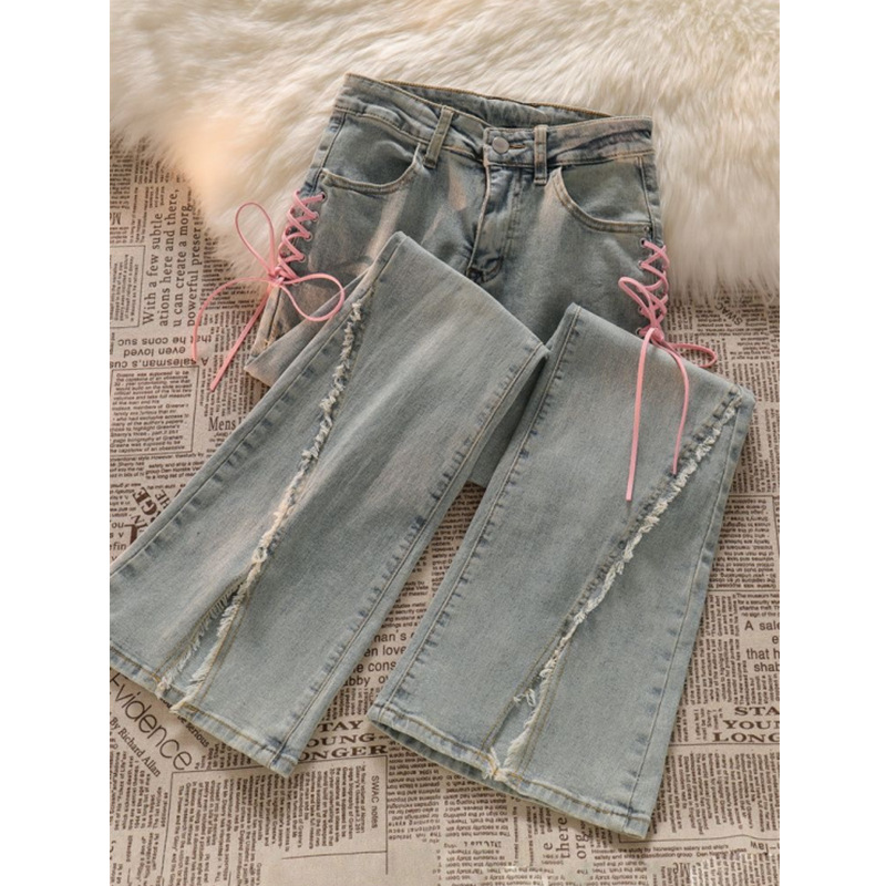 2023春季新款毛边系带高腰牛仔裤女设计感小众开叉美式喇叭长裤子
