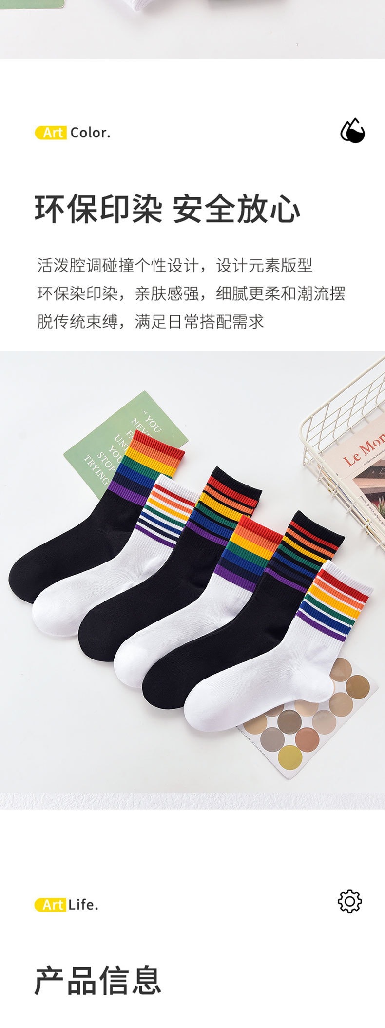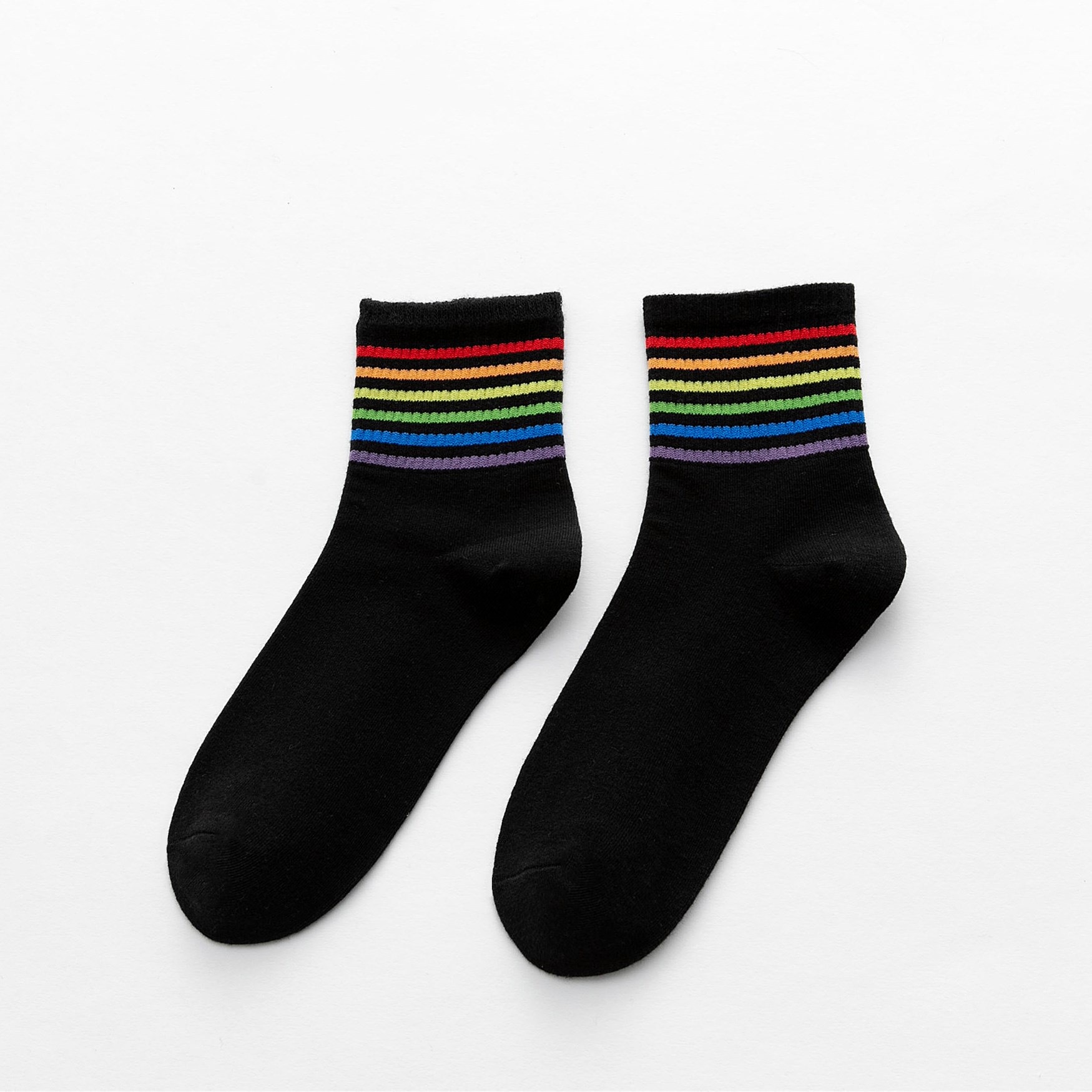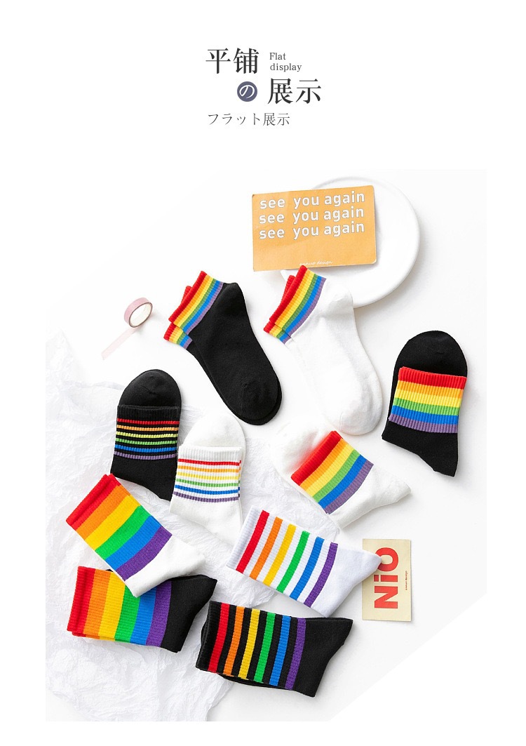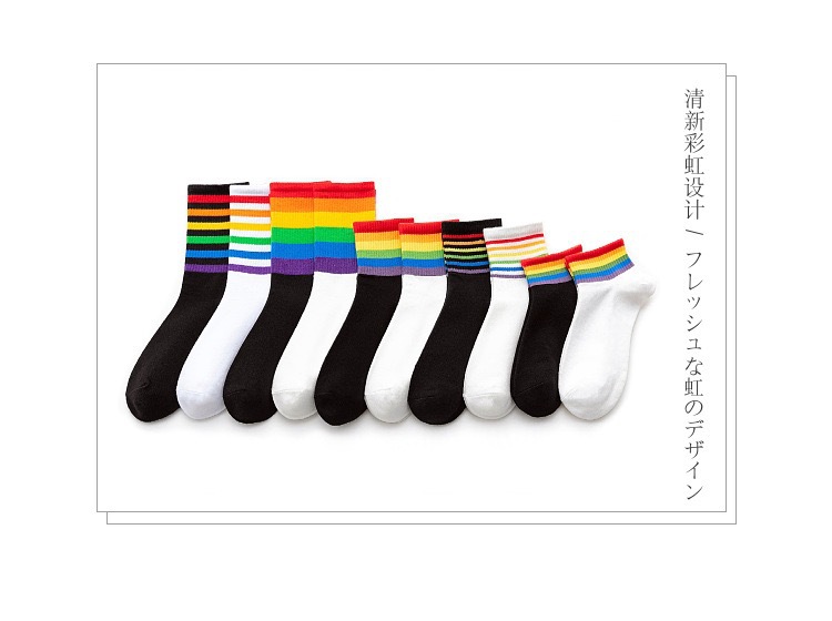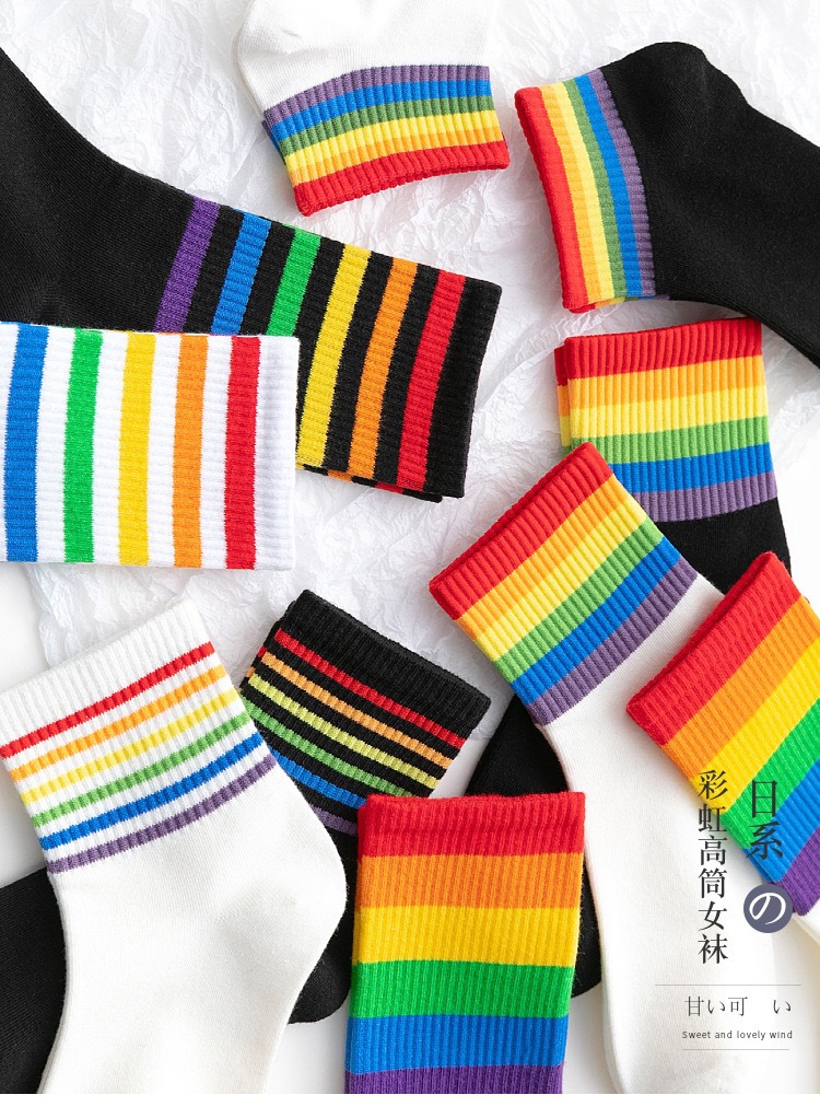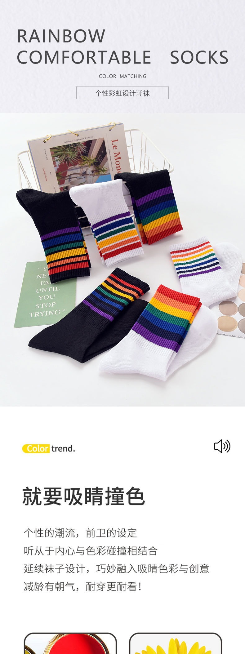 新款彩虹袜子女中筒短筒潮街头ins韩版外穿日系网红黑白色彩虹袜