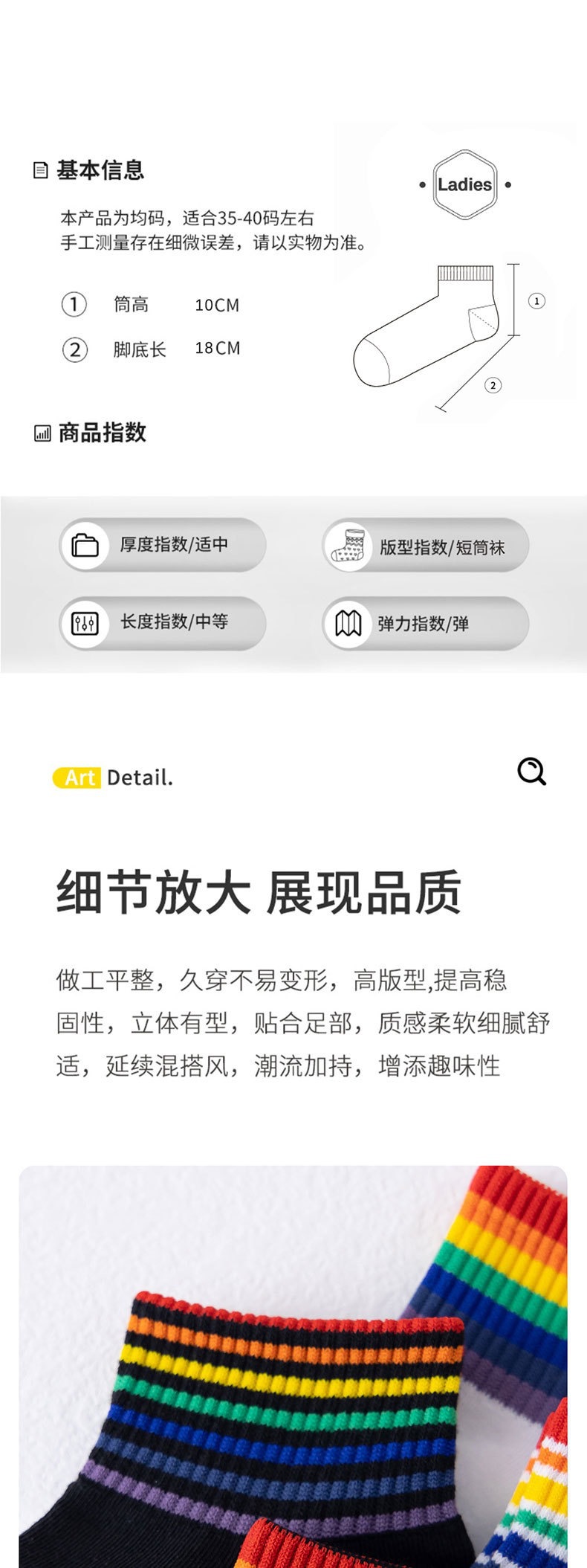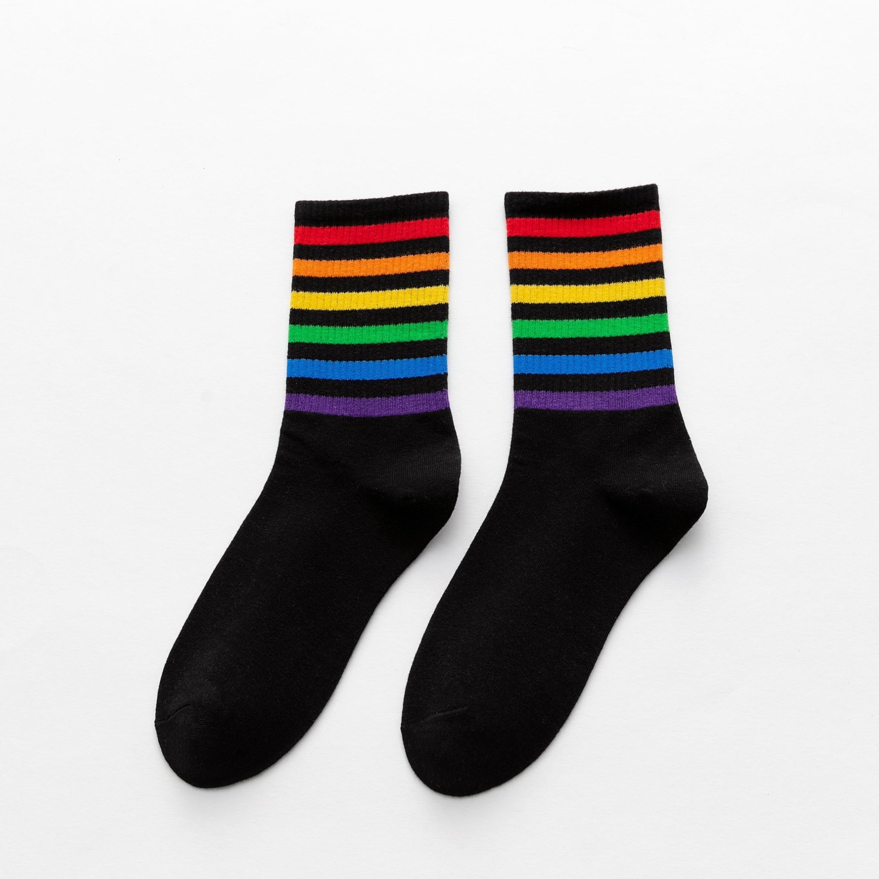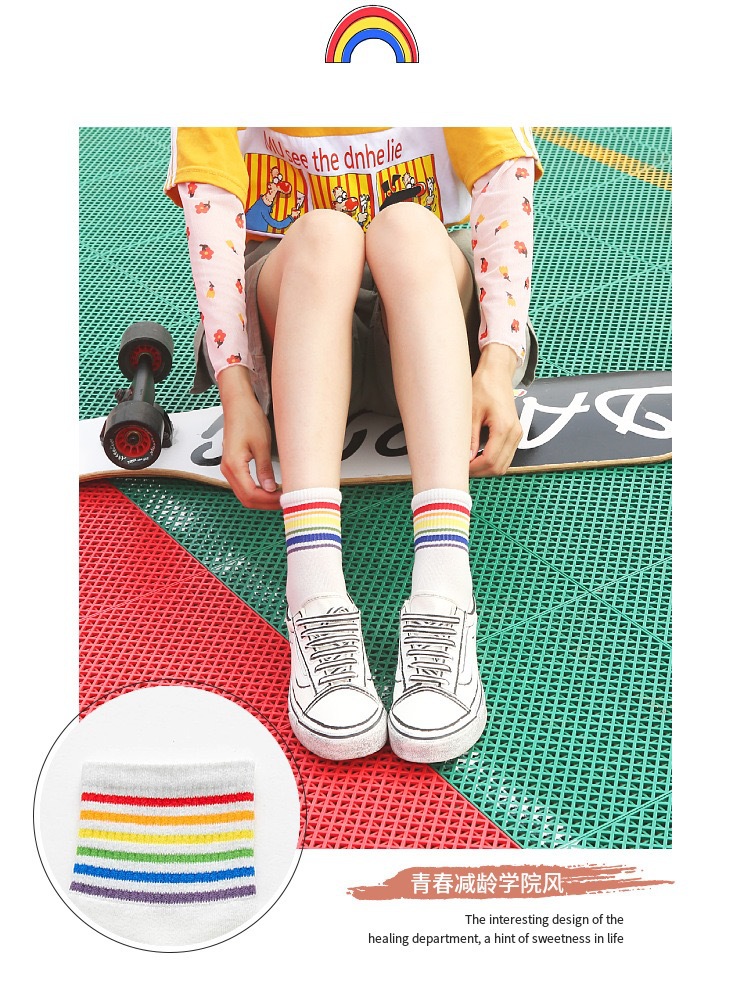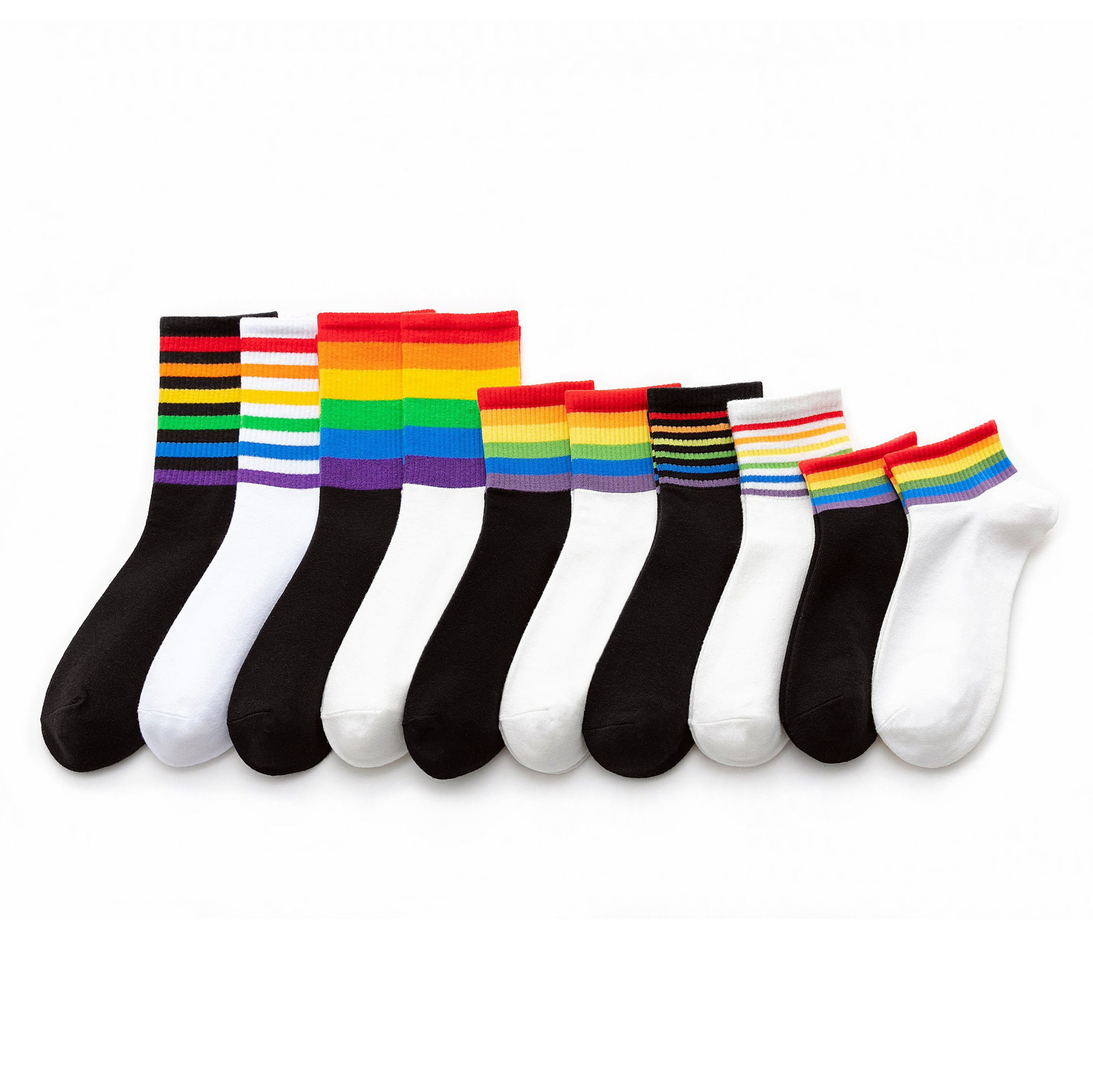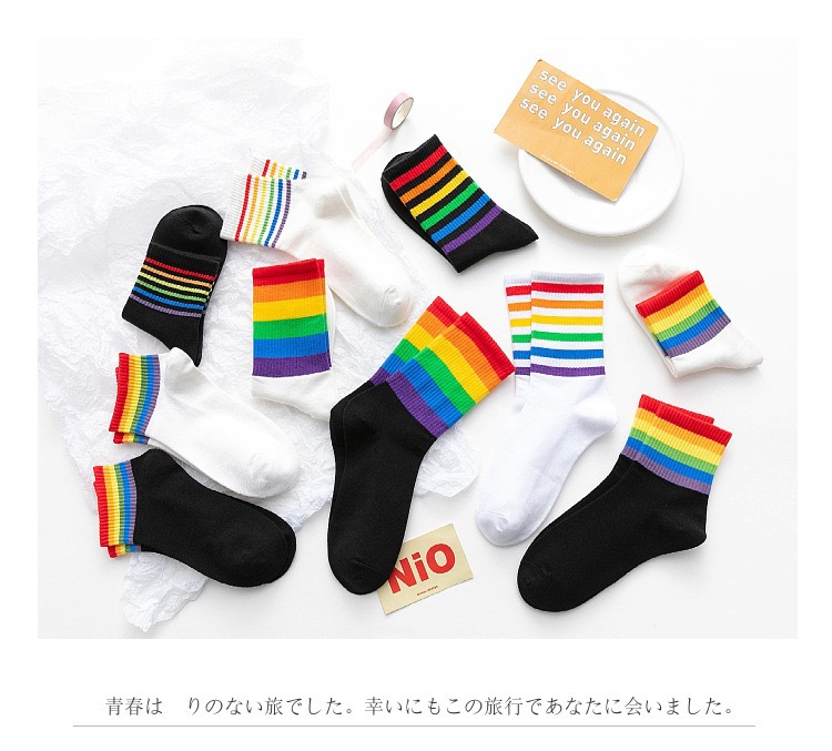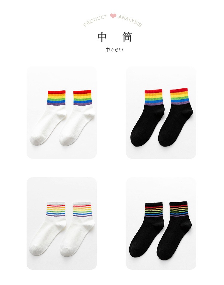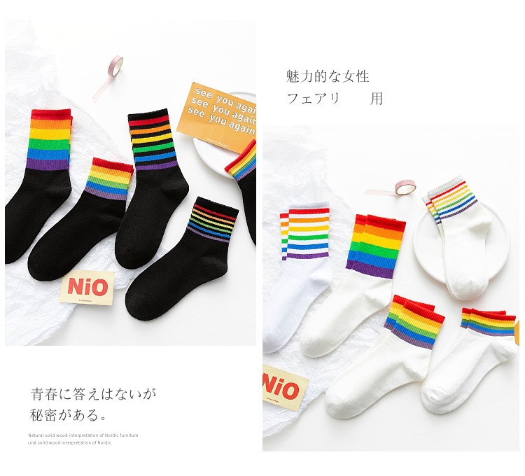 新款彩虹袜子女中筒短筒潮街头ins韩版外穿日系网红黑白色彩虹袜