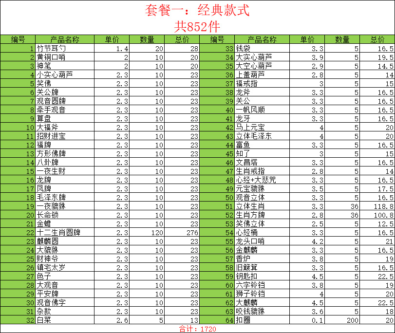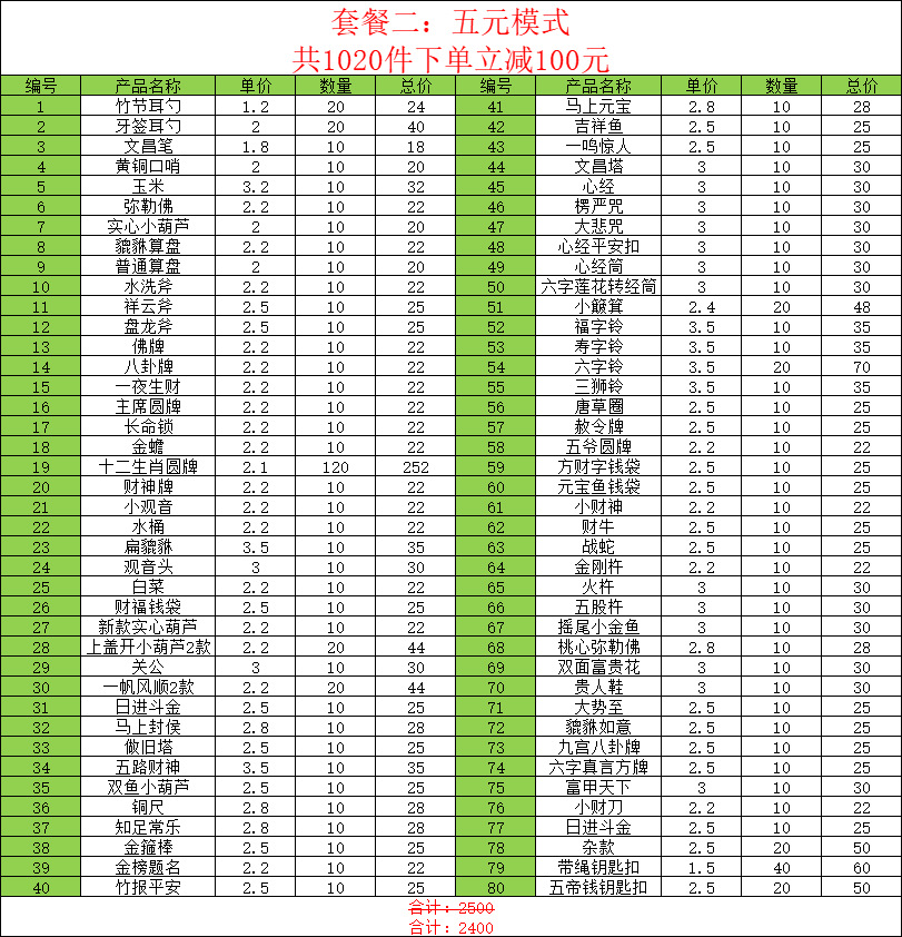 店里单位1代表1元,不代表1个。例如套餐二1020个2400元,下单拍下2400。套餐三800个2800元下单拍2800。套餐一852个1720元下单拍1720。首次拿货建议按套餐拿货,下次补货可以选补卖的好的款,这是半成品,铜材质。地摊旅游景区卖5元或10元模式。