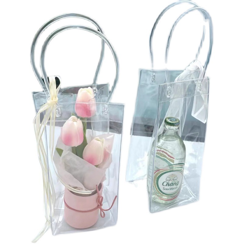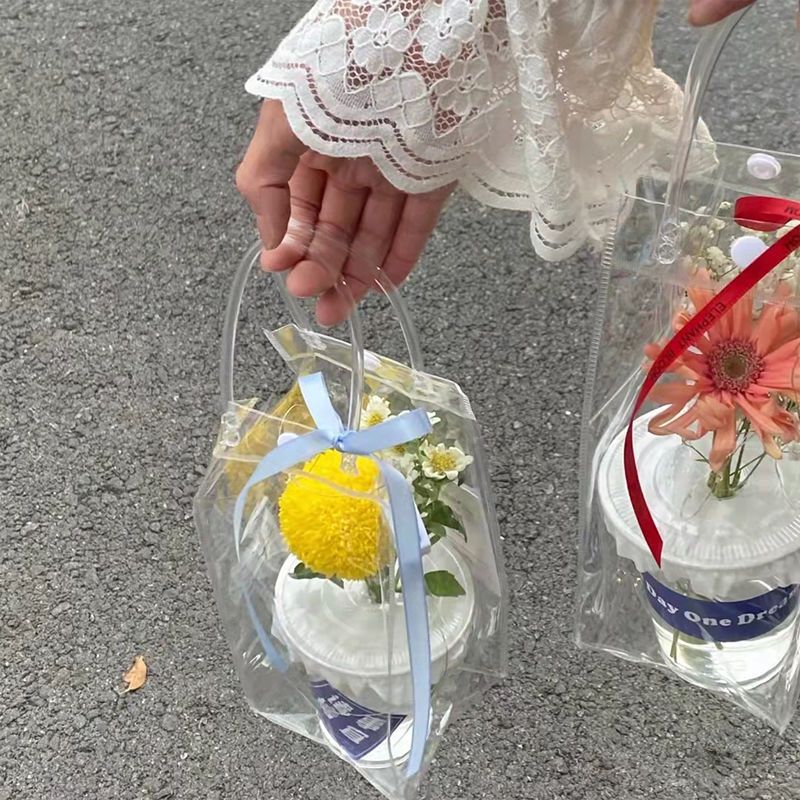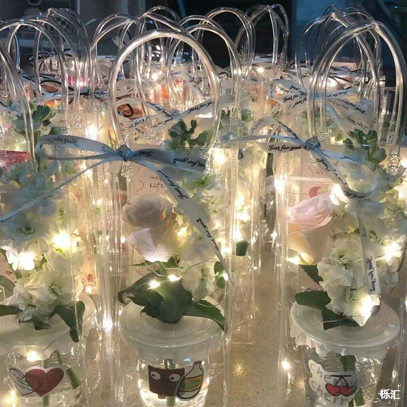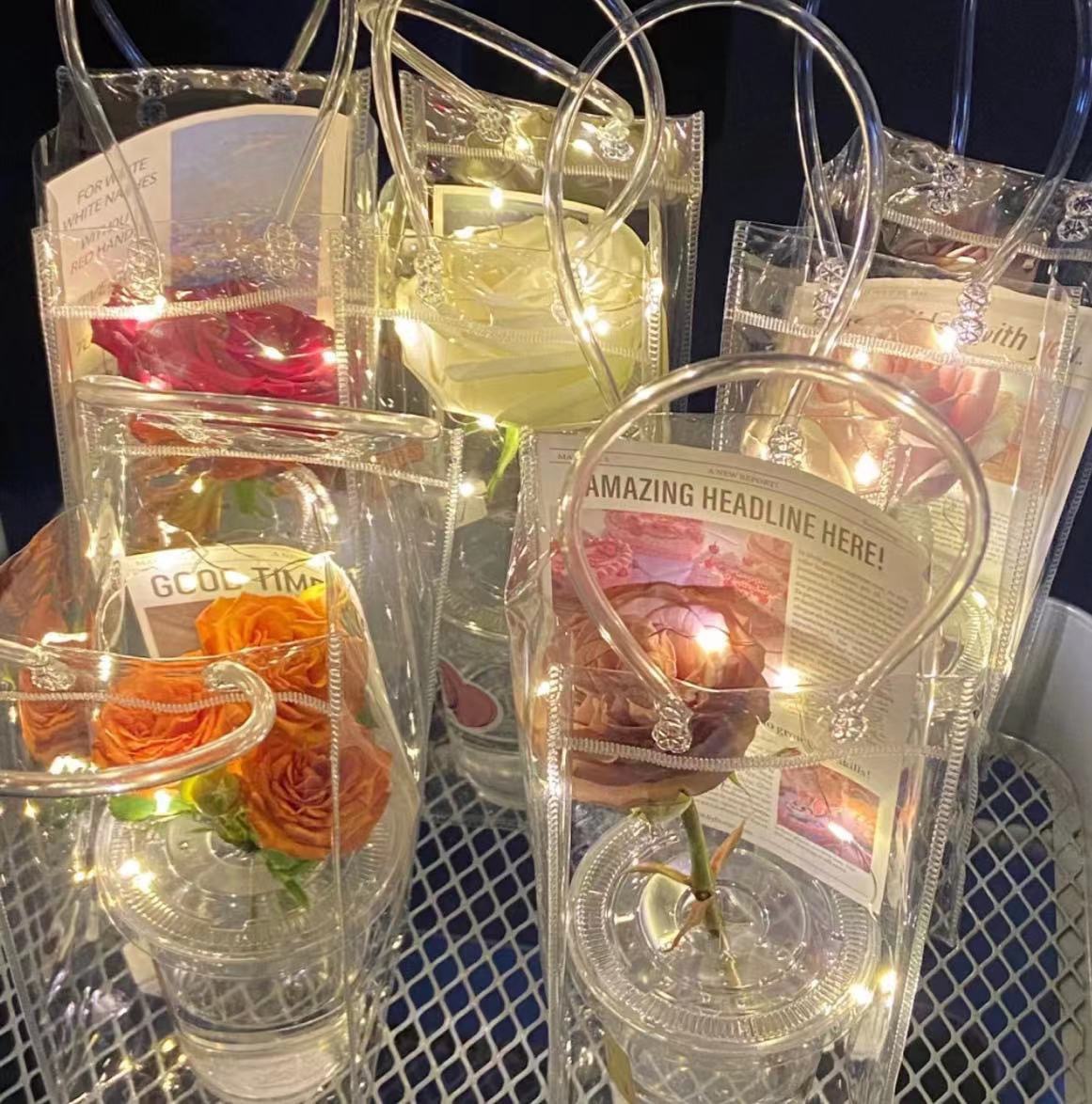 小红书杯花鲜花袋pvc透明袋子批发夜市摆摊网红手提袋杯子+盖灯串