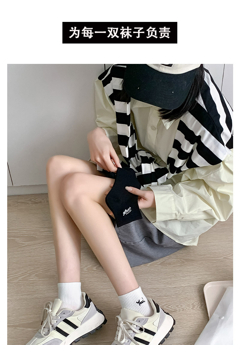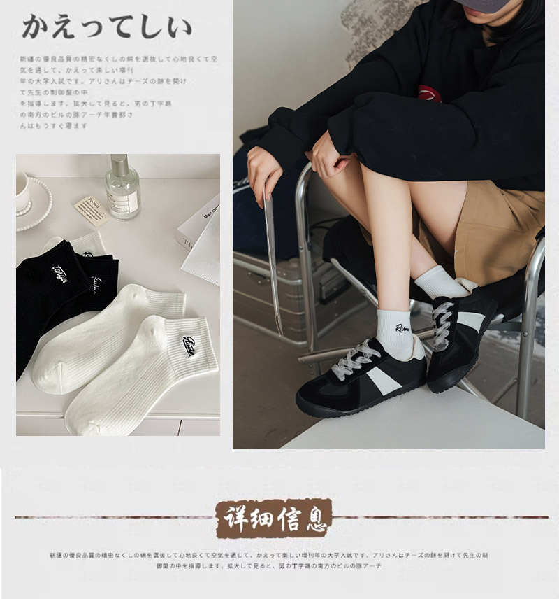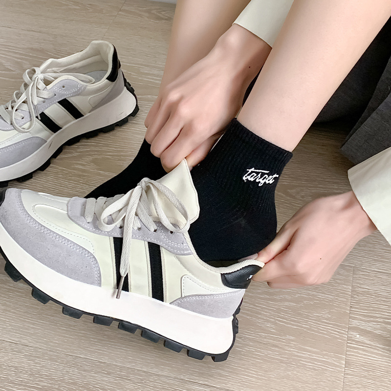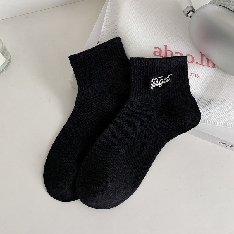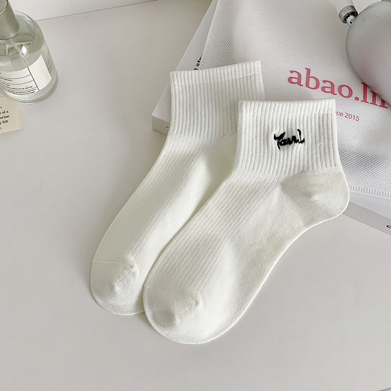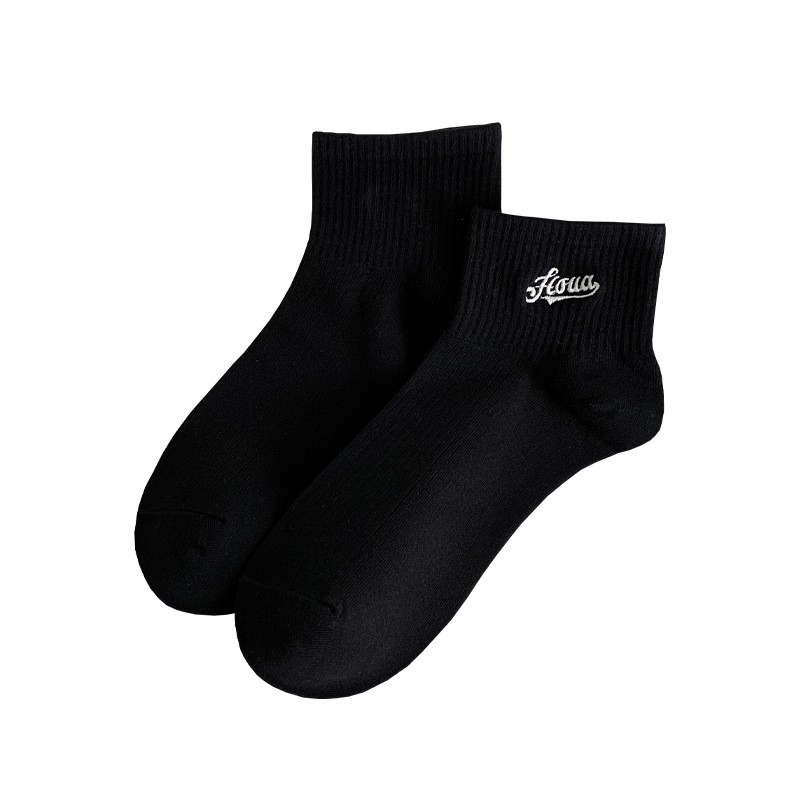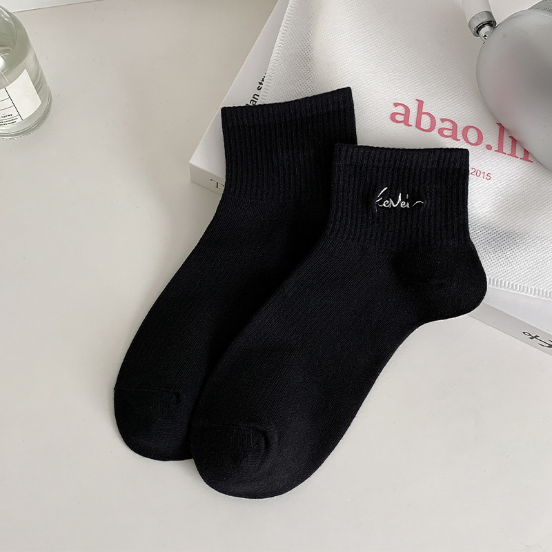 黑白色袜子女短袜ins潮春天夏季薄款纯色棉袜日系刺绣中筒袜批发