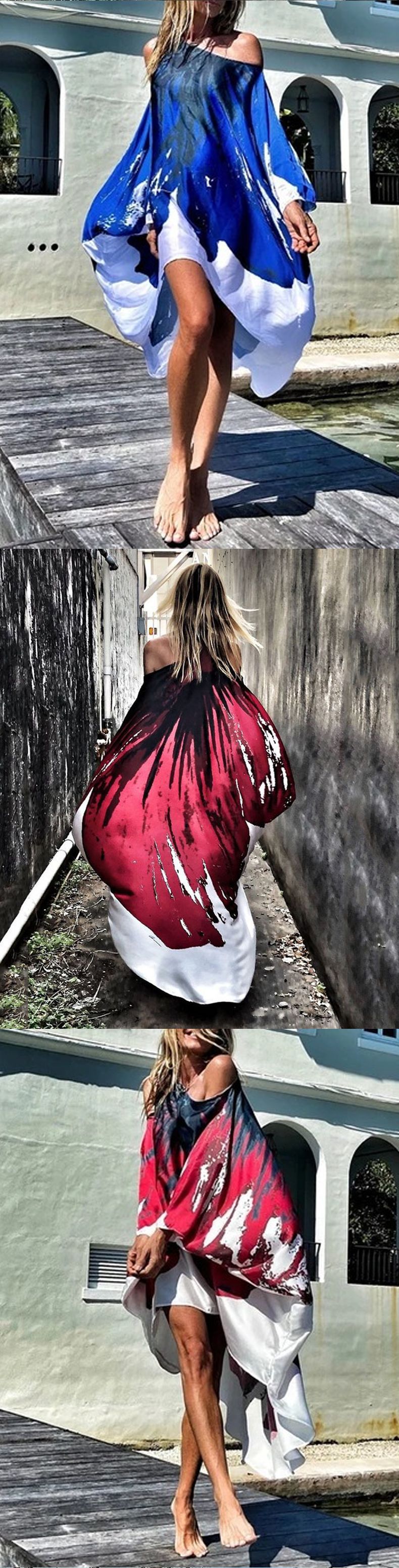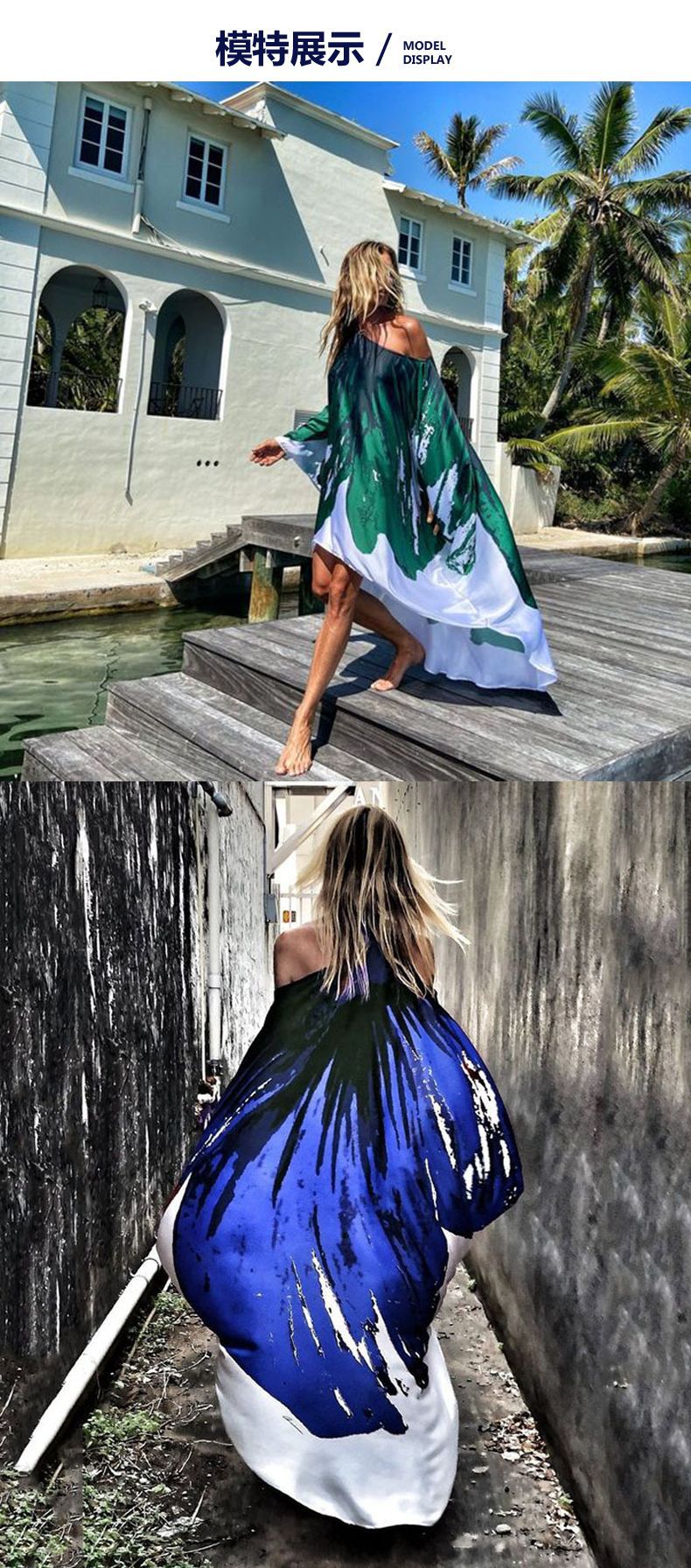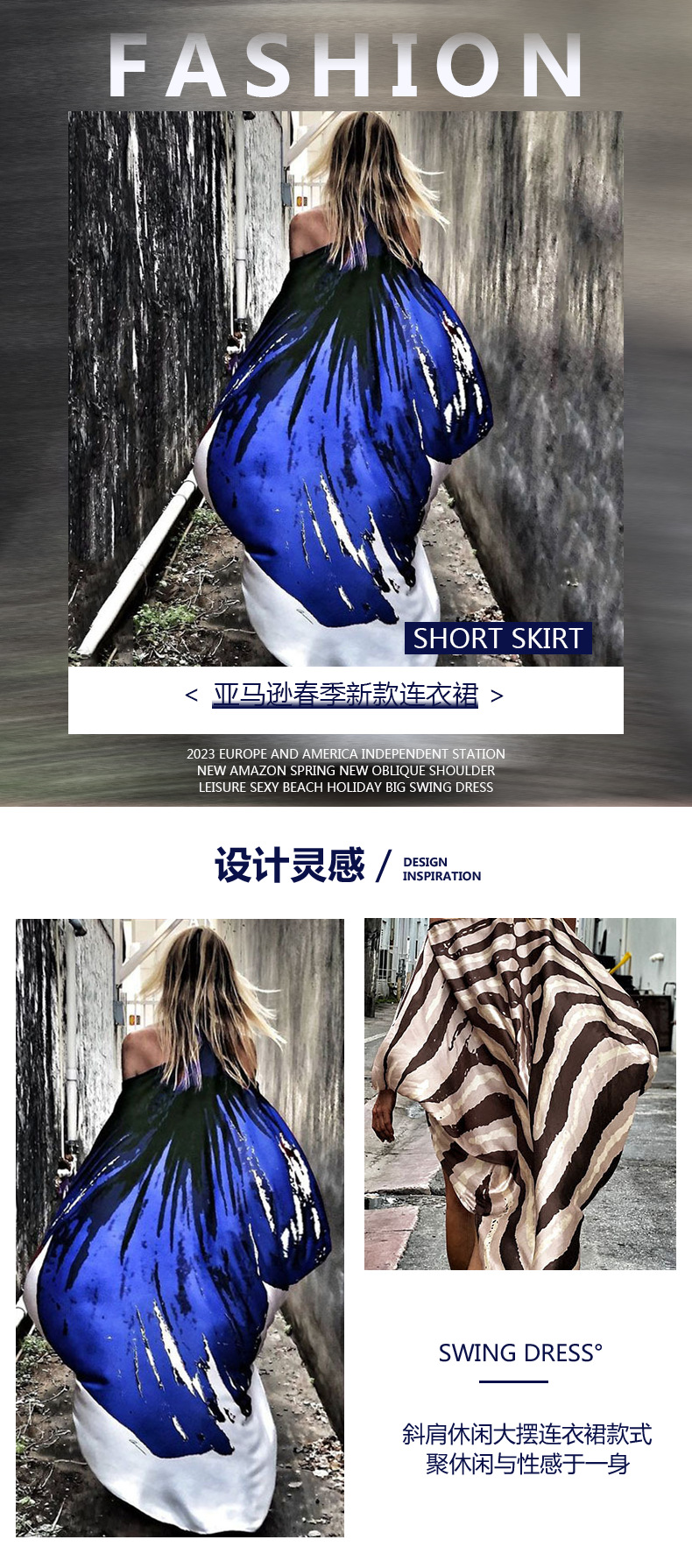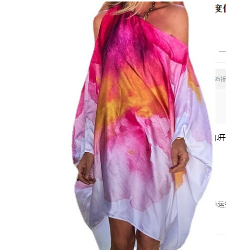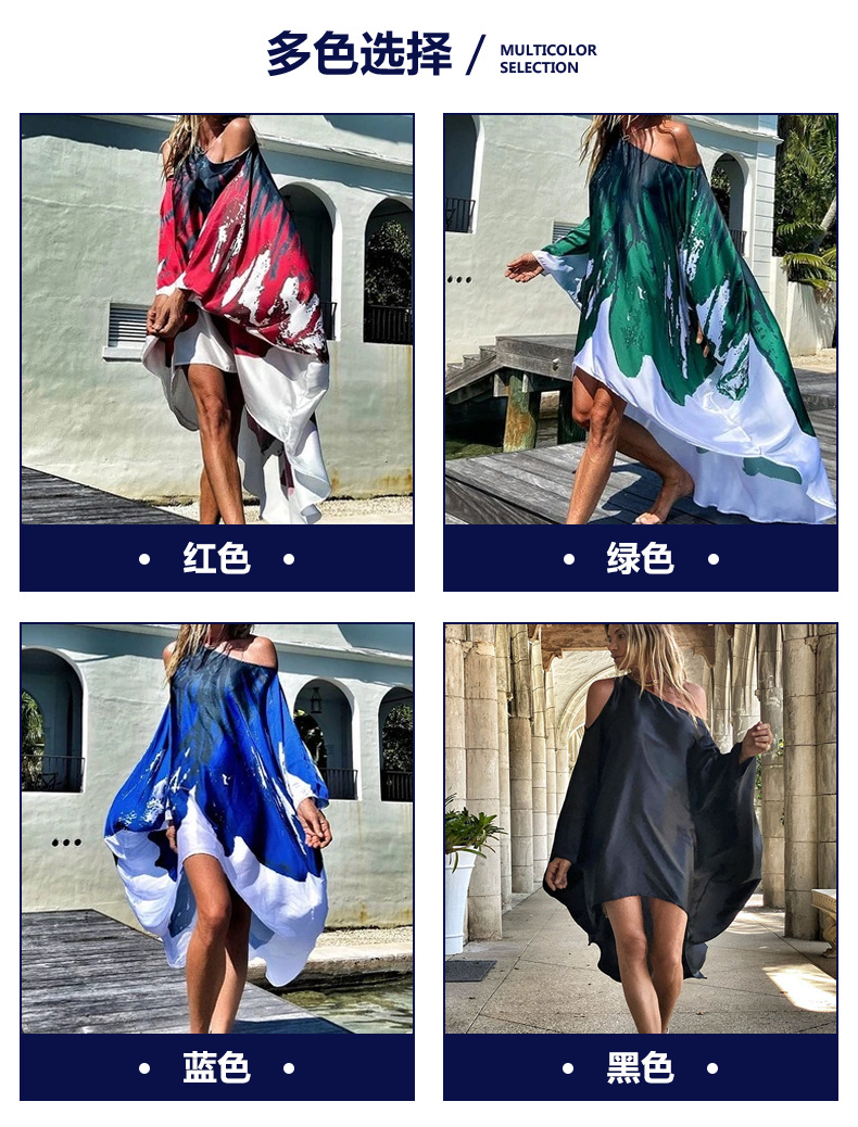 2023欧美独立站春季新款斜肩休闲性感沙滩度假大摆数码印花连衣裙