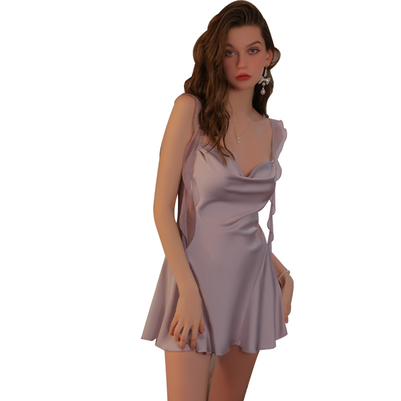 瑰若时尚飘带低胸荡领镂空纯欲露背性感深V吊带女睡裙家居服3852