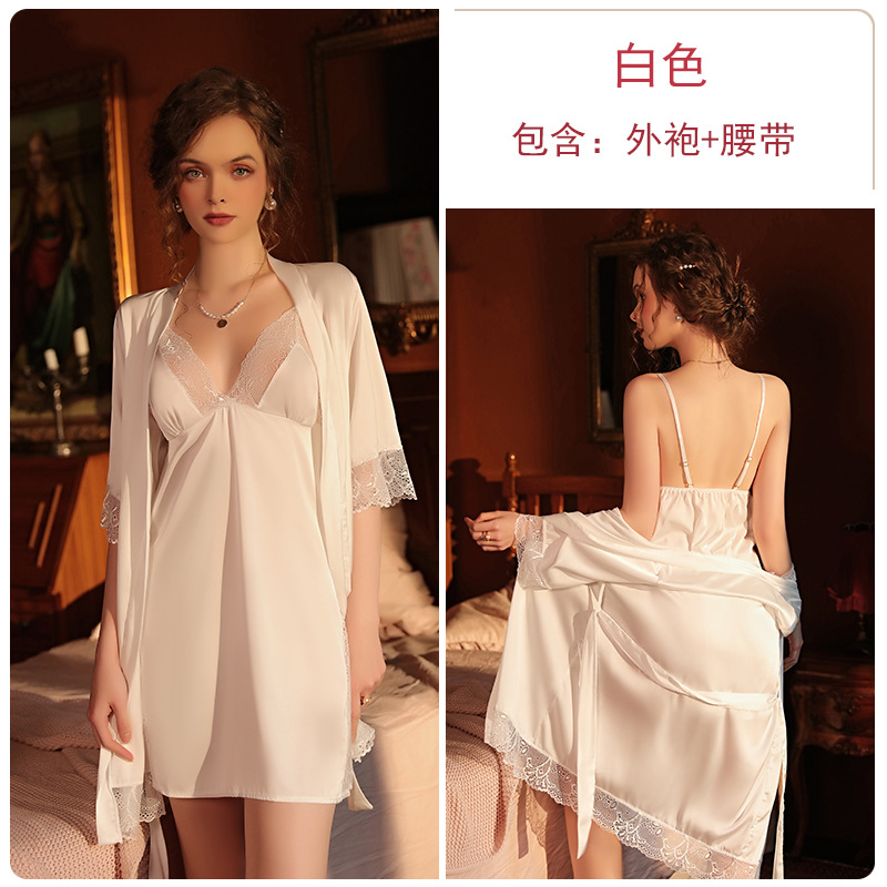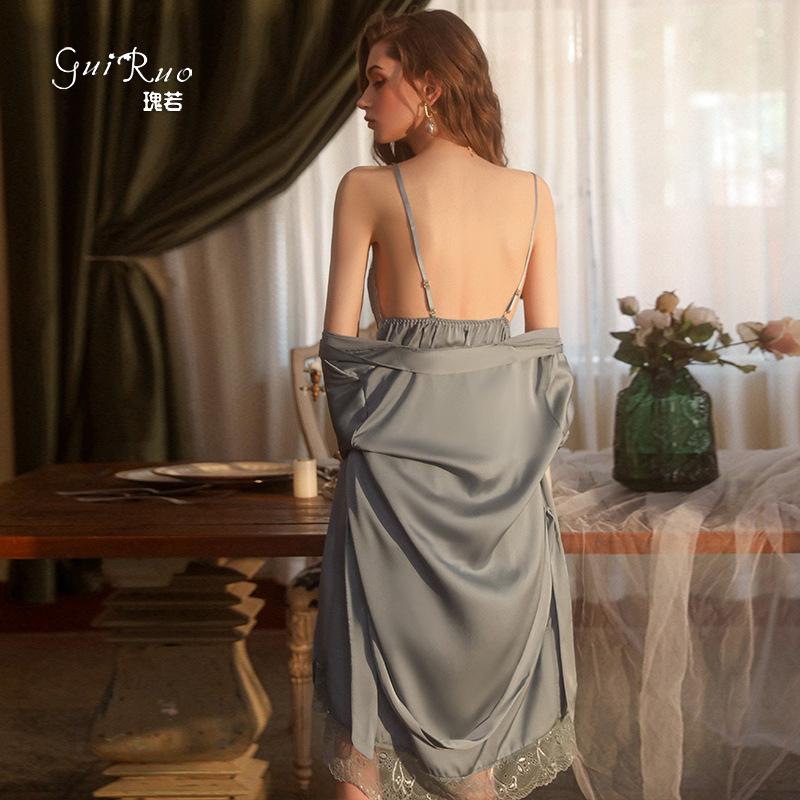 瑰若春夏舒适睡衣纯色蕾丝睡衣开叉吊带裙系带外袍家居服套装245