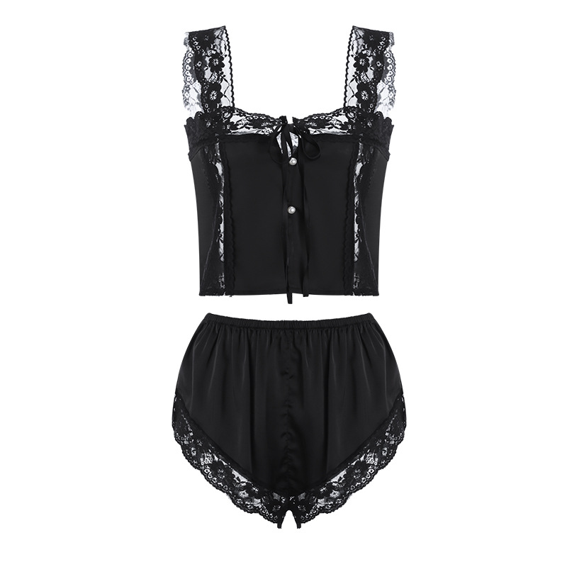 瑰若品牌纯欲吊带睡衣缎面女薄款短裤蕾丝魅力诱惑家居服套装2507