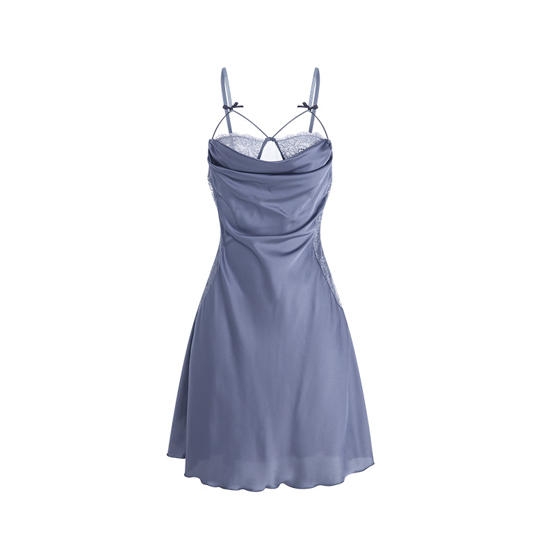 DZ瑰若缎面深V蕾丝透视时尚荡领收腰吊带裙舒适外袍家居套装3472