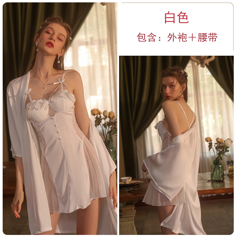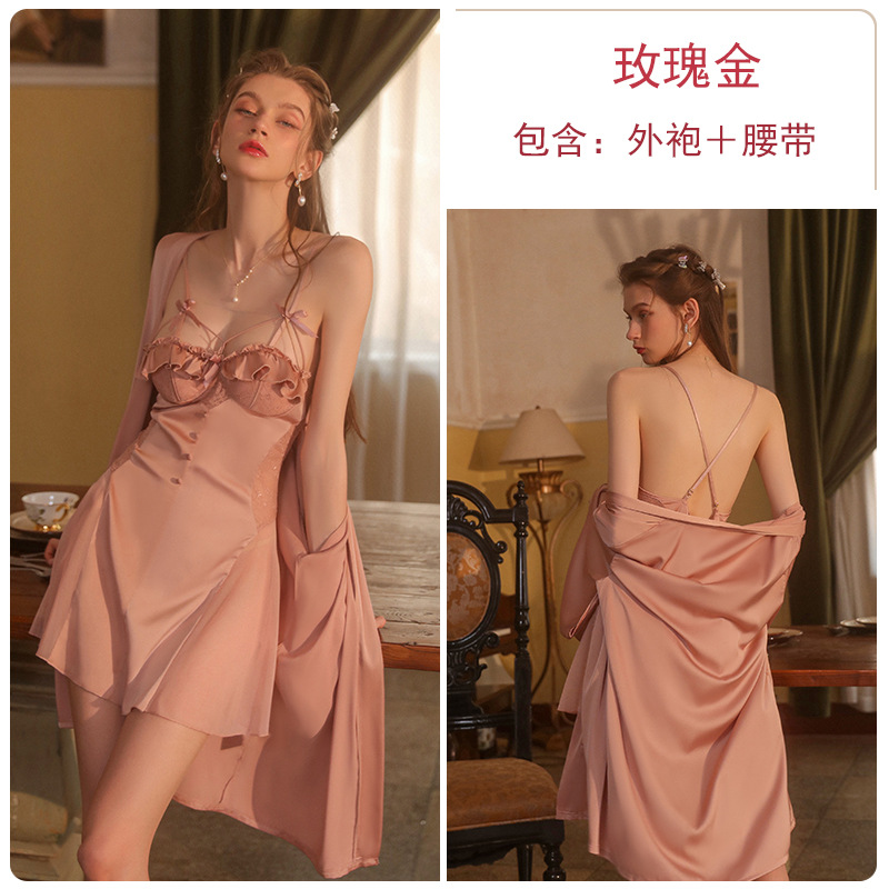 瑰若性感露背冰丝舒适纯色睡衣聚拢胸垫吊带裙外袍家居服套装2227