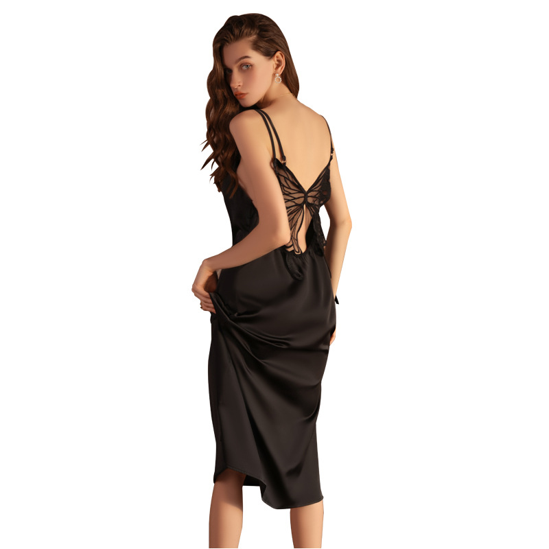 瑰若纯欲蝴蝶蕾丝时尚荡领修身显瘦长款缎面吊带睡裙女家居服4023