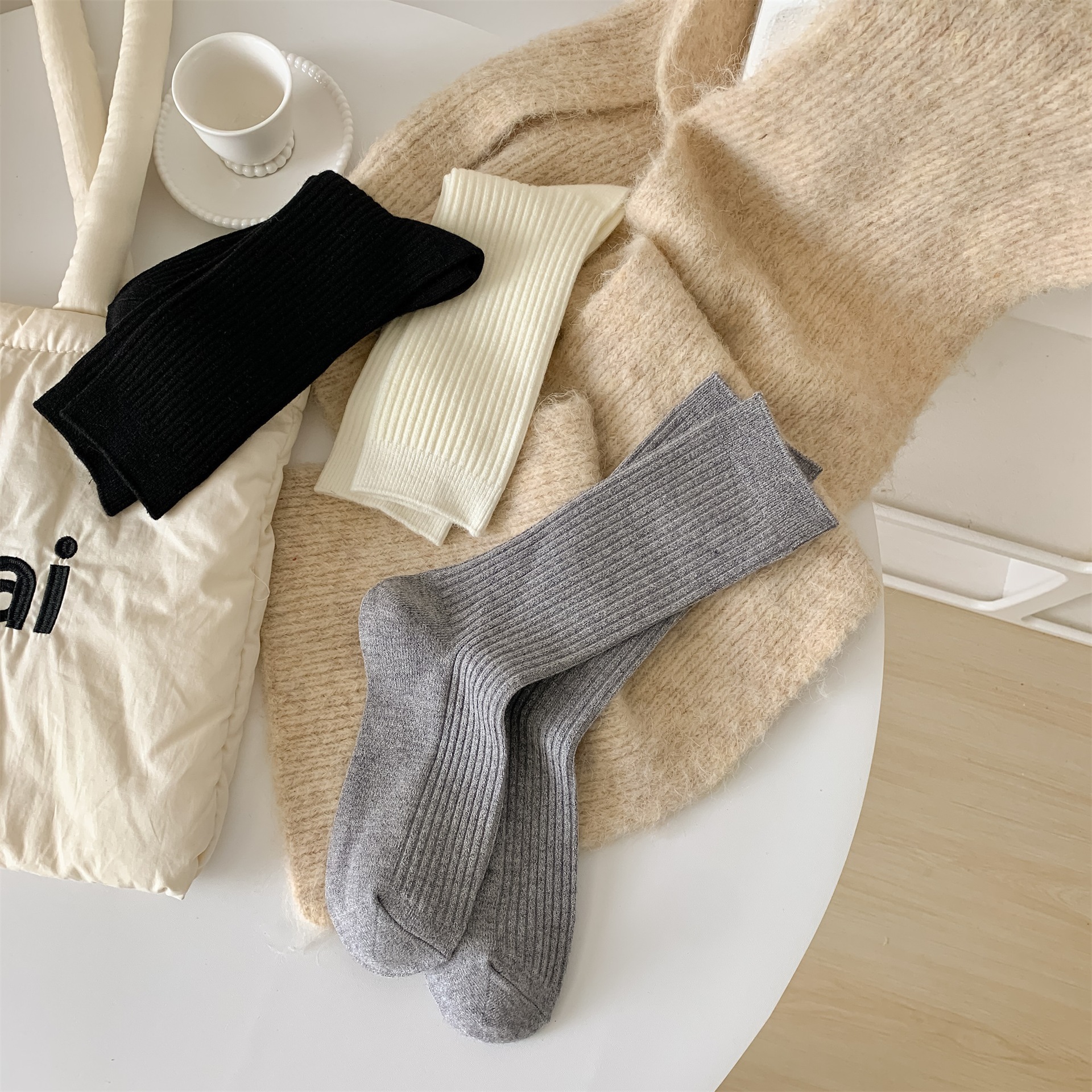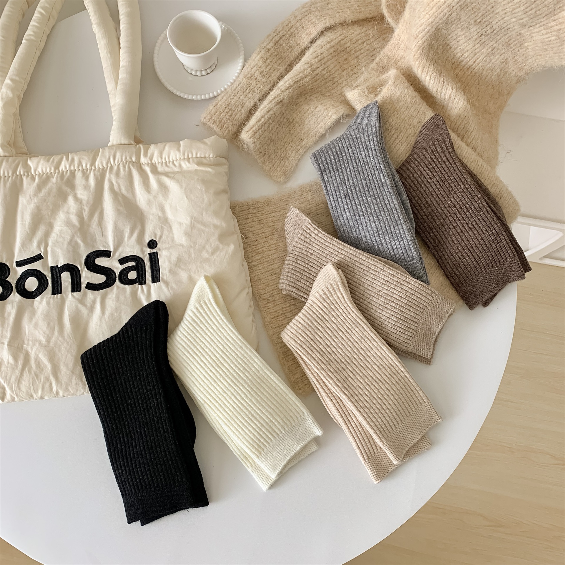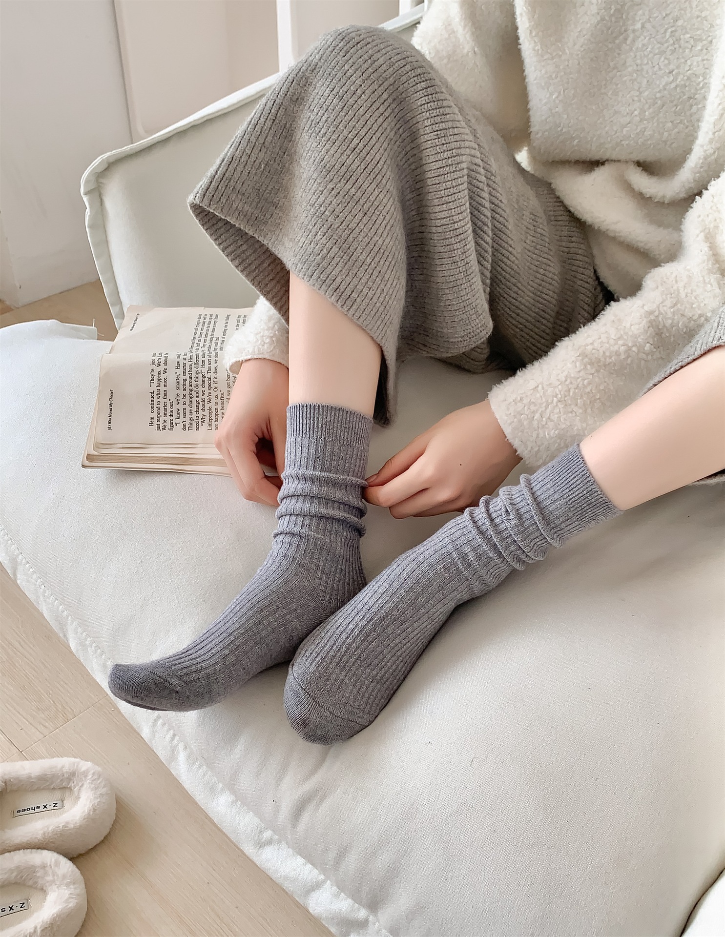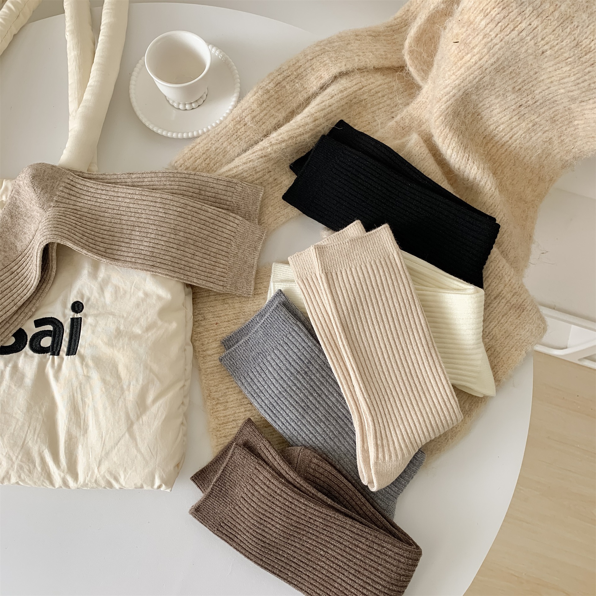 羊毛袜子女秋冬美拉德纯色竖条纹羊毛中筒袜加厚保暖堆堆长袜女士