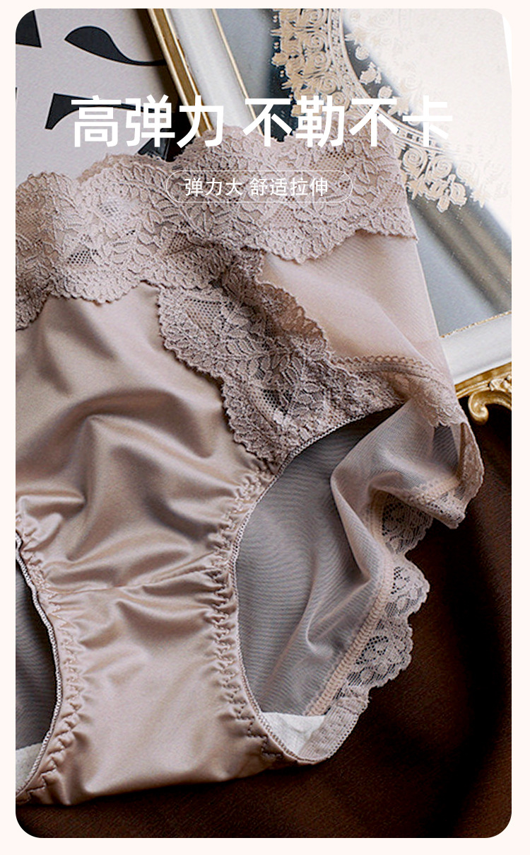 中高腰丝滑缎面蕾丝女士内裤冰丝透气网纱包臀中高腰款内裤