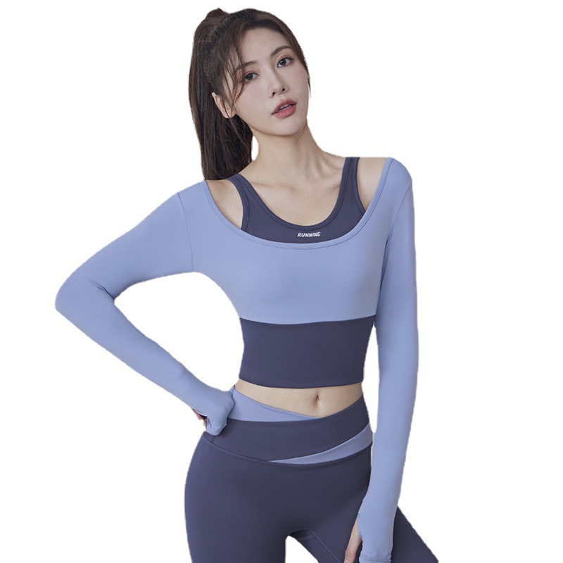 外贸速干跑步健身服运动紧身带胸垫假两件上衣女长袖露肚脐瑜伽服