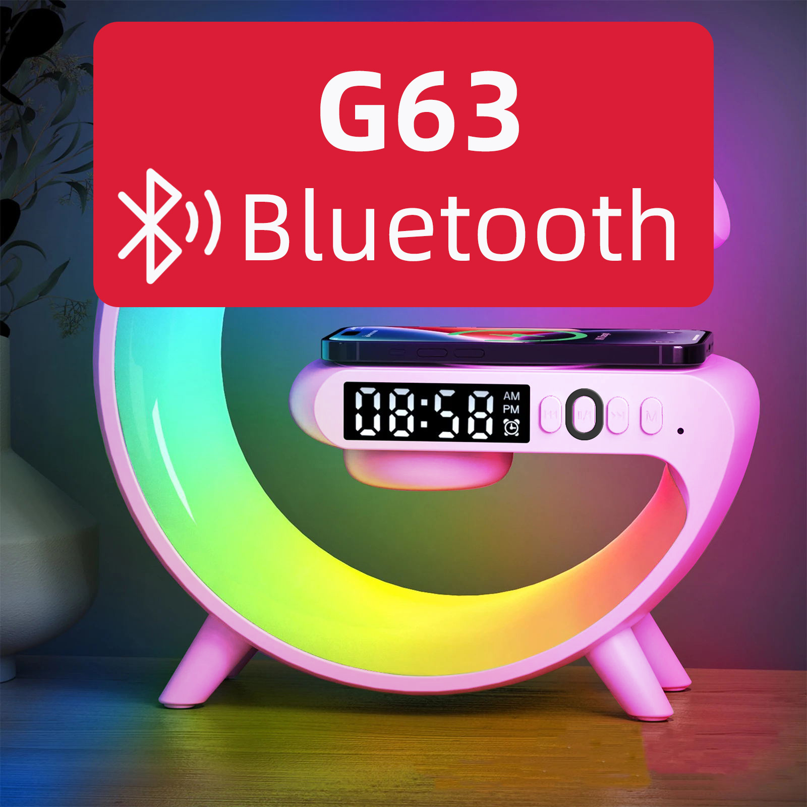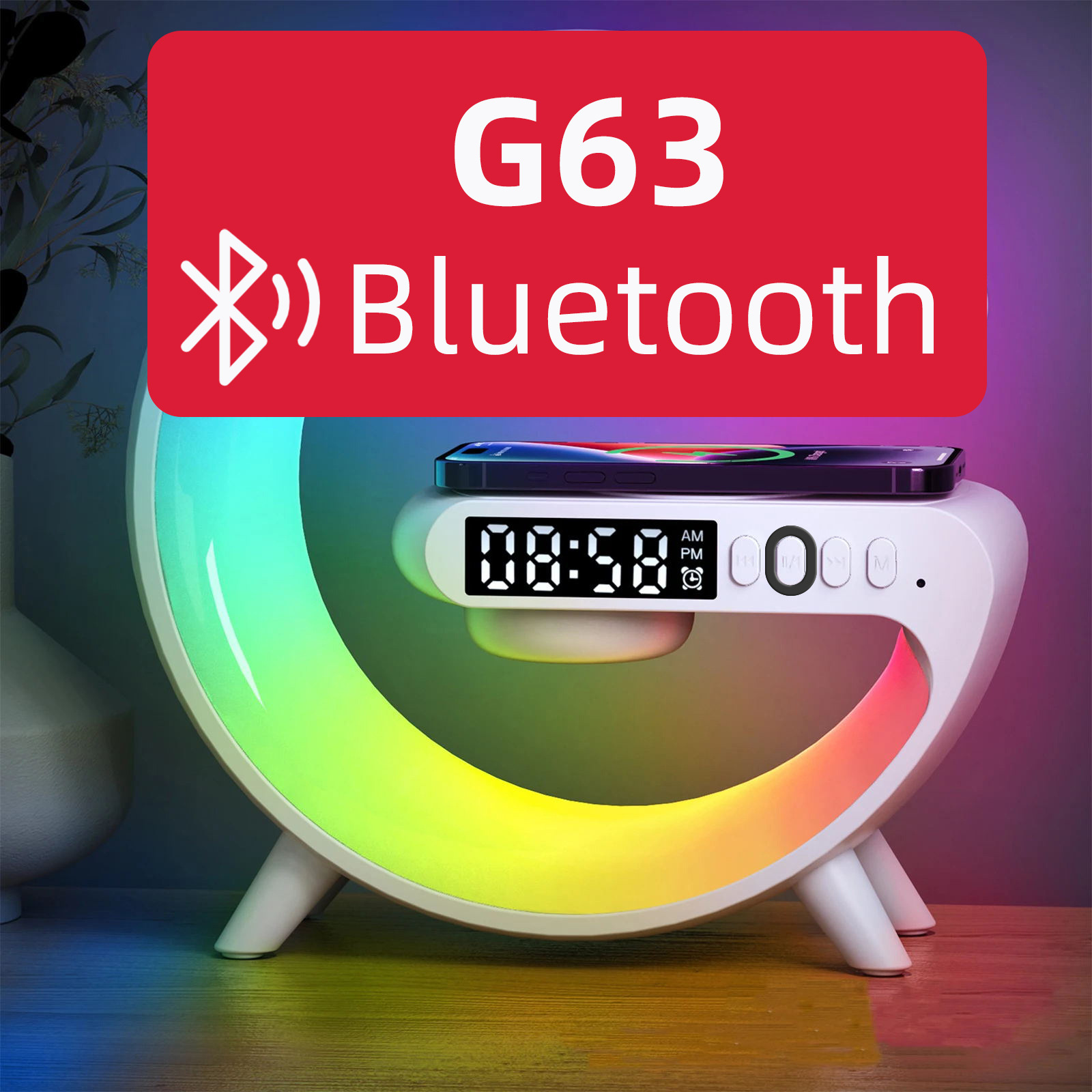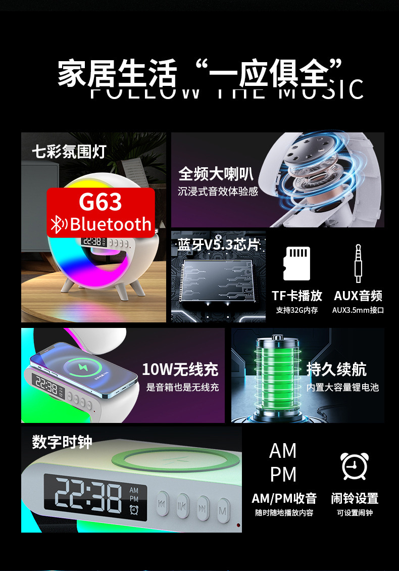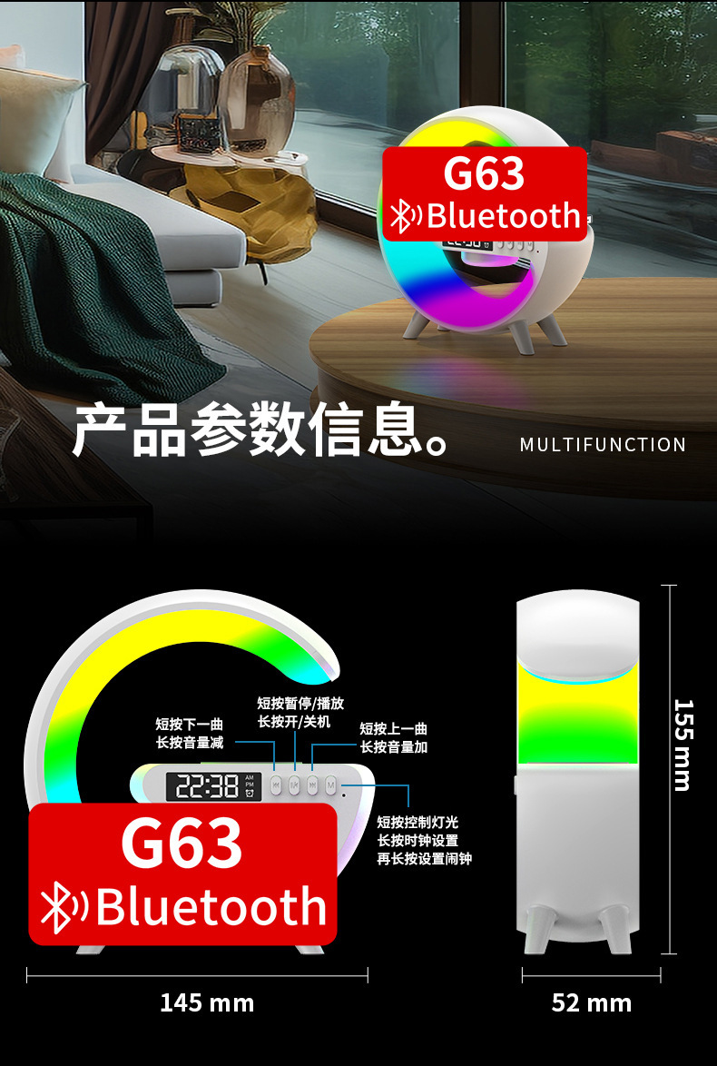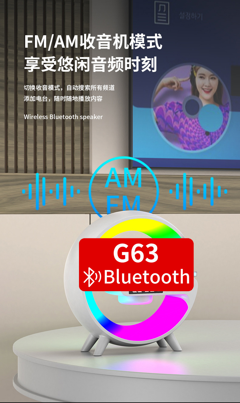 音响蓝牙 爆款小G63炫彩带时钟灯床头无线充蓝牙音箱多功能蓝牙音