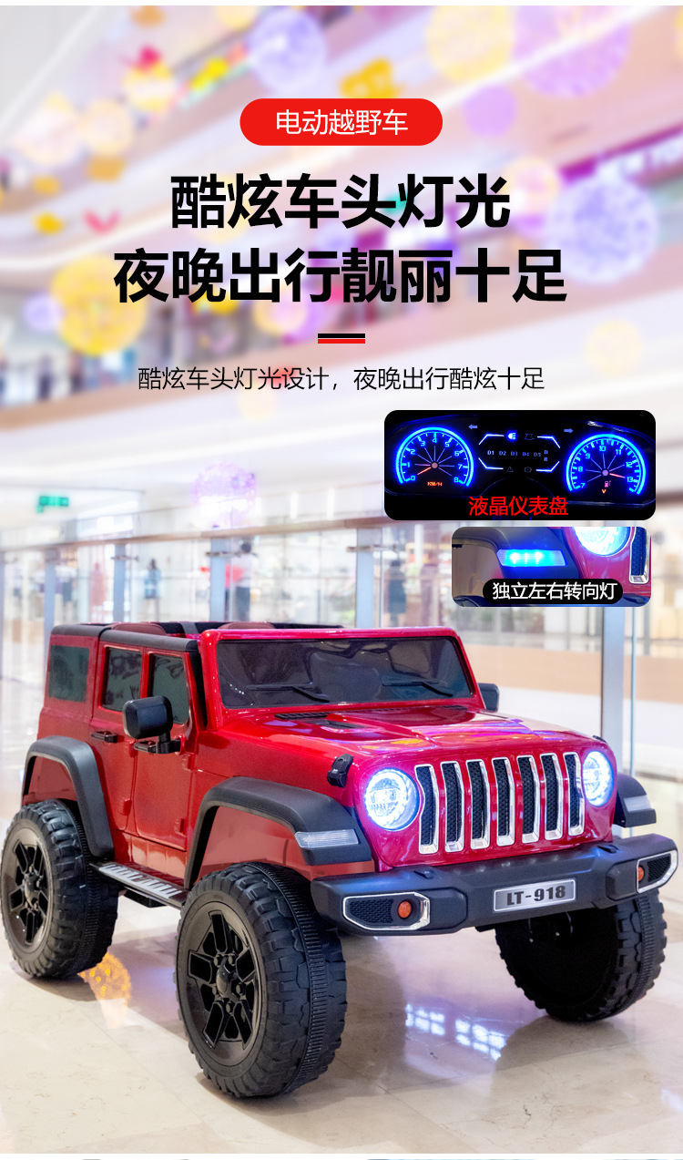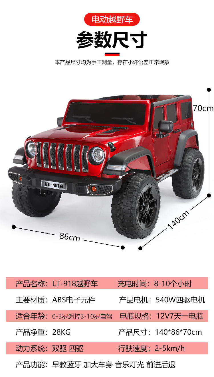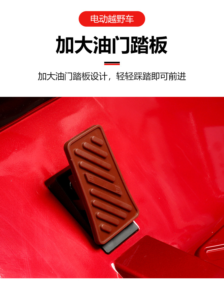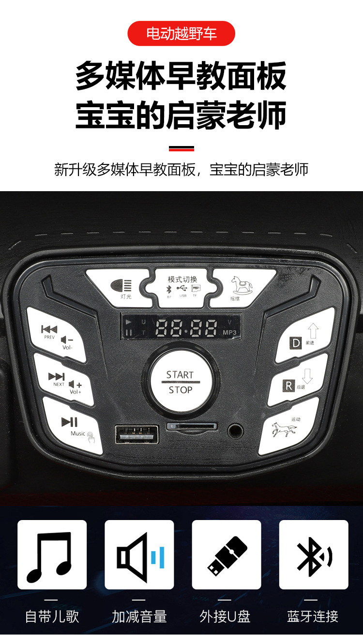 12v7天一超 大电瓶,便捷式独立充 电(可拆卸电瓶),(540 四驱驱动电机),(普通 配置540双驱驱动),分 体式双人座椅,便捷式 拉杆,电子摇摆,四轮避震,无极调速油门,仿真转向灯效果, 2.4G蓝牙一对一遥控,高档内饰,仿真动 态液晶仪表盘,一键启动,音乐早教,高清喇叭,电量显示,一键安 装仿真多功能方向盘,蓝牙中控,USB插孔, TF插孔,AUX输入插孔,体验真车动感,