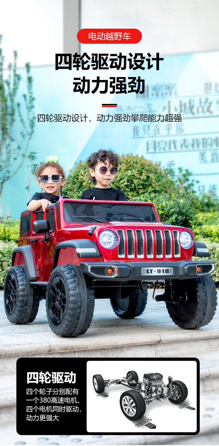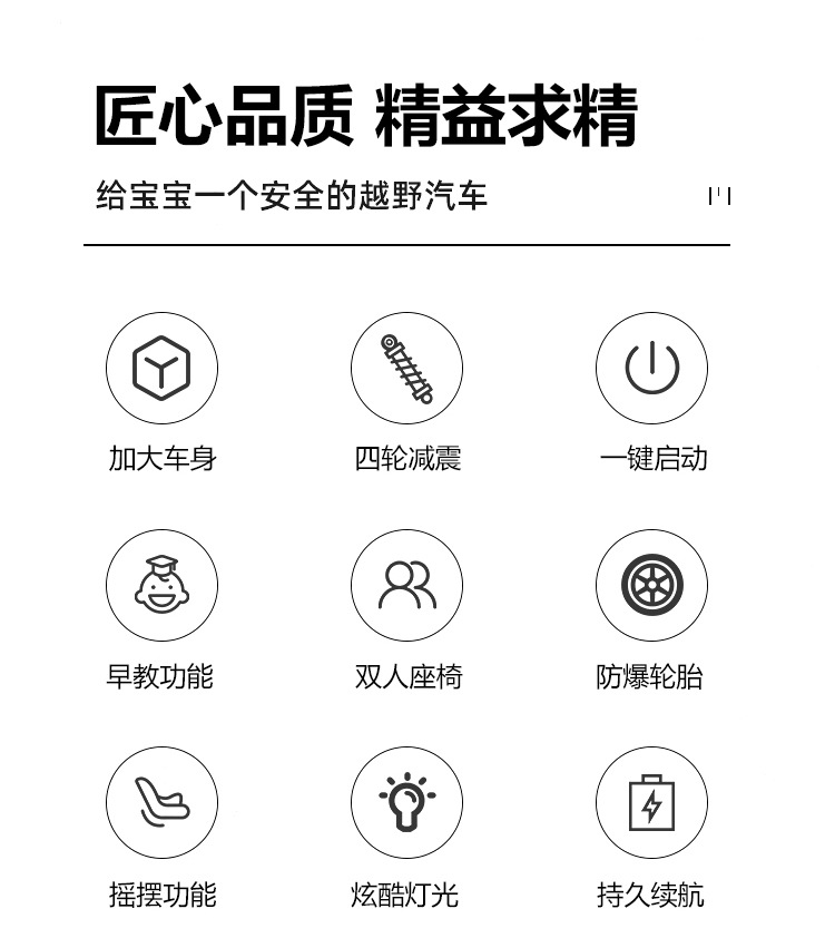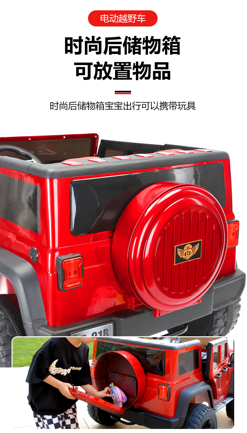 12v7天一超 大电瓶,便捷式独立充 电(可拆卸电瓶),(540 四驱驱动电机),(普通 配置540双驱驱动),分 体式双人座椅,便捷式 拉杆,电子摇摆,四轮避震,无极调速油门,仿真转向灯效果, 2.4G蓝牙一对一遥控,高档内饰,仿真动 态液晶仪表盘,一键启动,音乐早教,高清喇叭,电量显示,一键安 装仿真多功能方向盘,蓝牙中控,USB插孔, TF插孔,AUX输入插孔,体验真车动感,