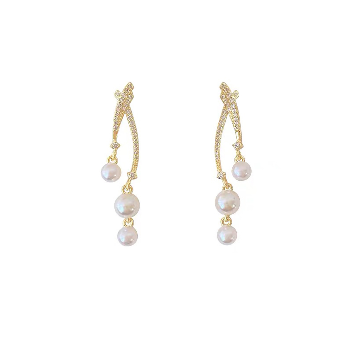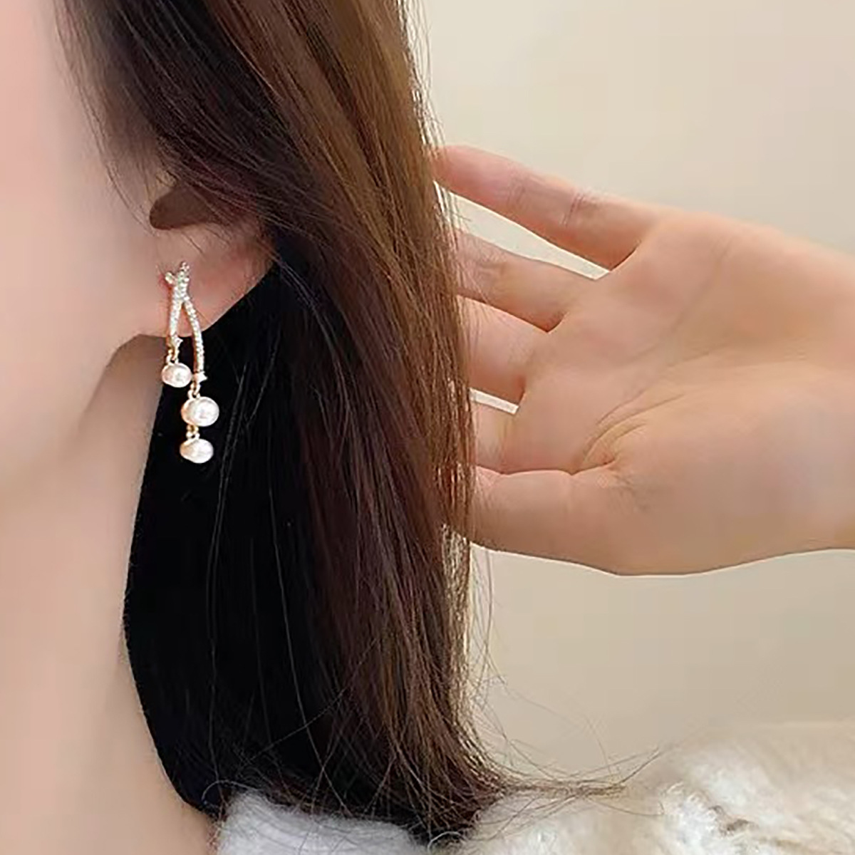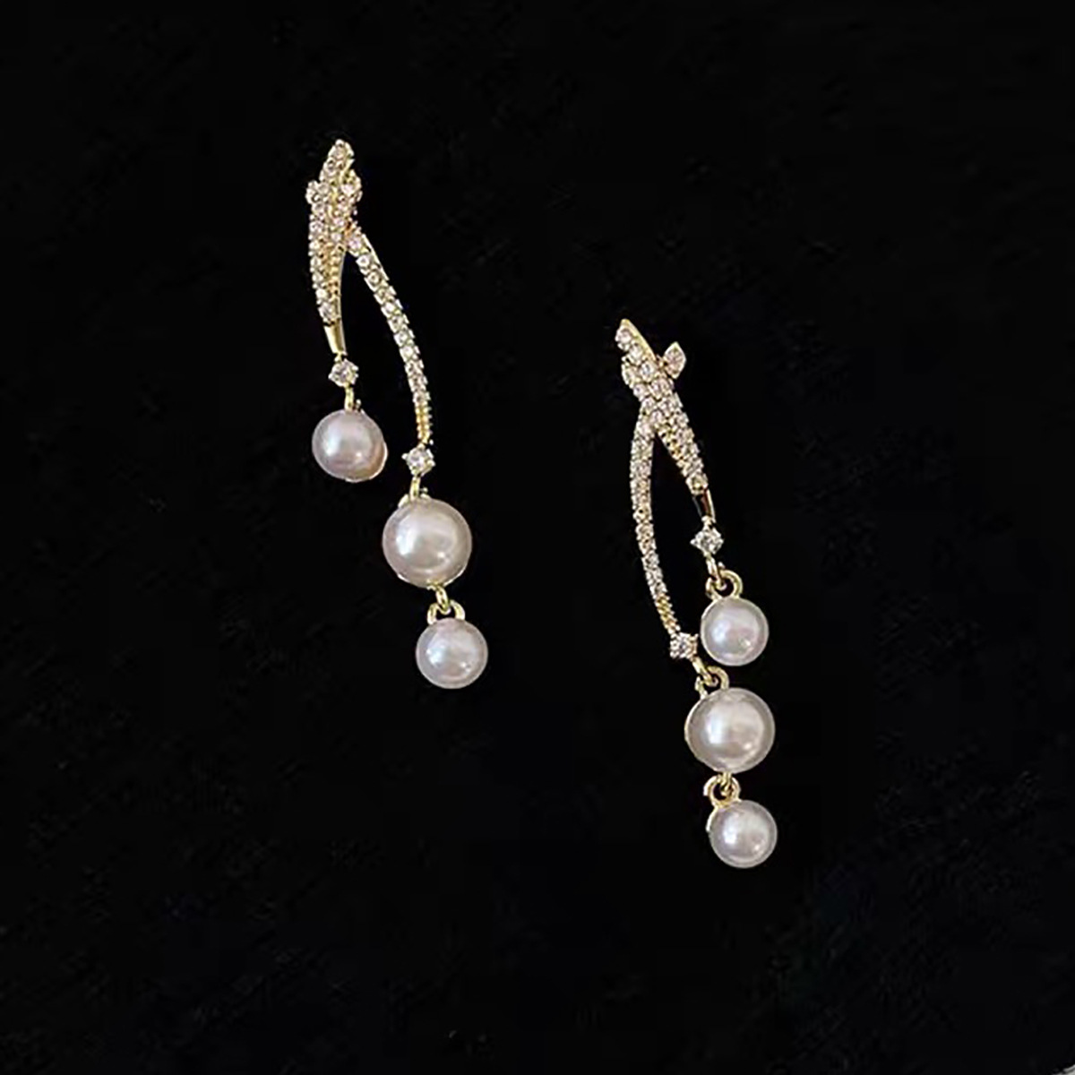 S925银针时尚简约法式高级感几何镶钻仿珍珠耳坠气质个性耳环耳饰