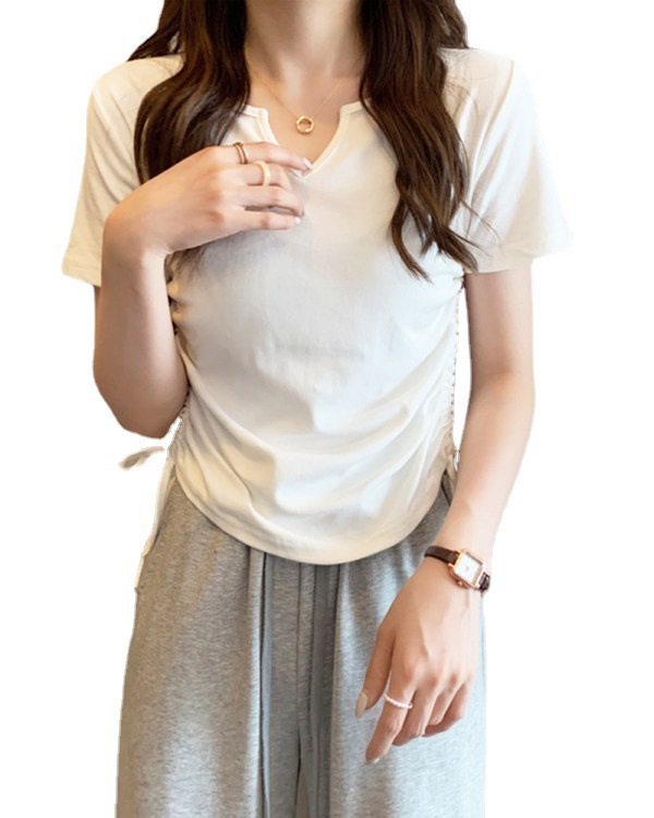 设计感V领抽绳修身纯欲风短袖T恤女装2024夏季新款纯色学生上衣潮