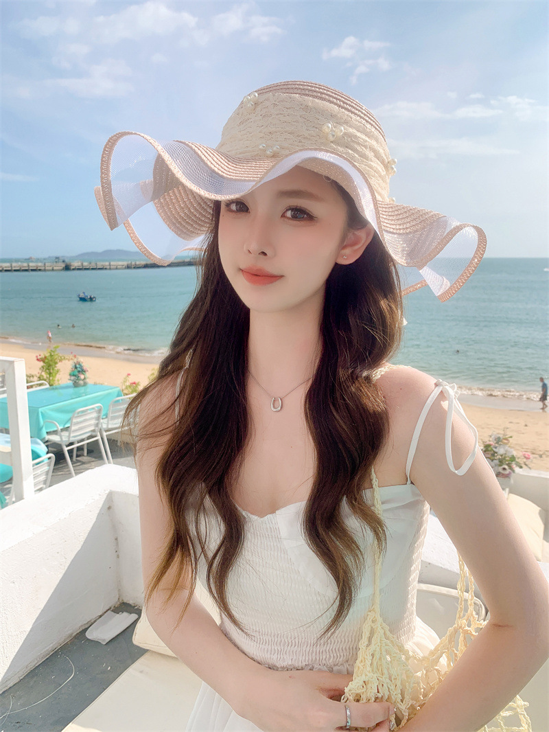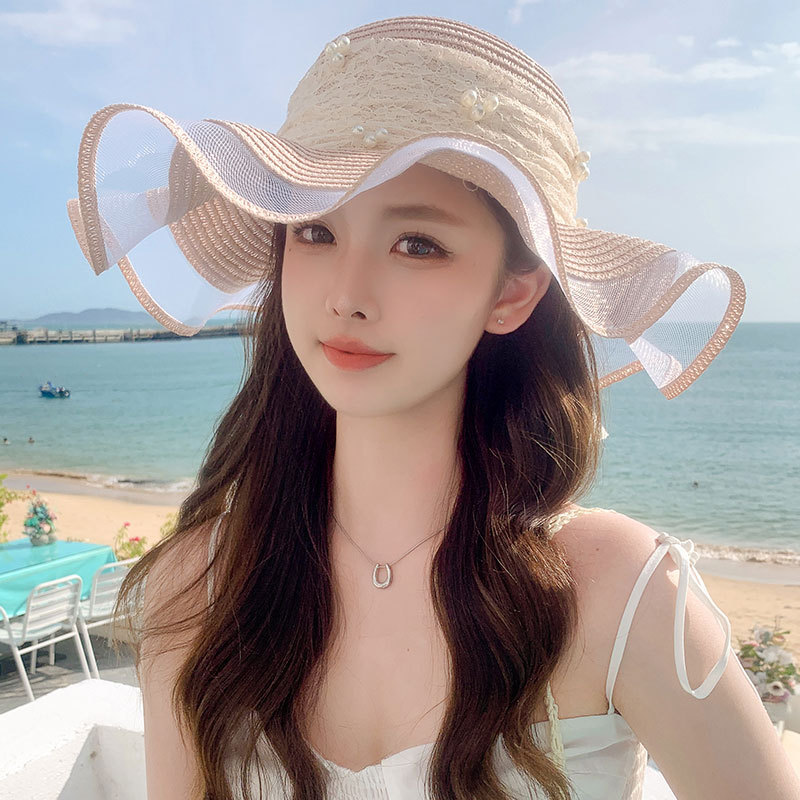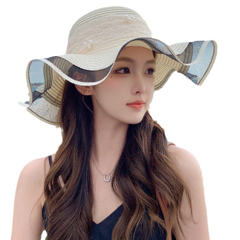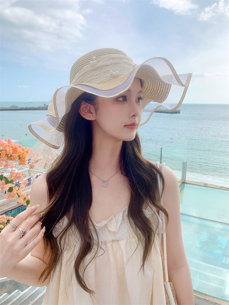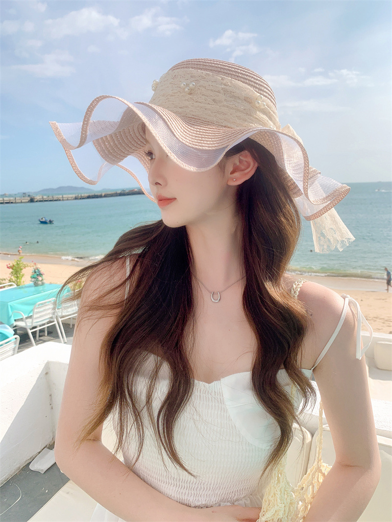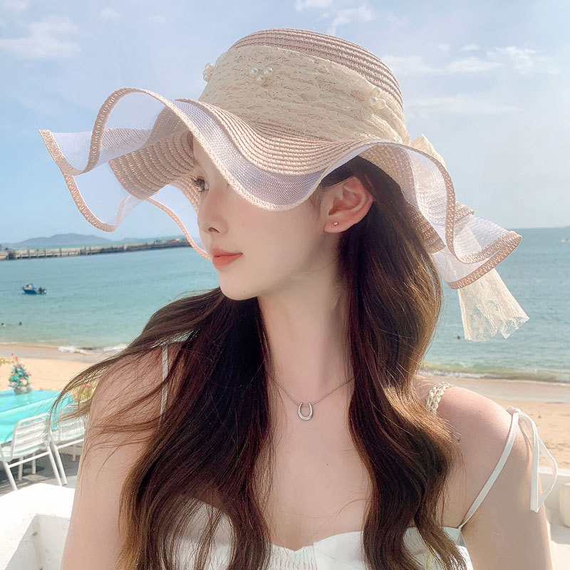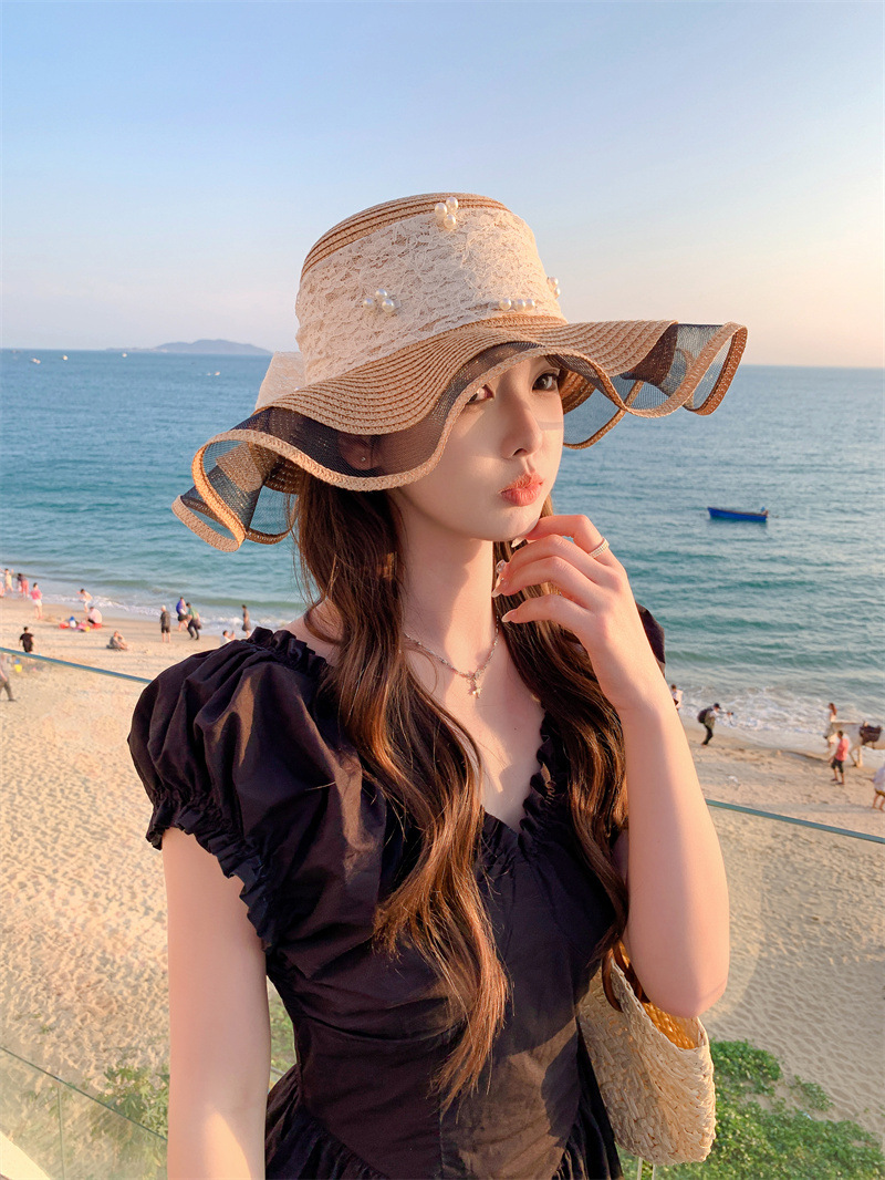 珍珠蕾丝遮阳帽子春夏季女士户外草编防晒渔夫帽韩版潮波浪沿盆帽