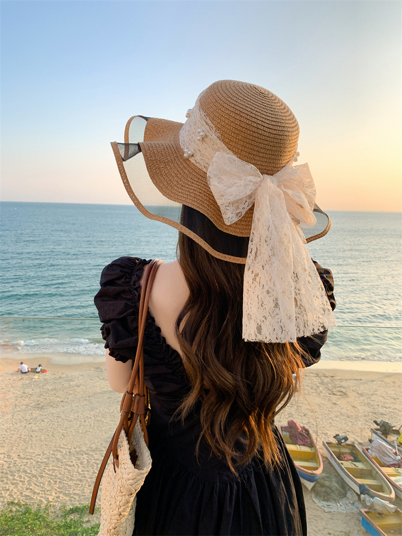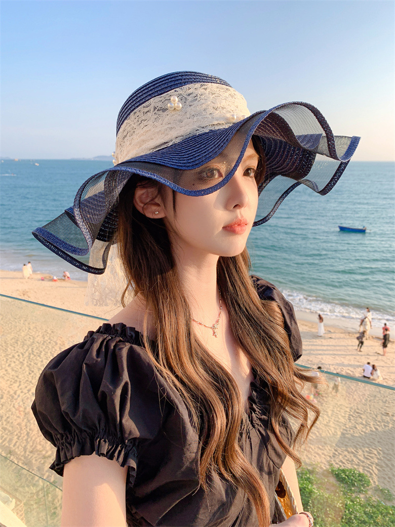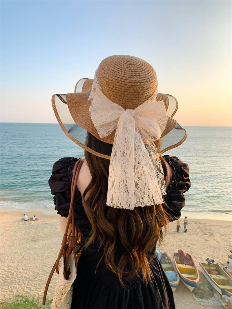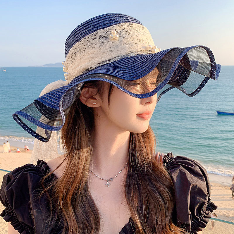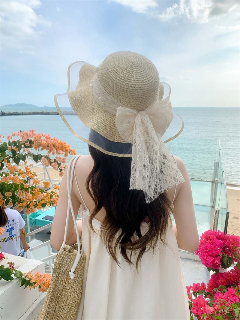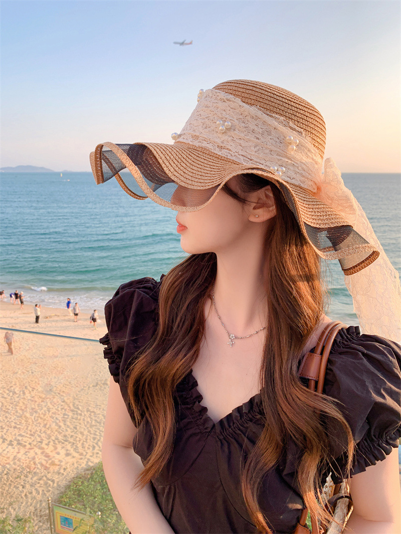 珍珠蕾丝遮阳帽子春夏季女士户外草编防晒渔夫帽韩版潮波浪沿盆帽