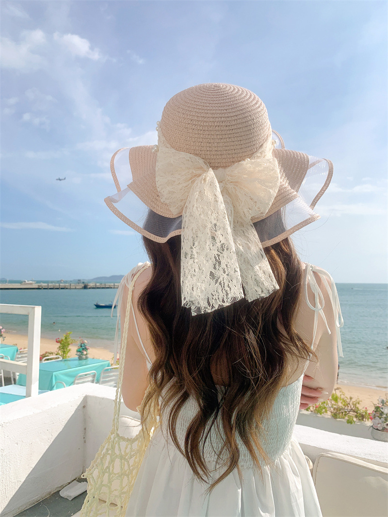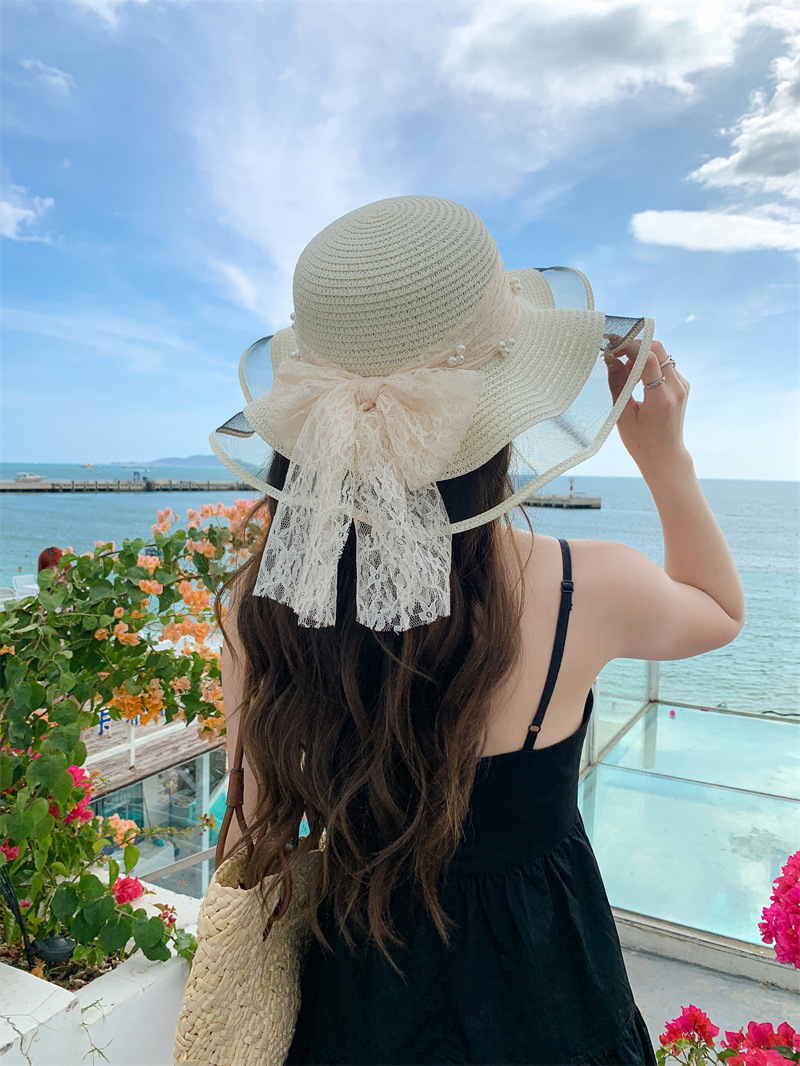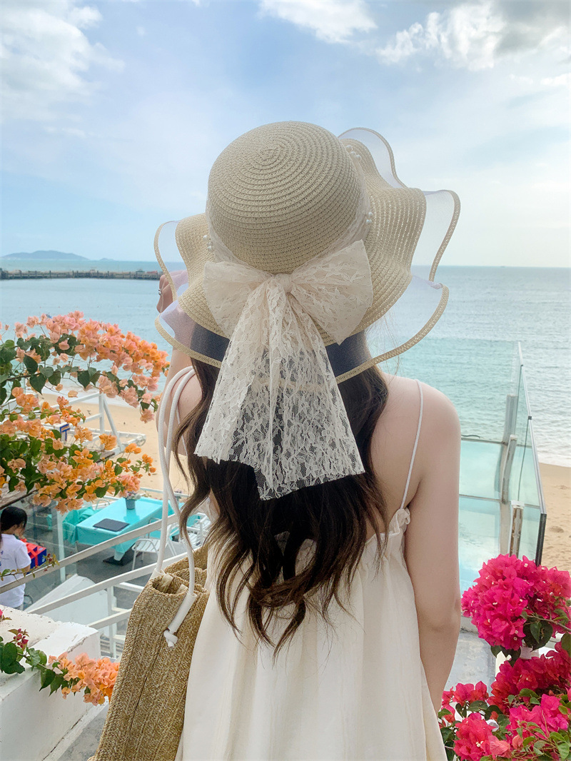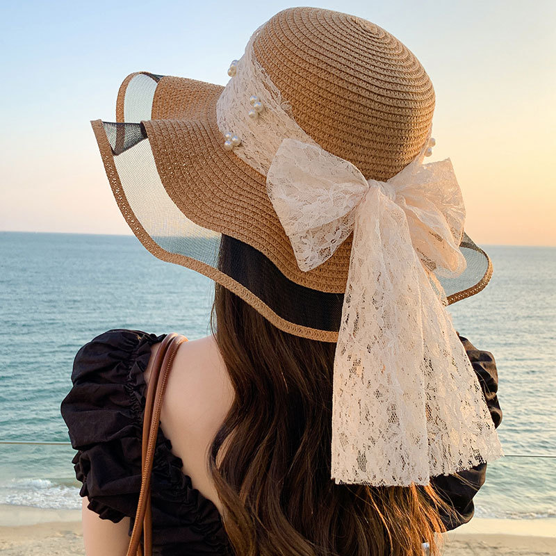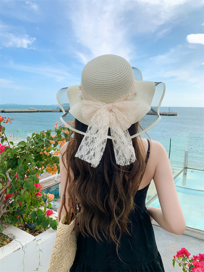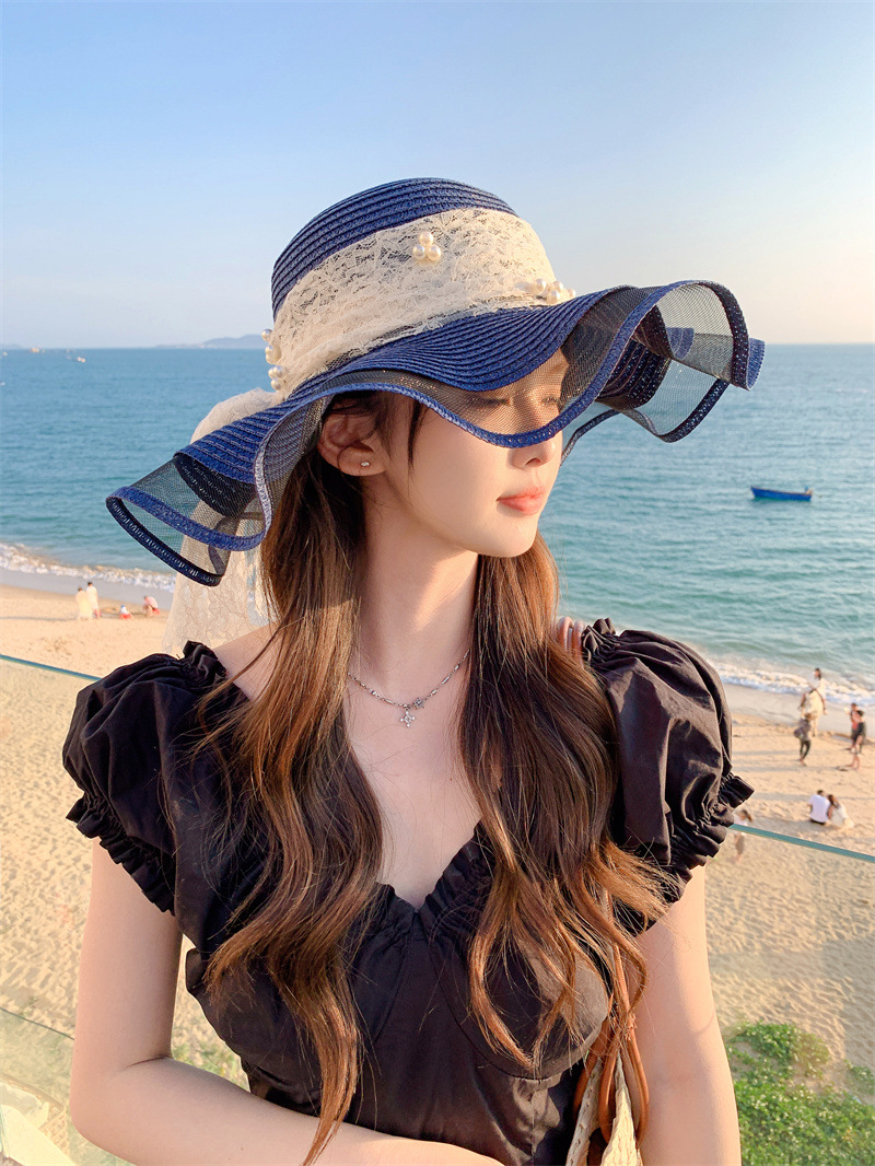 珍珠蕾丝遮阳帽子春夏季女士户外草编防晒渔夫帽韩版潮波浪沿盆帽