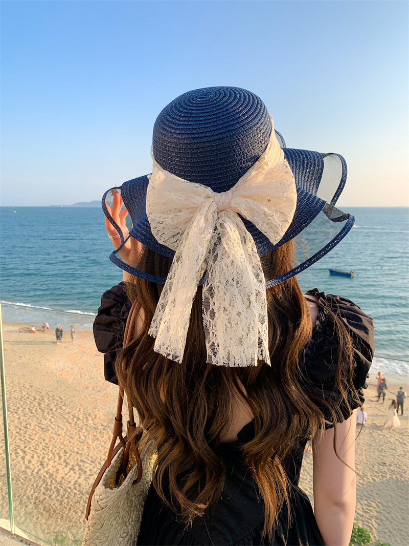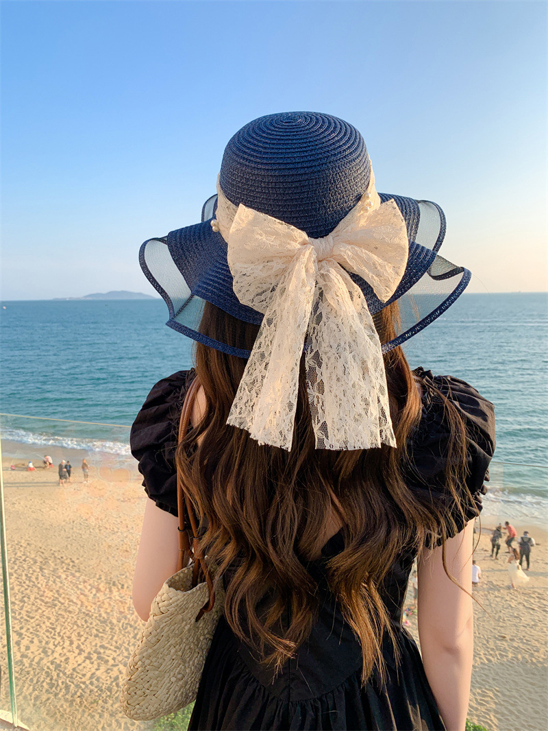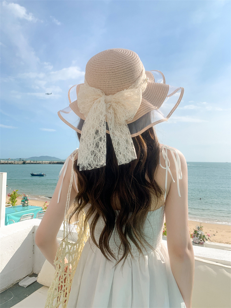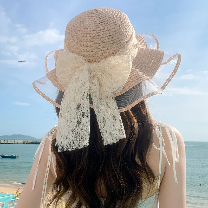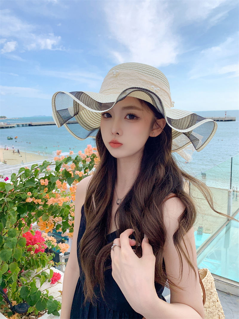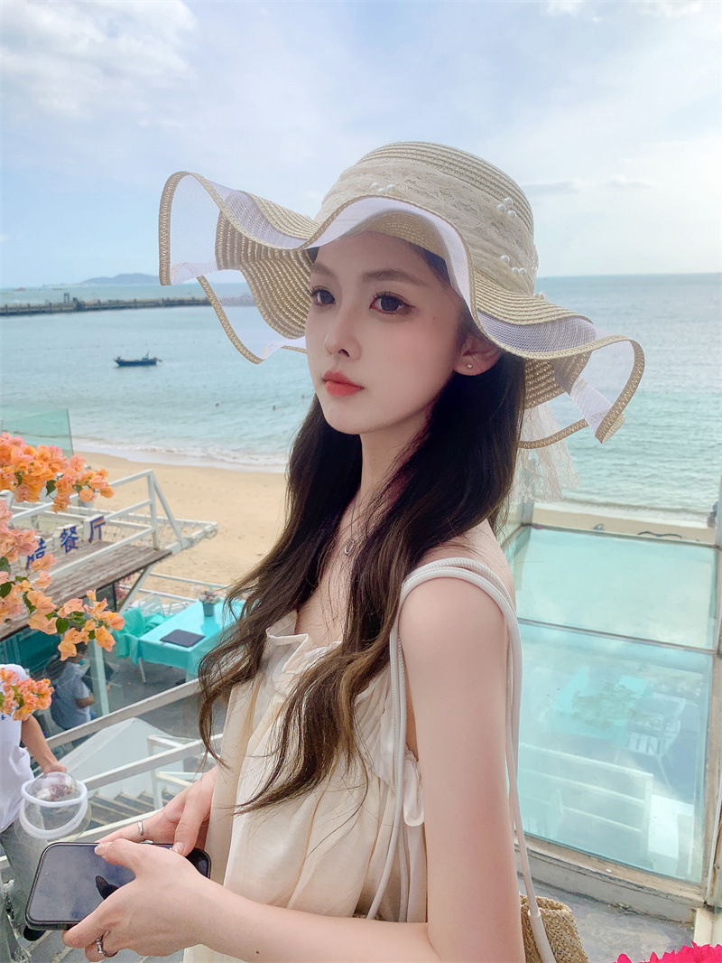 珍珠蕾丝遮阳帽子春夏季女士户外草编防晒渔夫帽韩版潮波浪沿盆帽