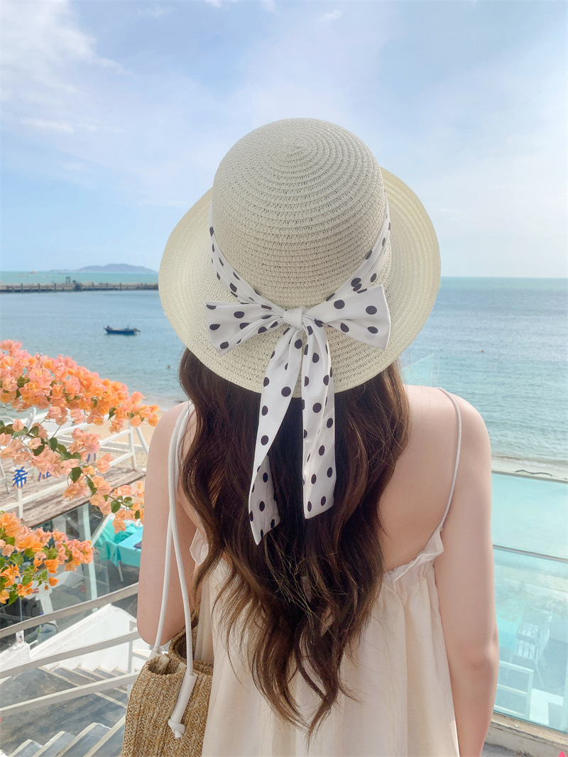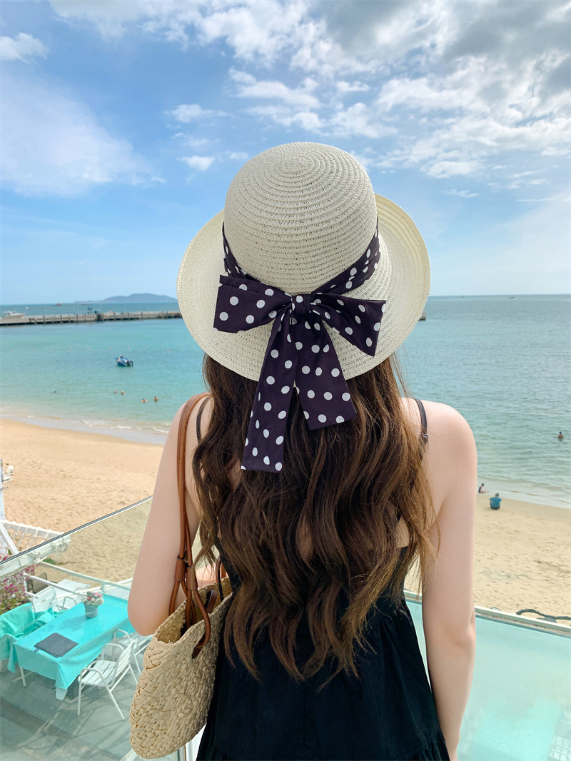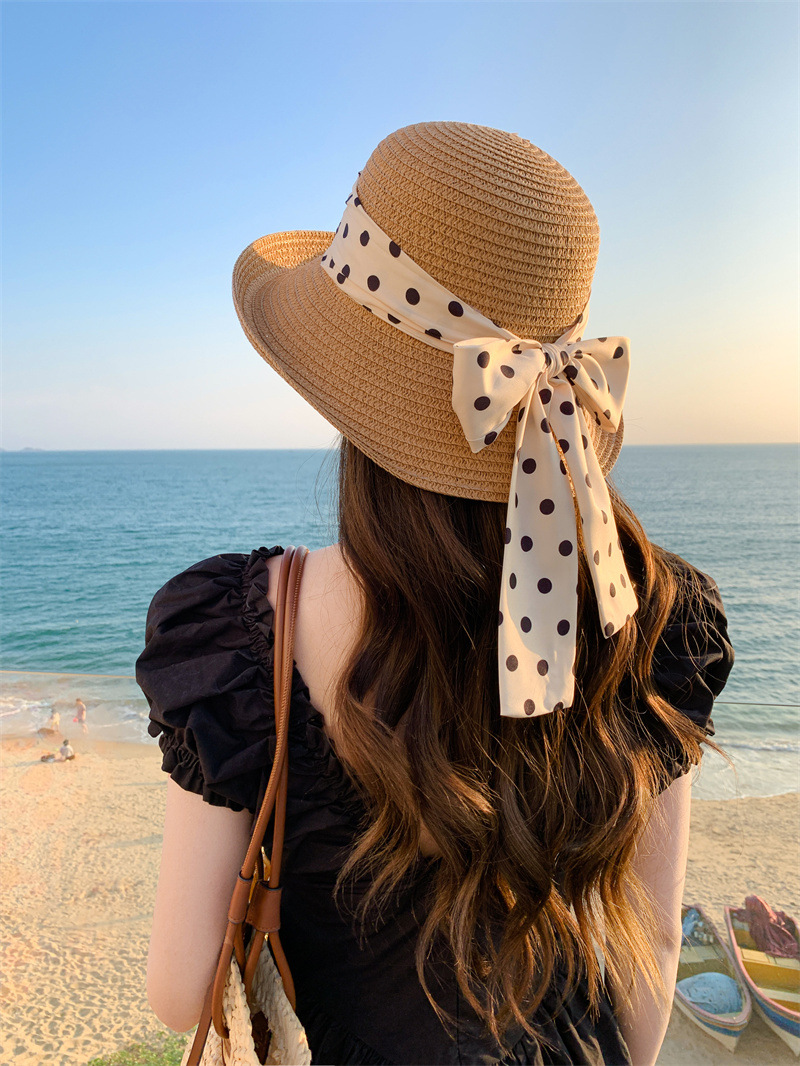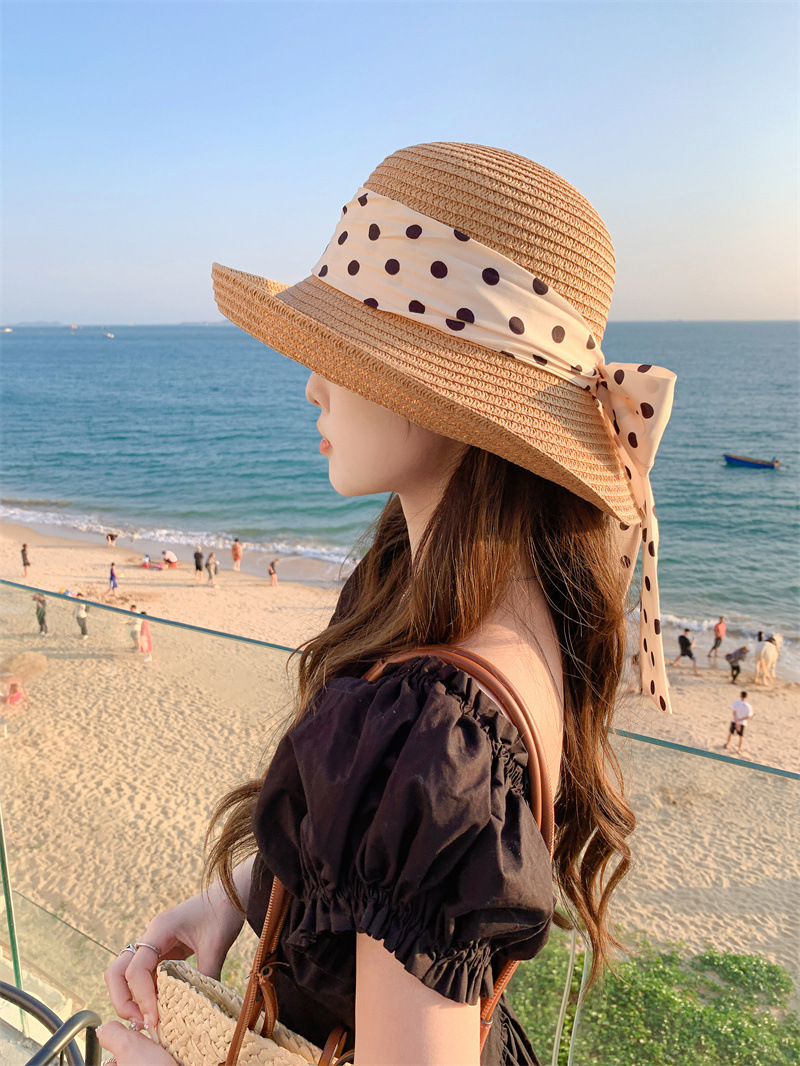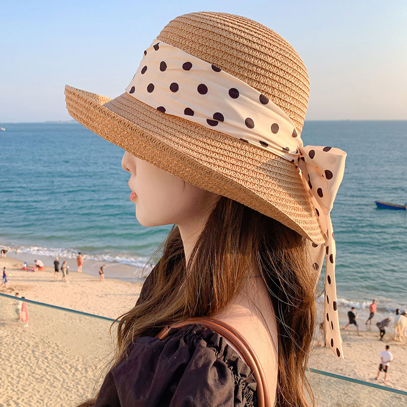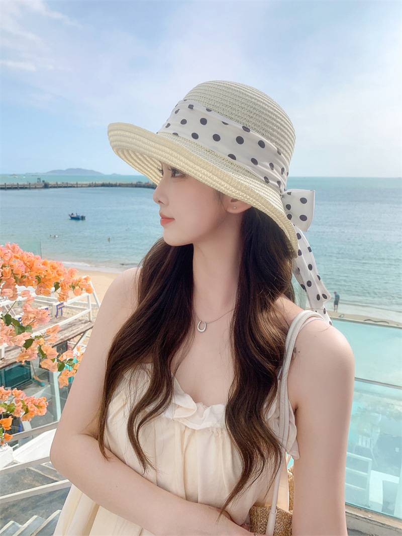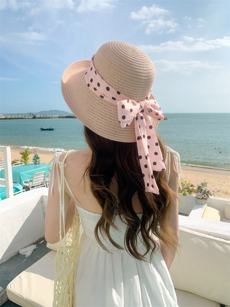 时尚甜美百搭编织草帽女海边遮阳防晒渔夫帽显脸小飘带盆帽春夏帽