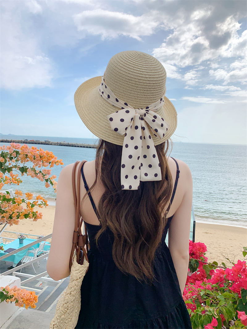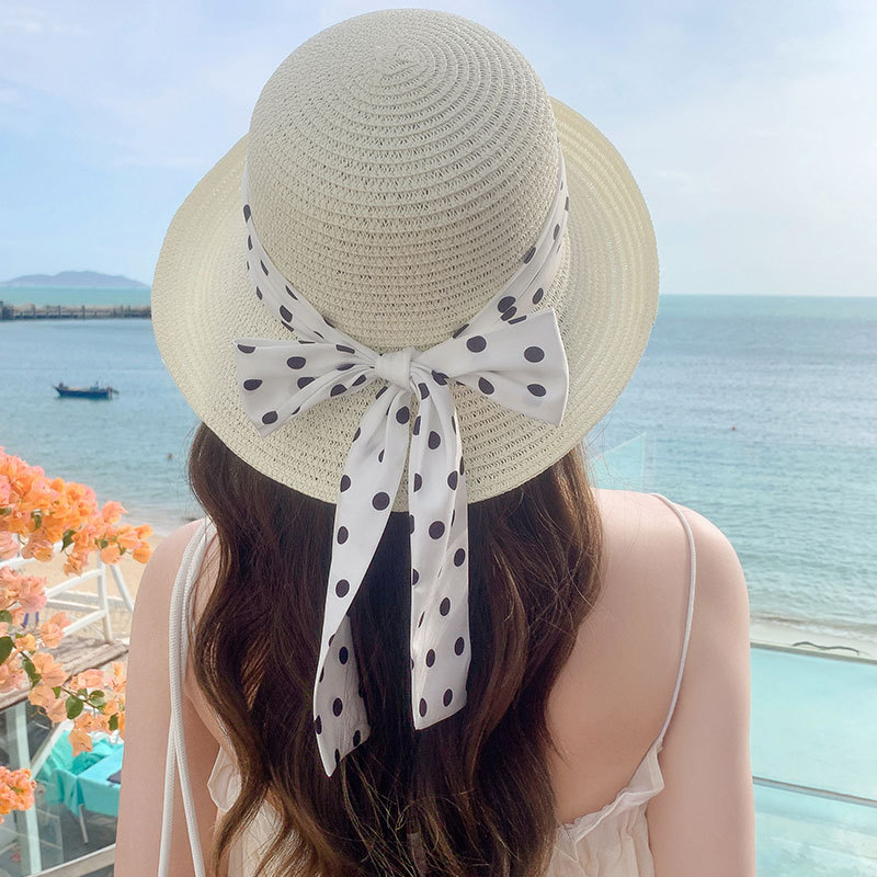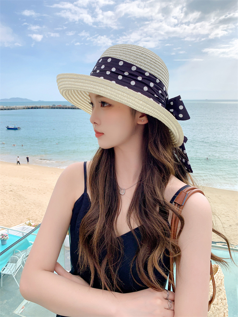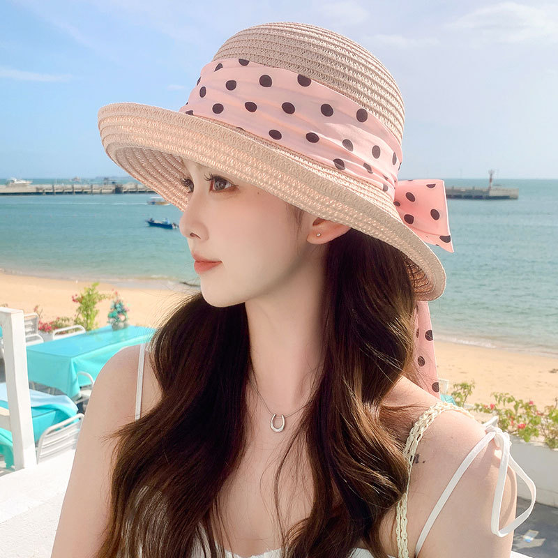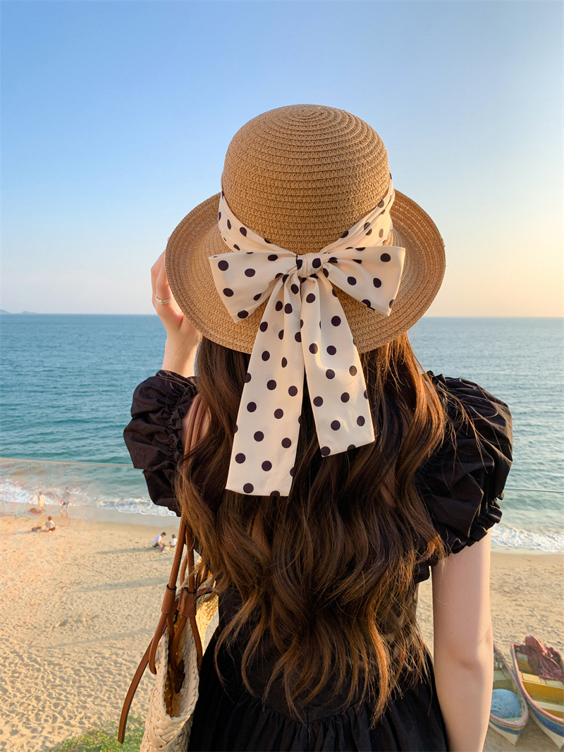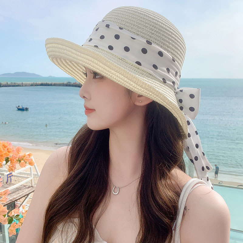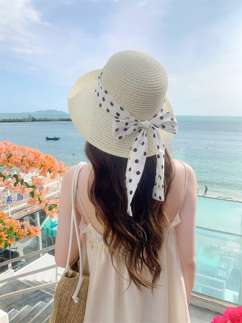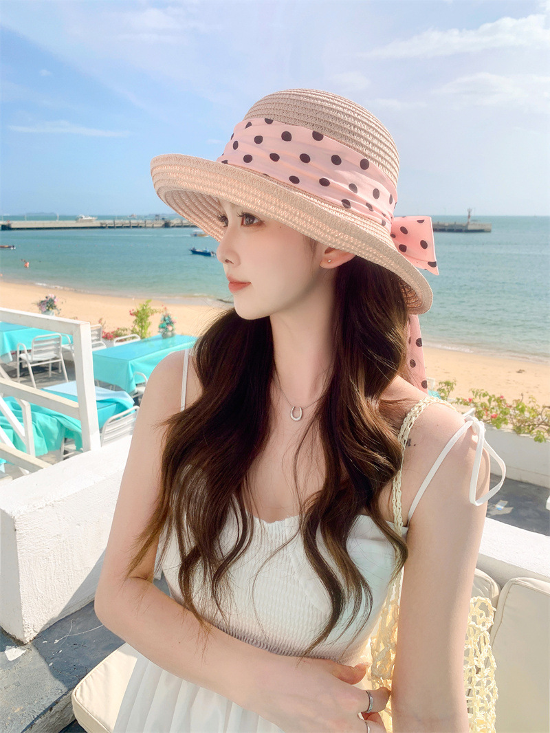 时尚甜美百搭编织草帽女海边遮阳防晒渔夫帽显脸小飘带盆帽春夏帽
