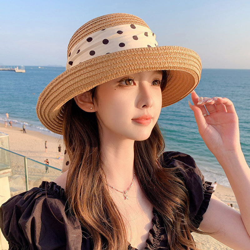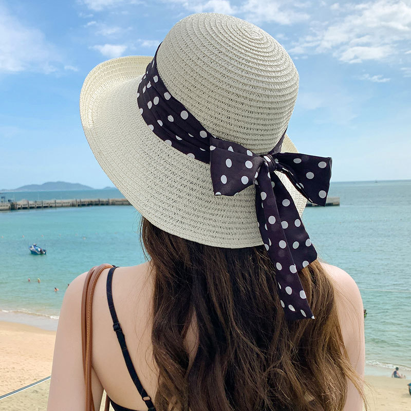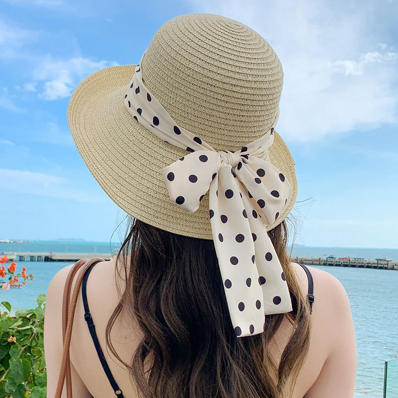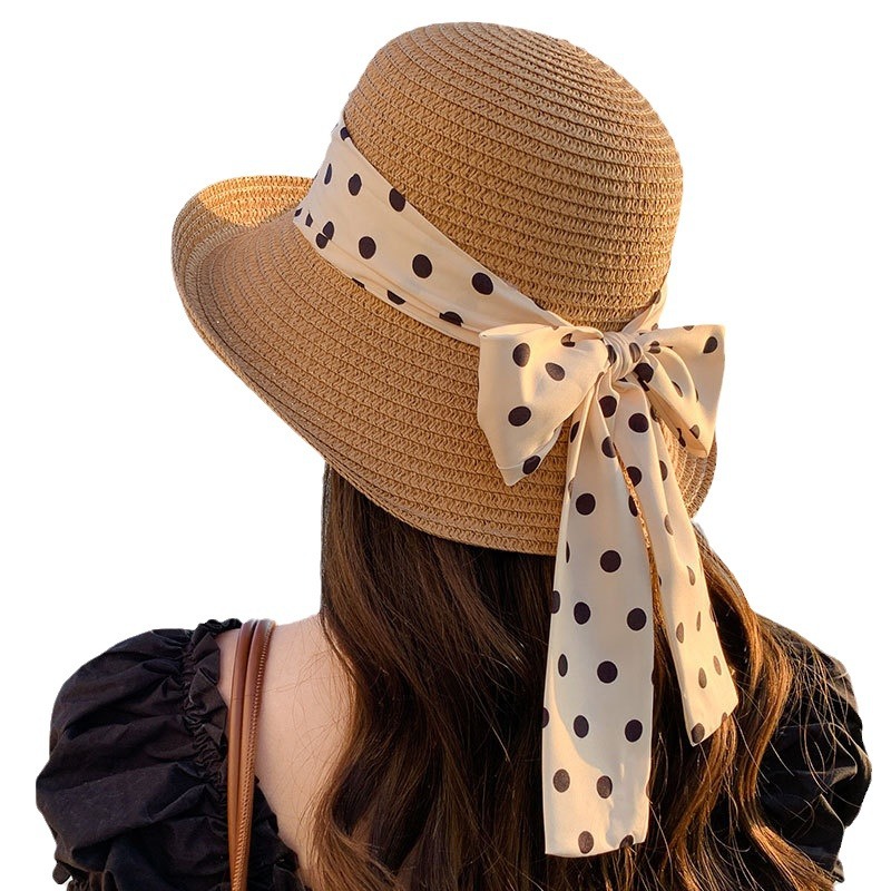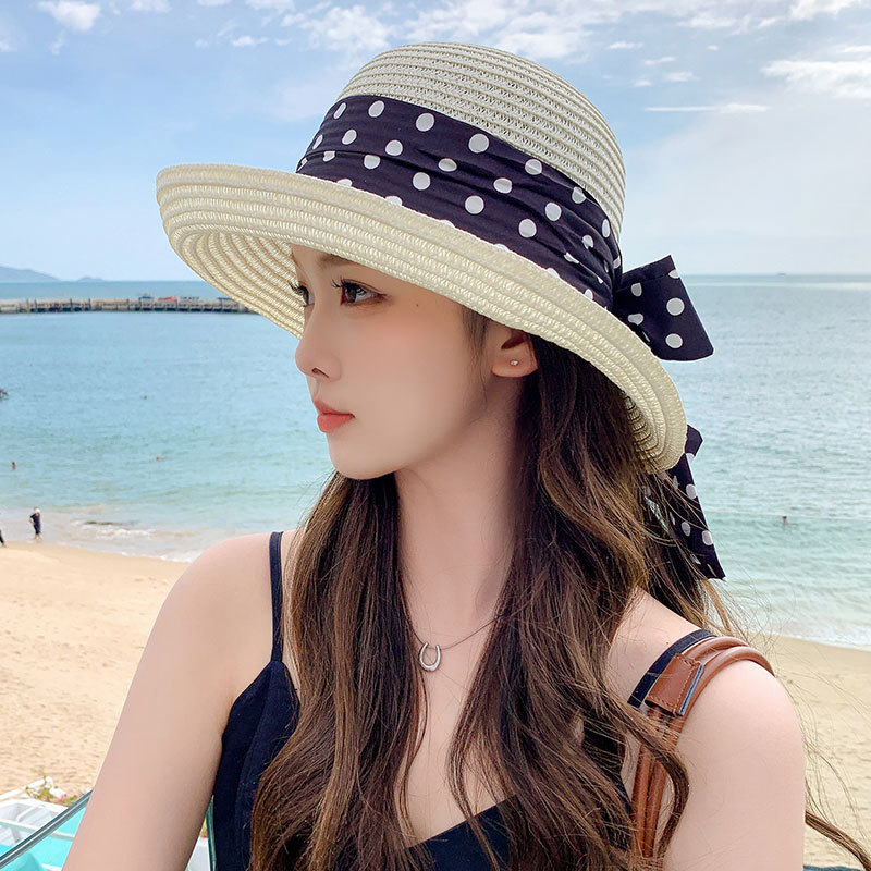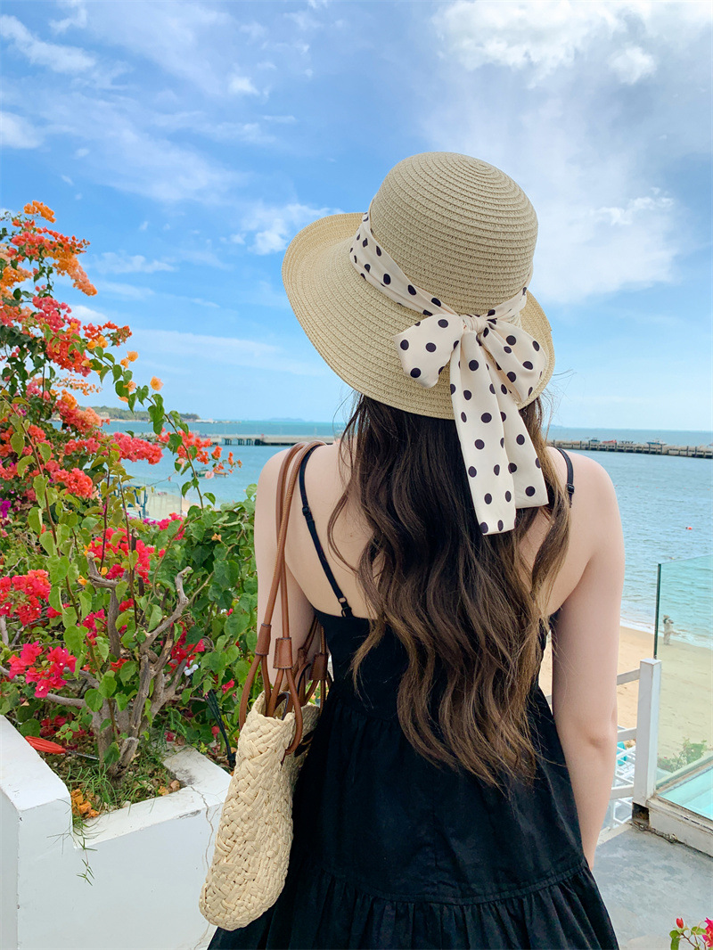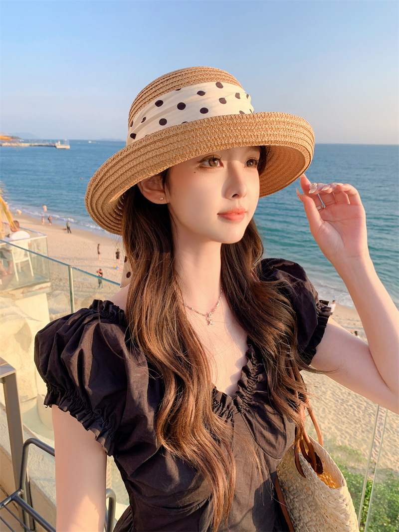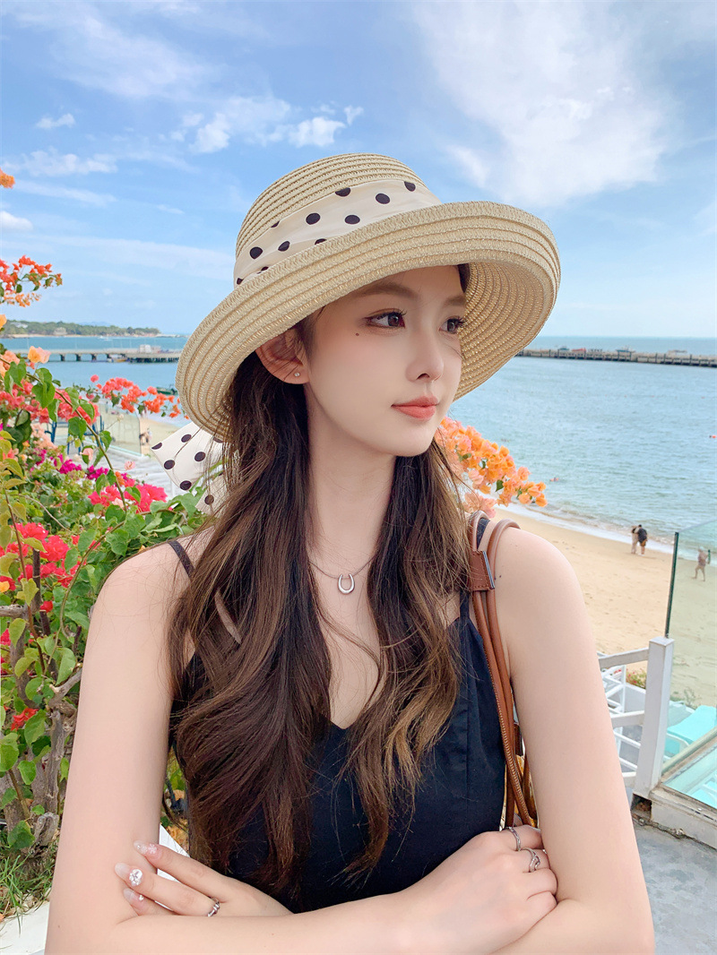 时尚甜美百搭编织草帽女海边遮阳防晒渔夫帽显脸小飘带盆帽春夏帽