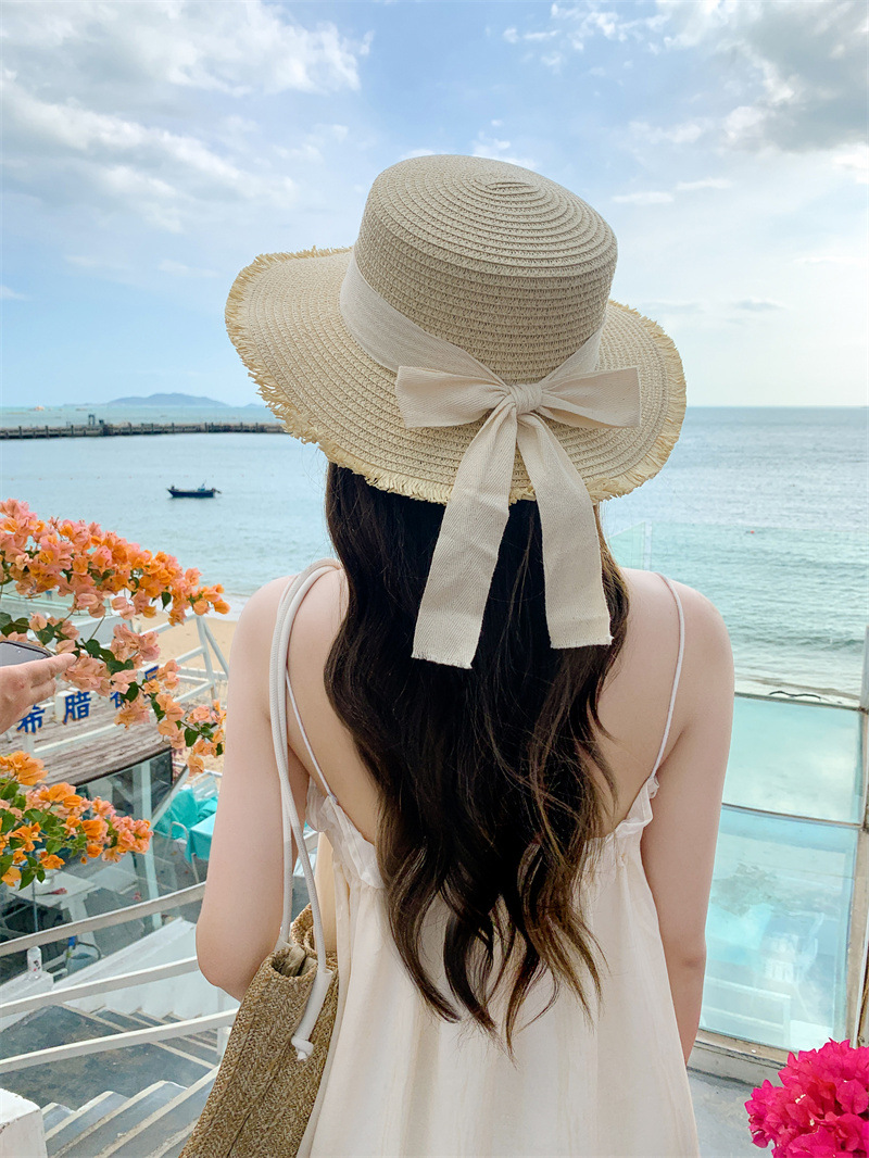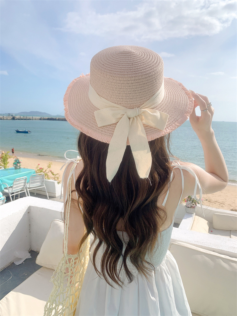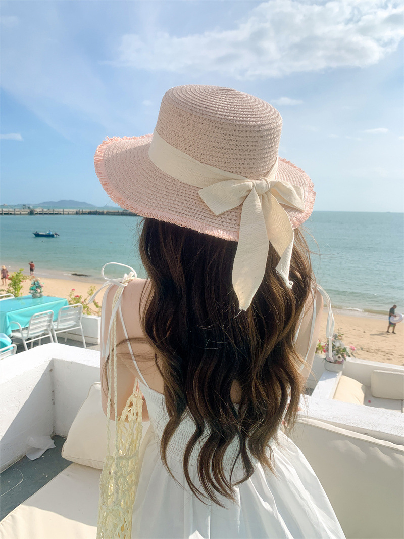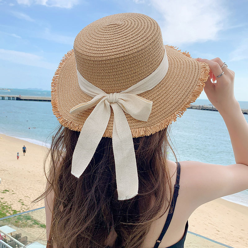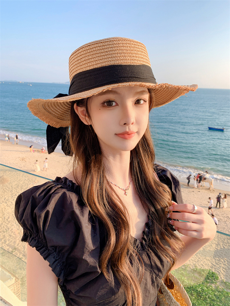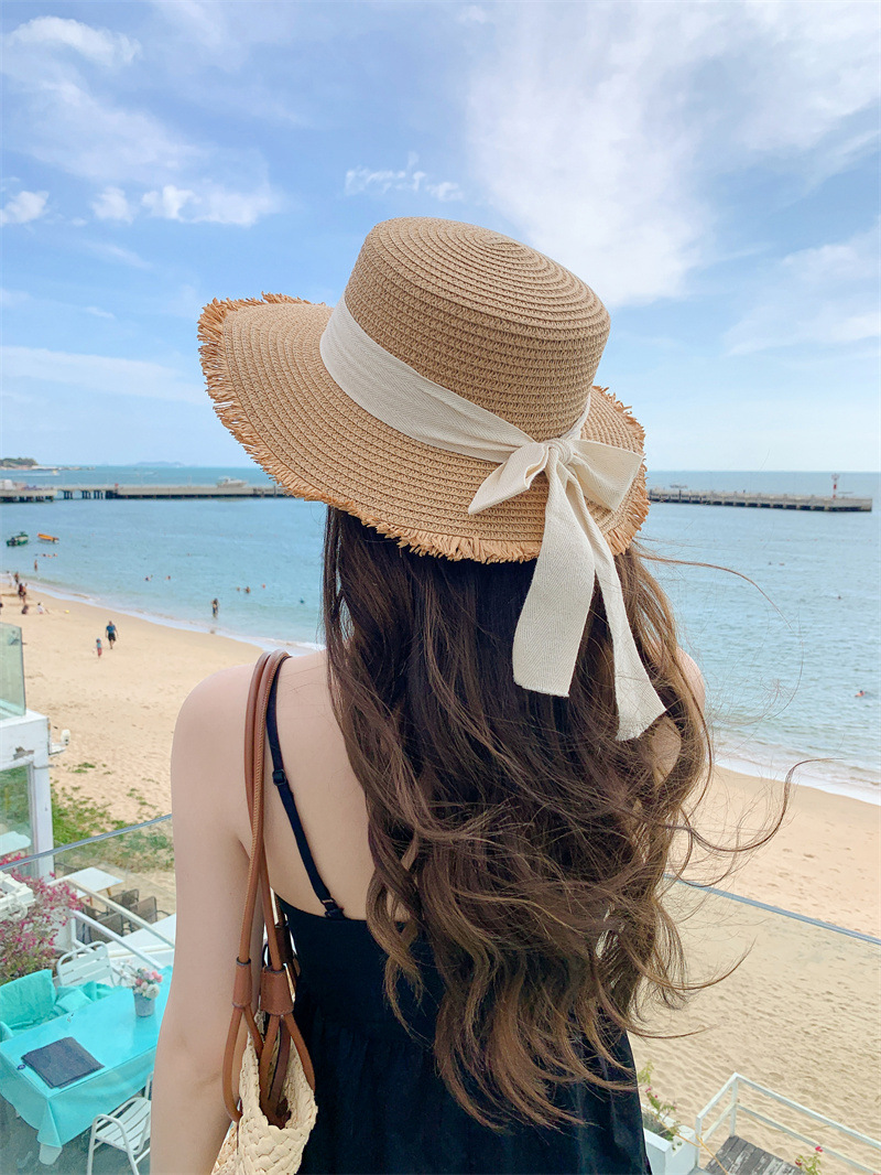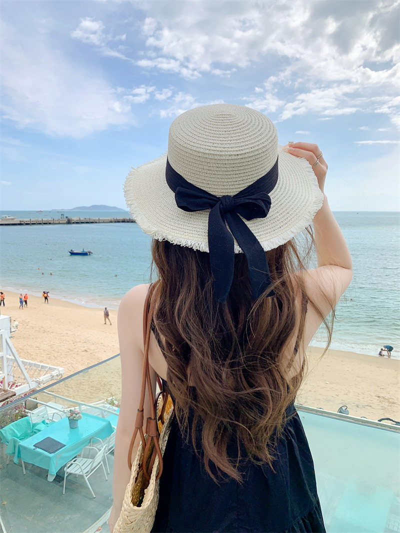 时尚帽子春夏款女时尚草帽海边度假沙滩帽平顶麻飘带蝴蝶结凉帽潮