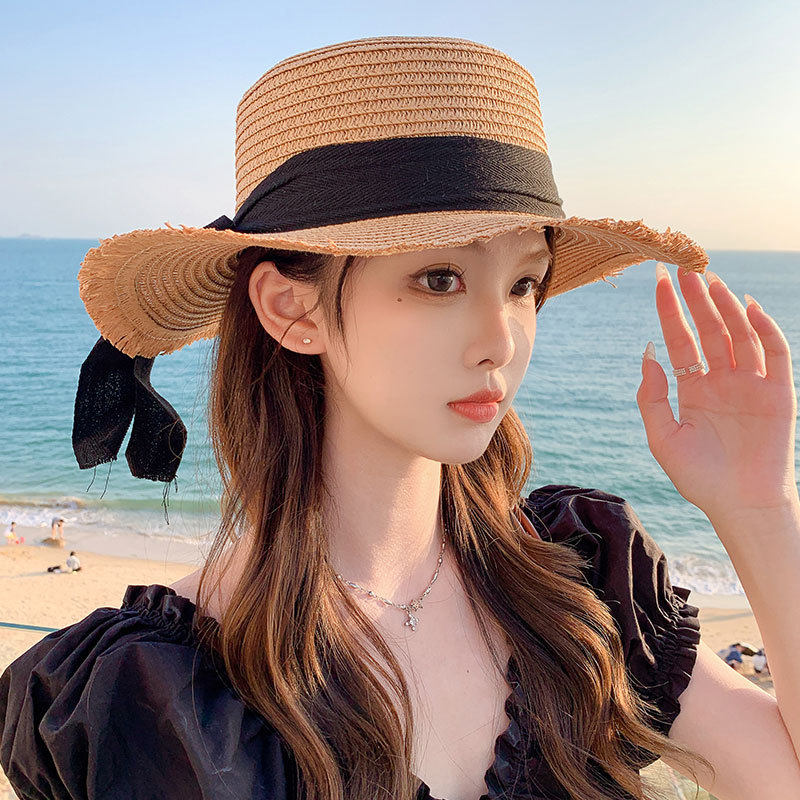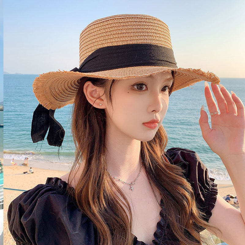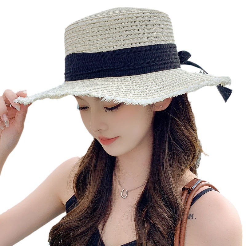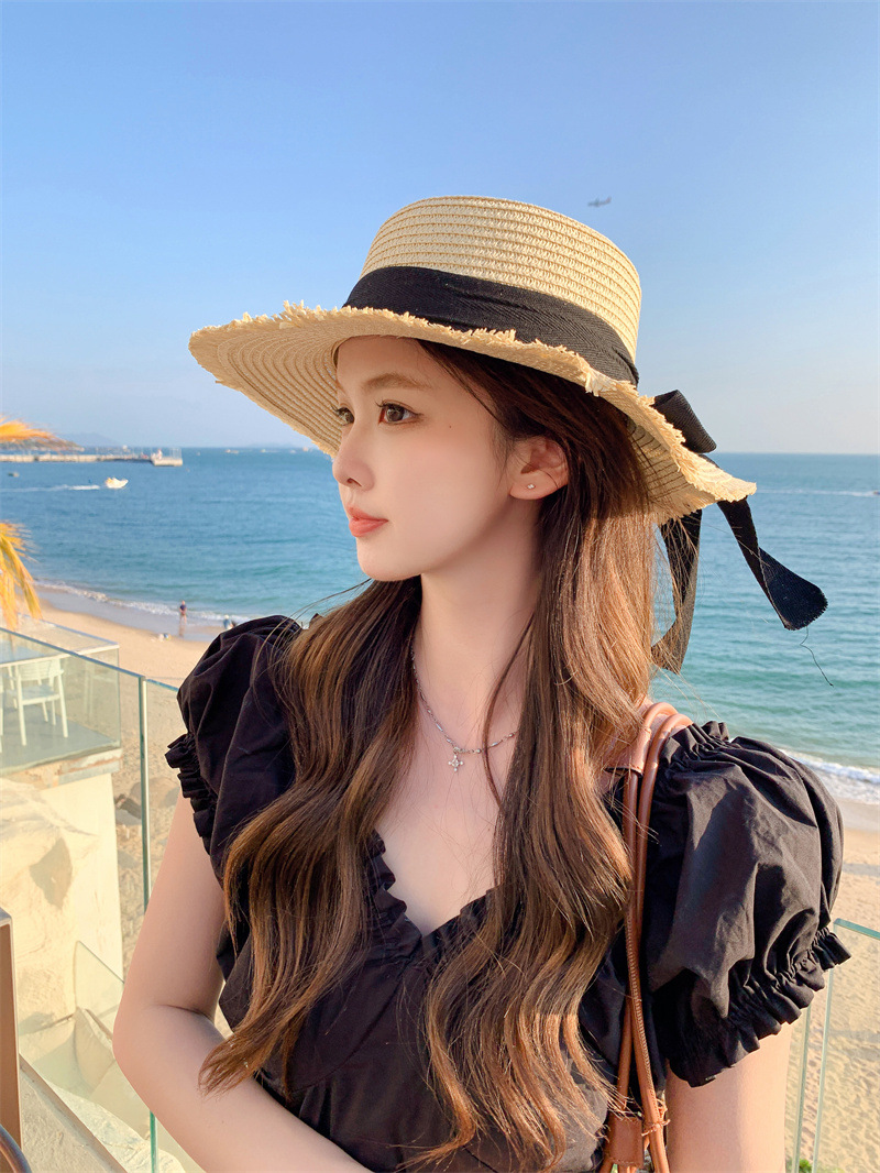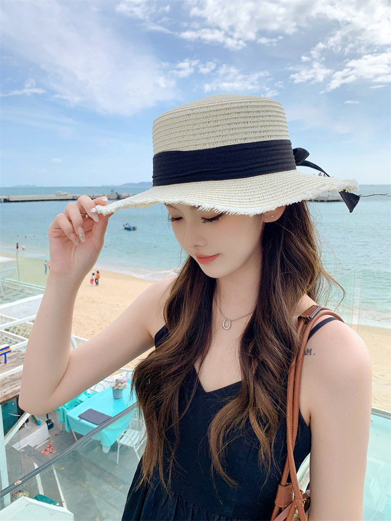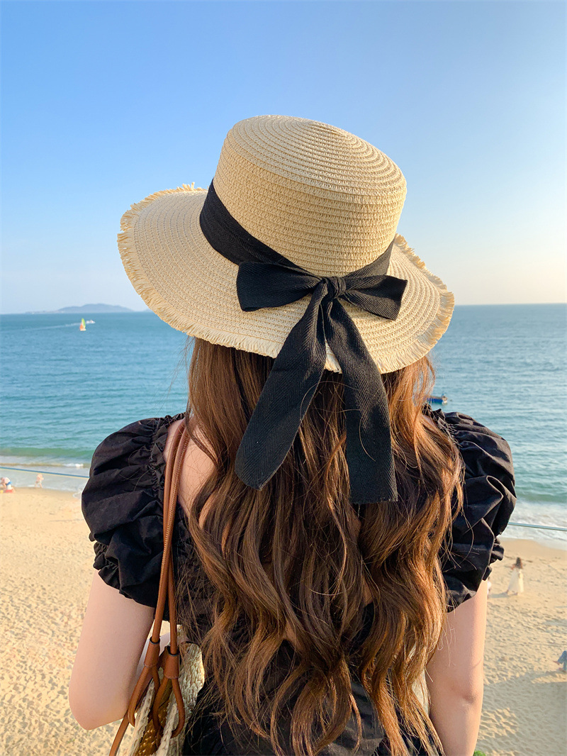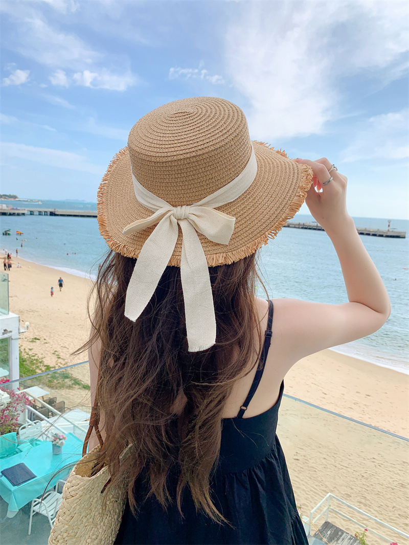 时尚帽子春夏款女时尚草帽海边度假沙滩帽平顶麻飘带蝴蝶结凉帽潮
