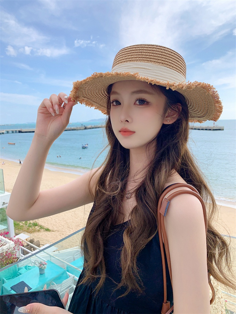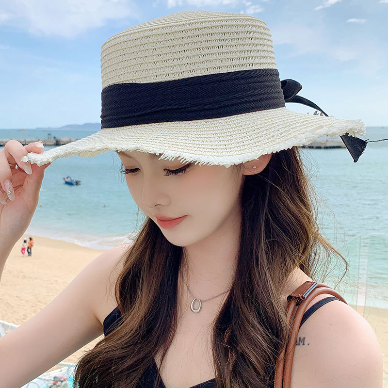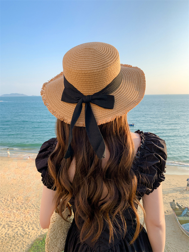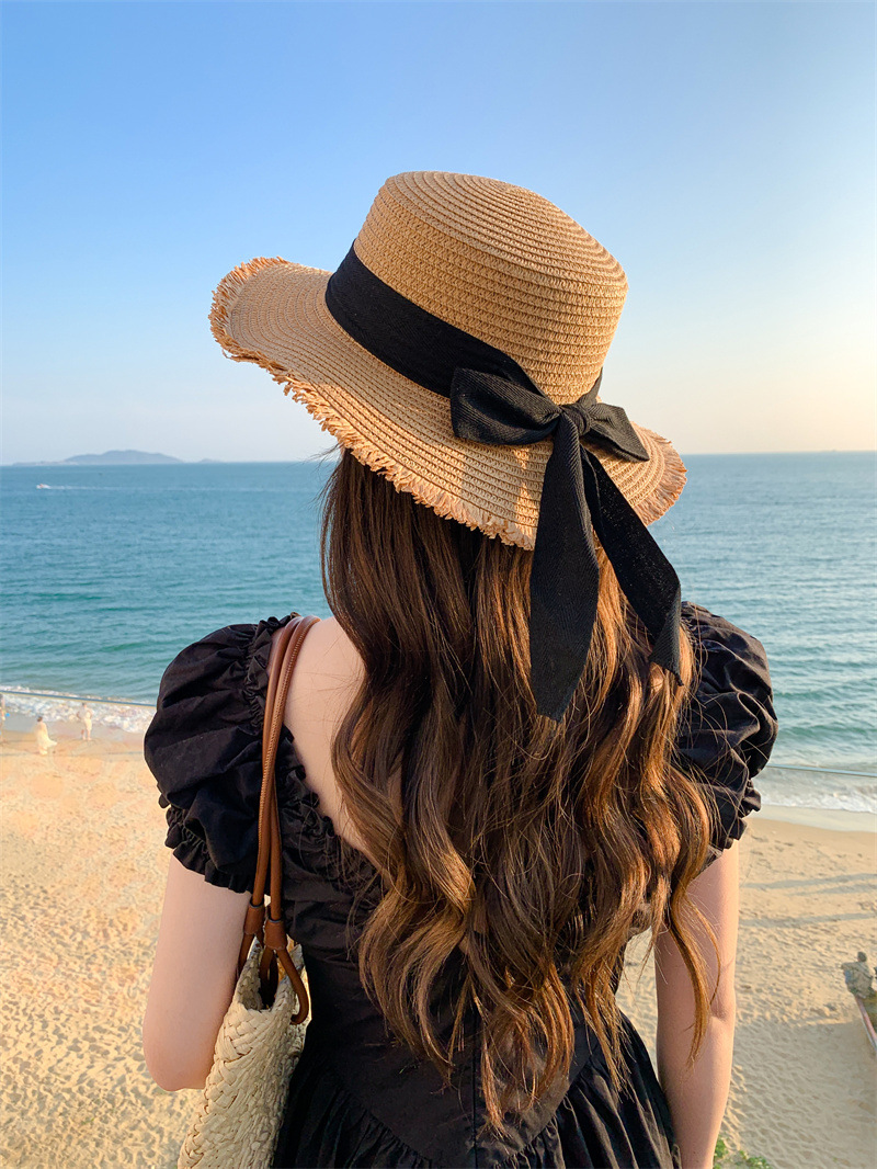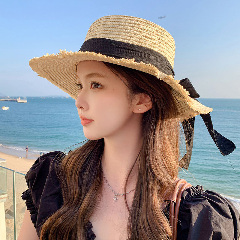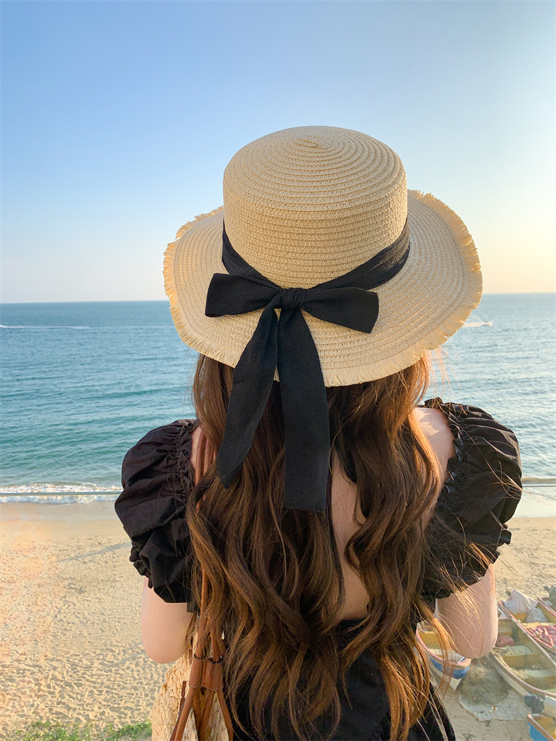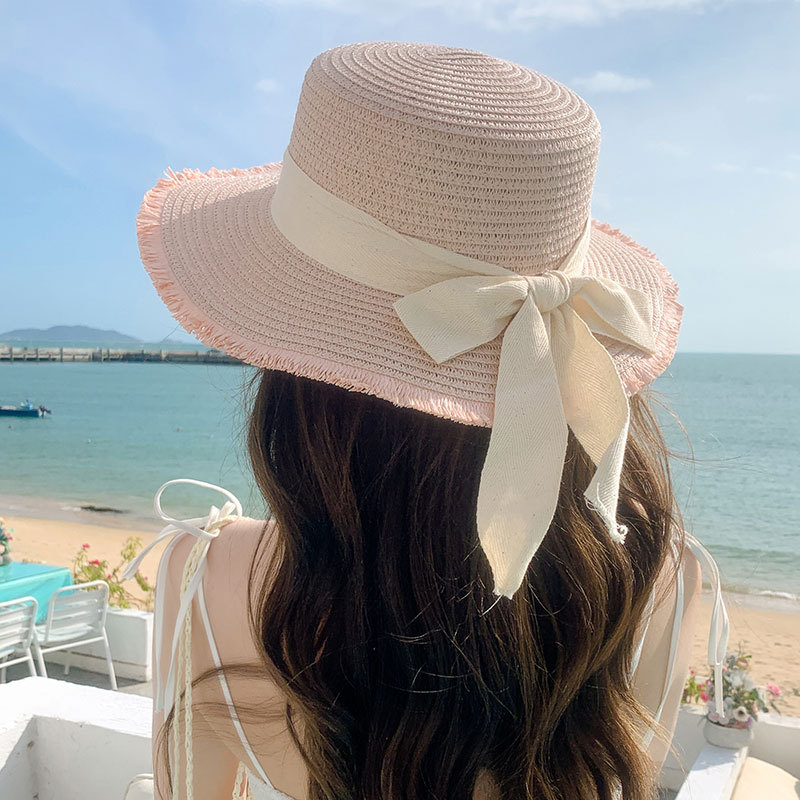时尚帽子春夏款女时尚草帽海边度假沙滩帽平顶麻飘带蝴蝶结凉帽潮