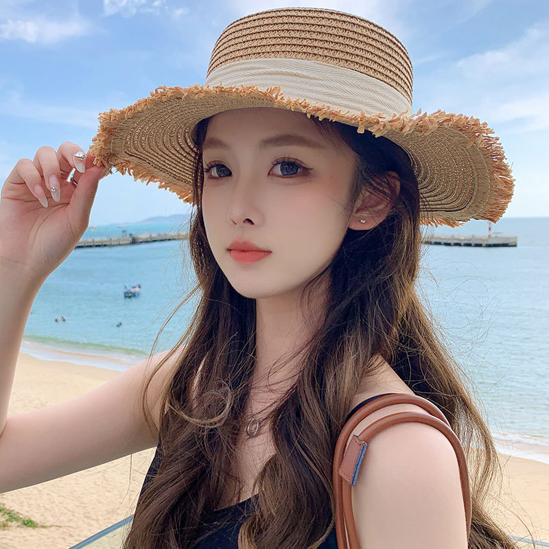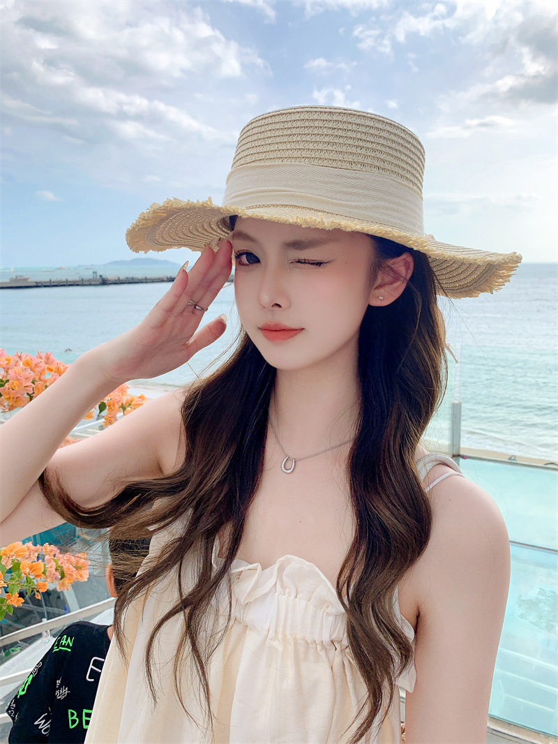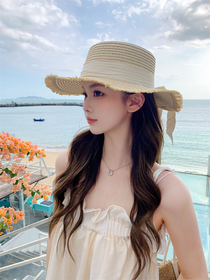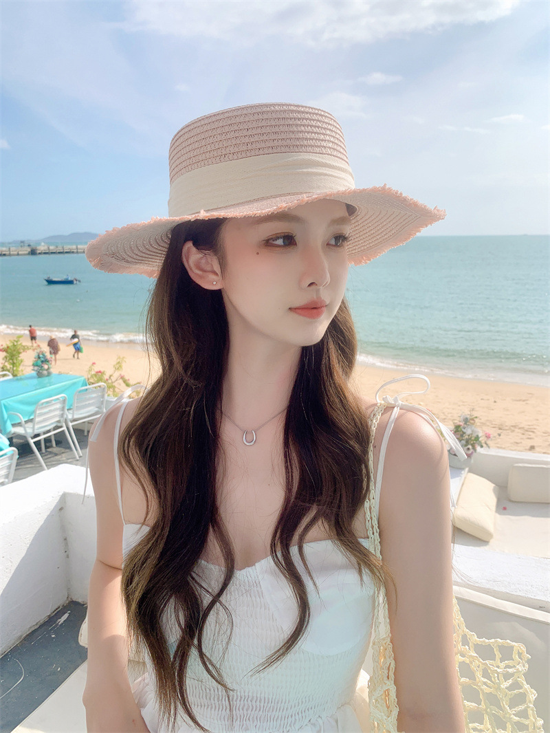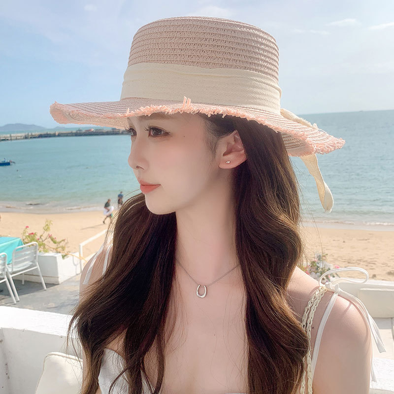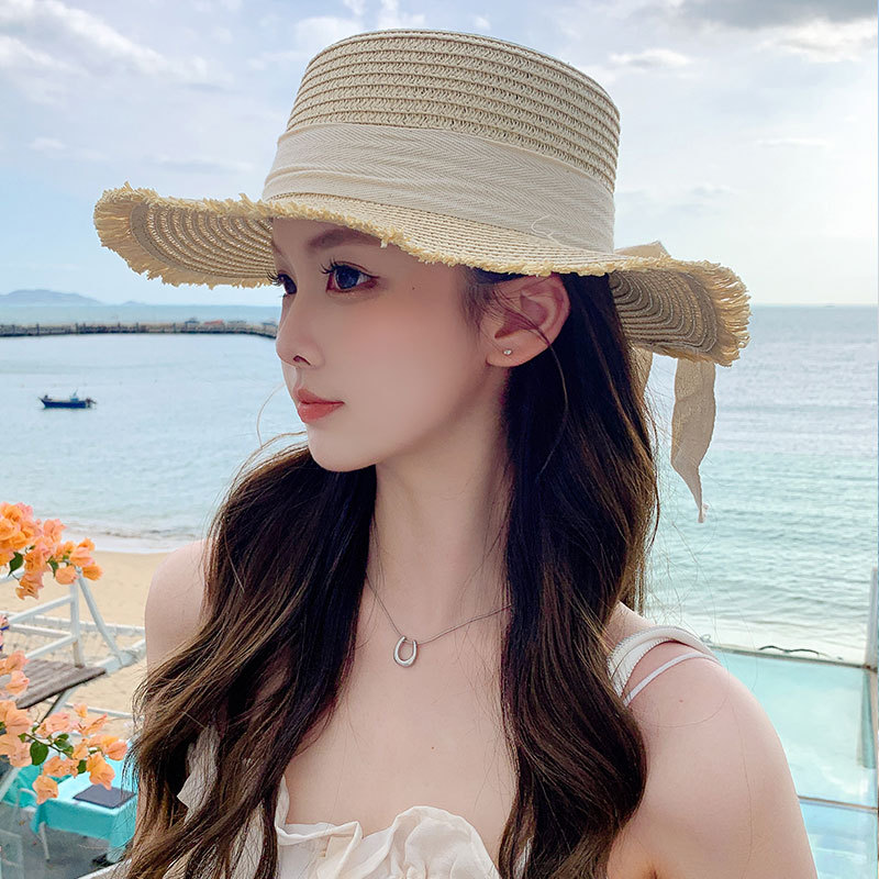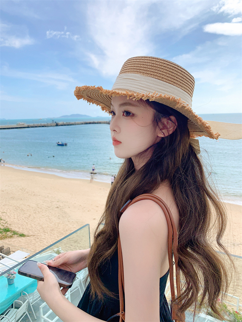 时尚帽子春夏款女时尚草帽海边度假沙滩帽平顶麻飘带蝴蝶结凉帽潮