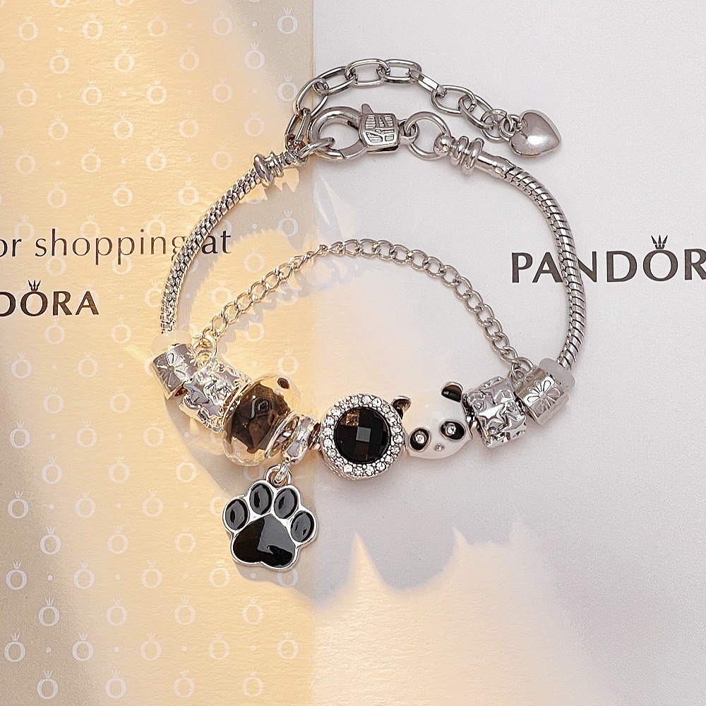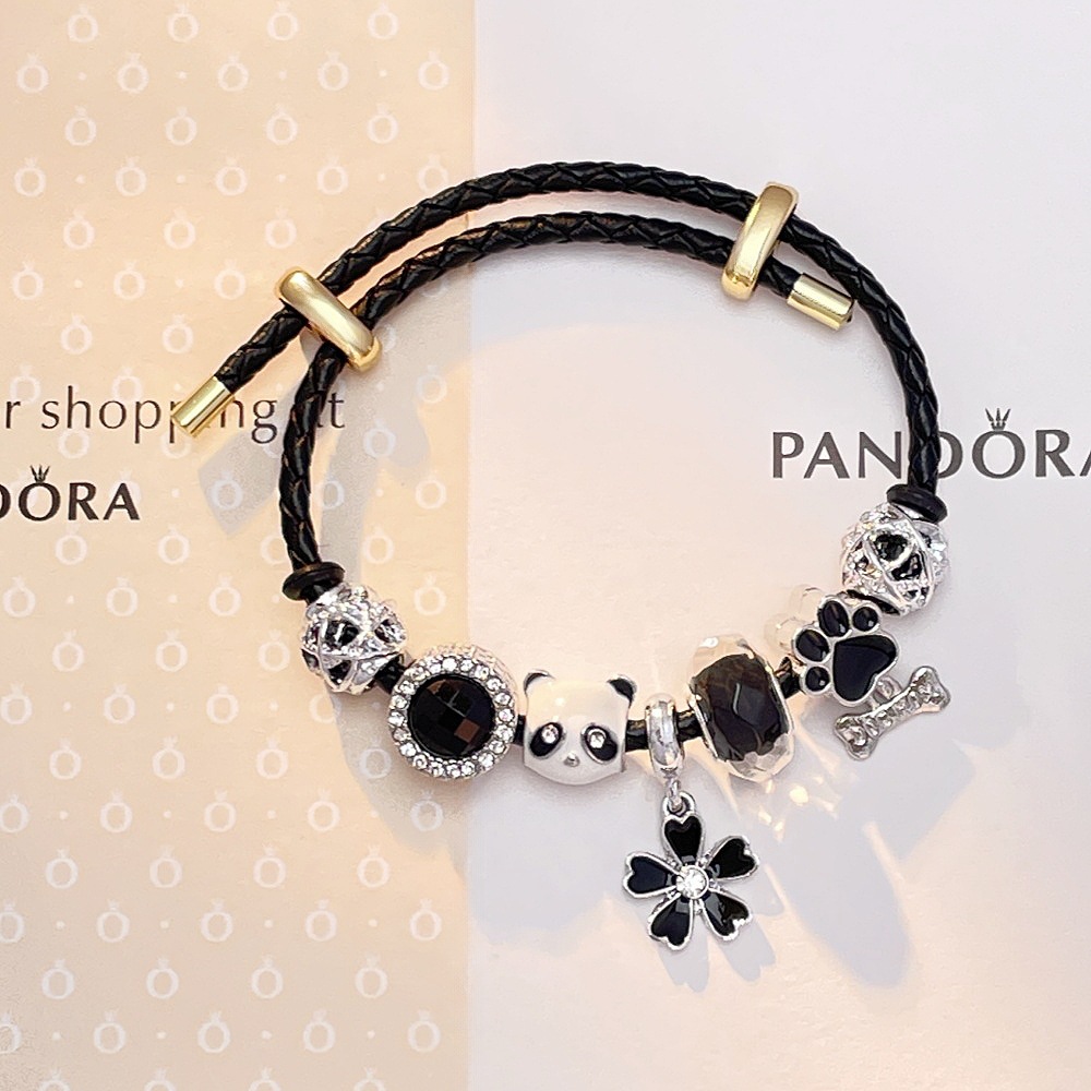 潘多熊猫拉手链可拆卸DIY手链皮绳手串可爱卡通手饰四叶草首饰女