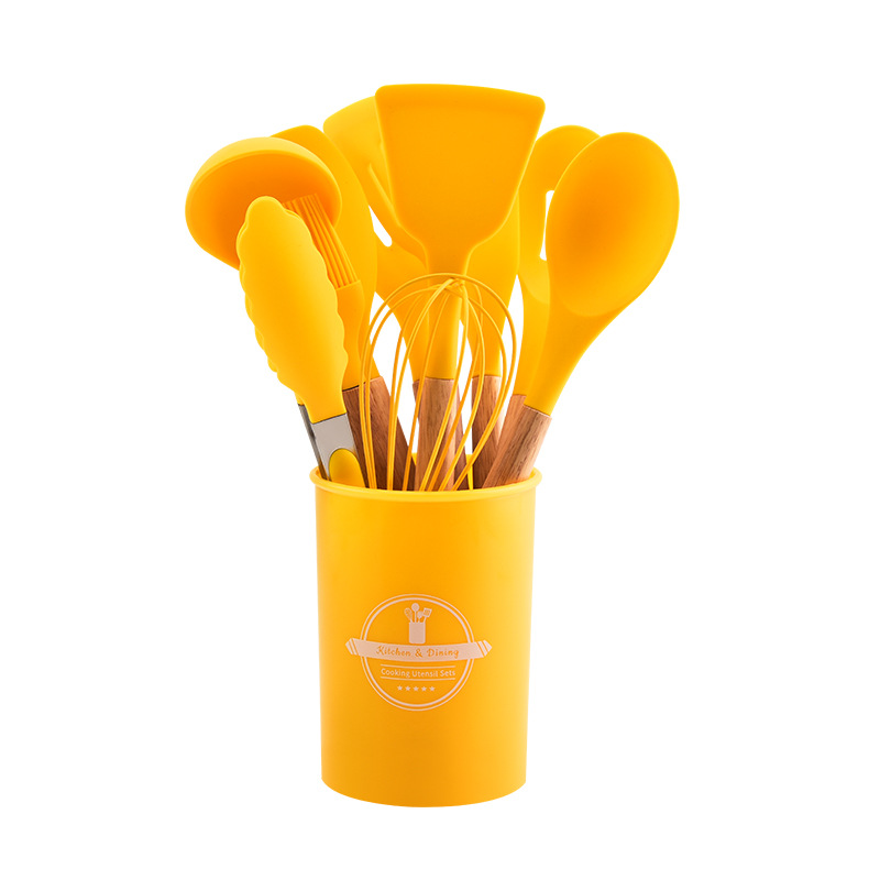木柄硅胶厨具十一件套烹饪不粘锅厨具套装收纳桶装硅胶厨具12件套
