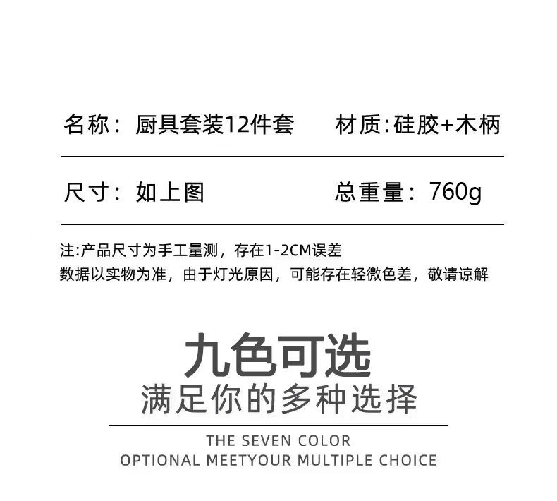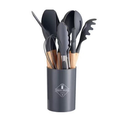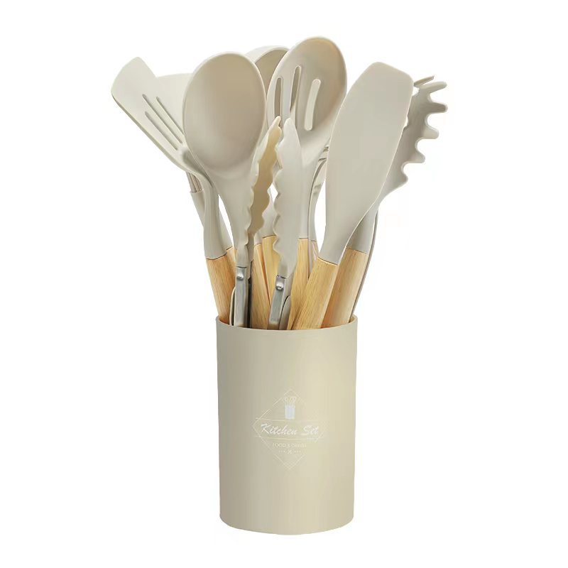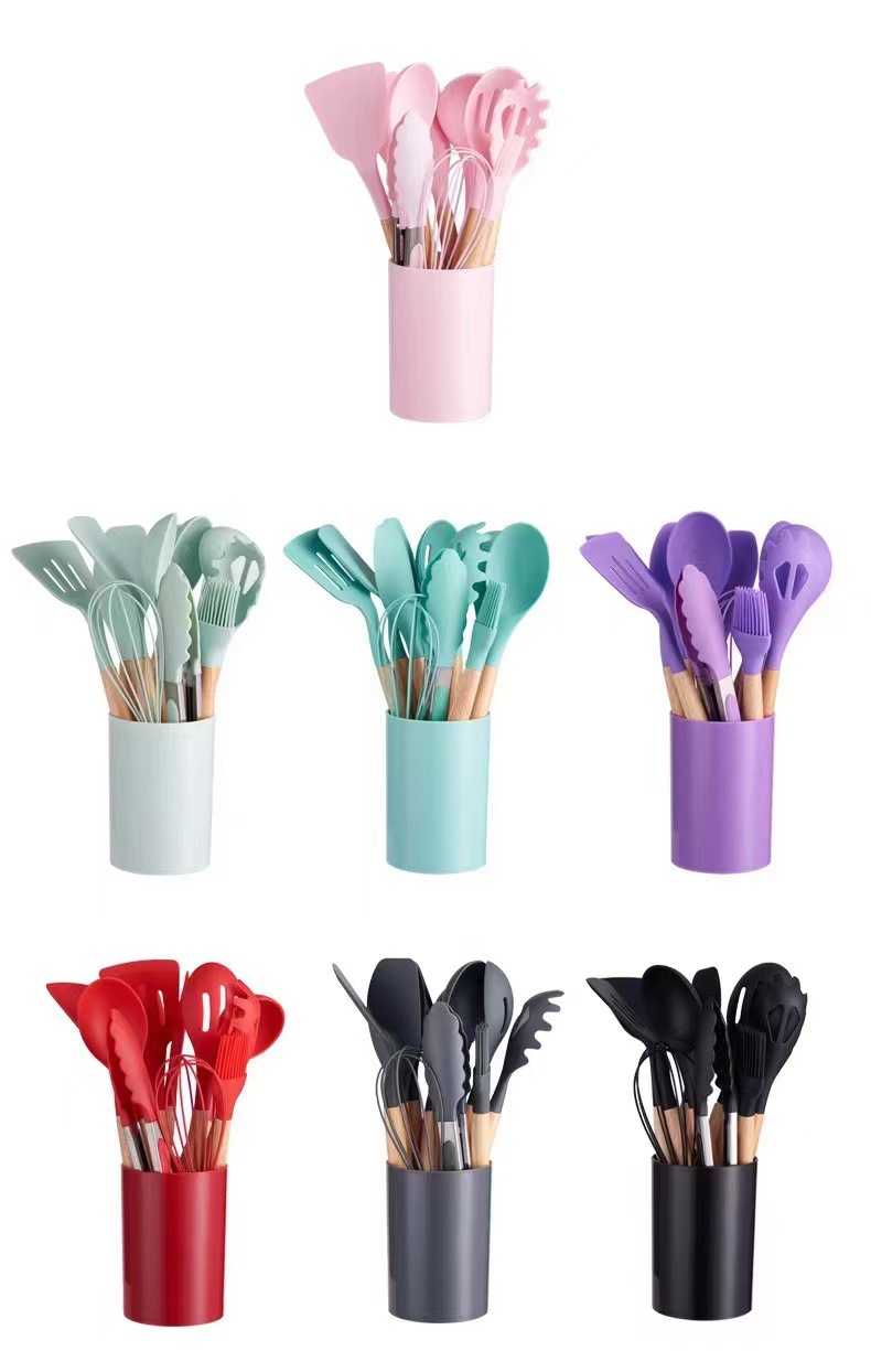 烹饪不粘锅收纳桶装木柄硅胶厨具12件套 硅胶厨具十一件套装