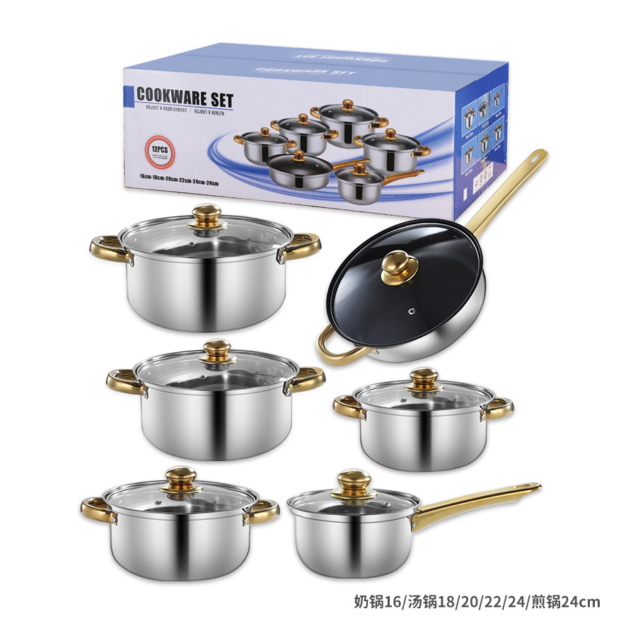 跨境外贸加厚不锈钢锅套装锅汤锅奶锅煎锅带水壶12件套墨西哥印尼